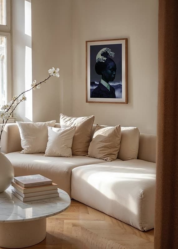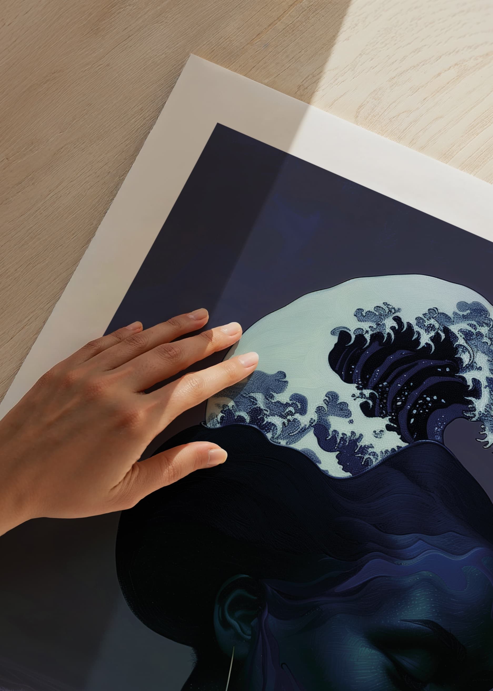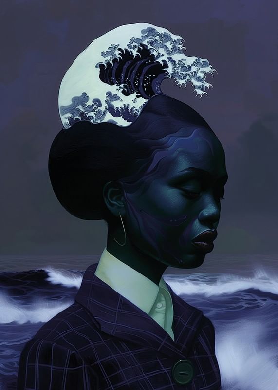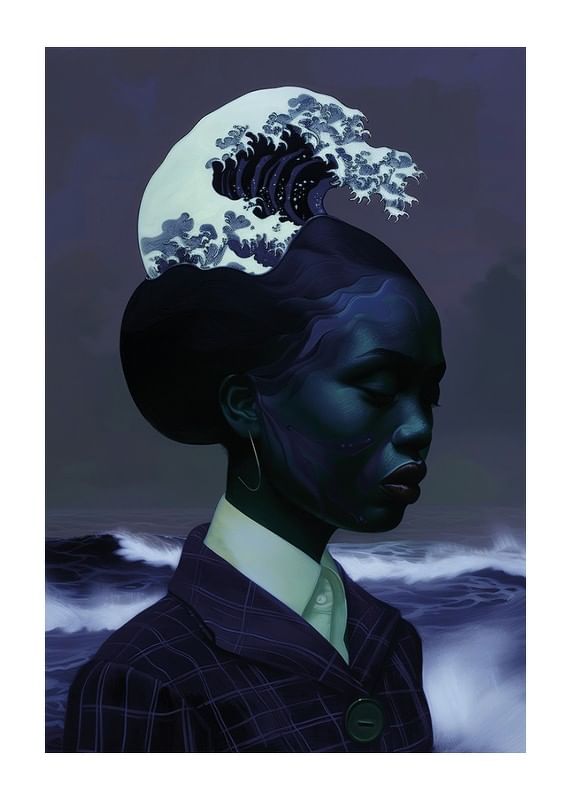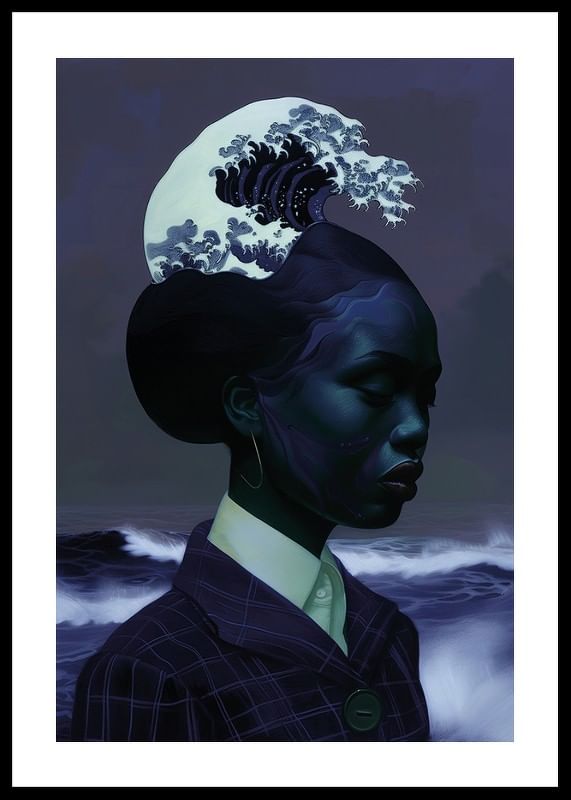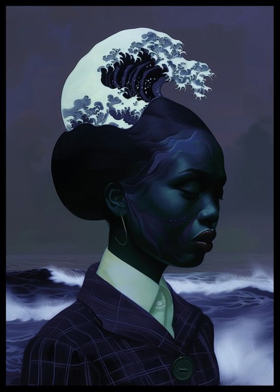 Consider this poster that captures an elegant symbiosis between a human silhouette and the dramatic waves of the ocean. The sublime blue color scheme and wavy hair create a sense of deep tranquility and harmony.