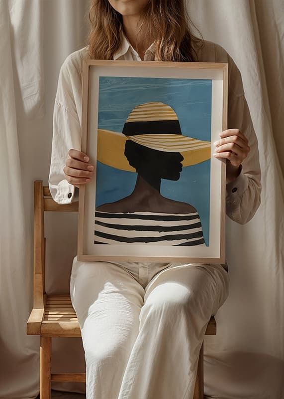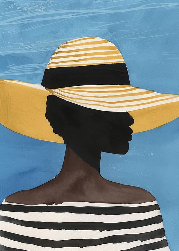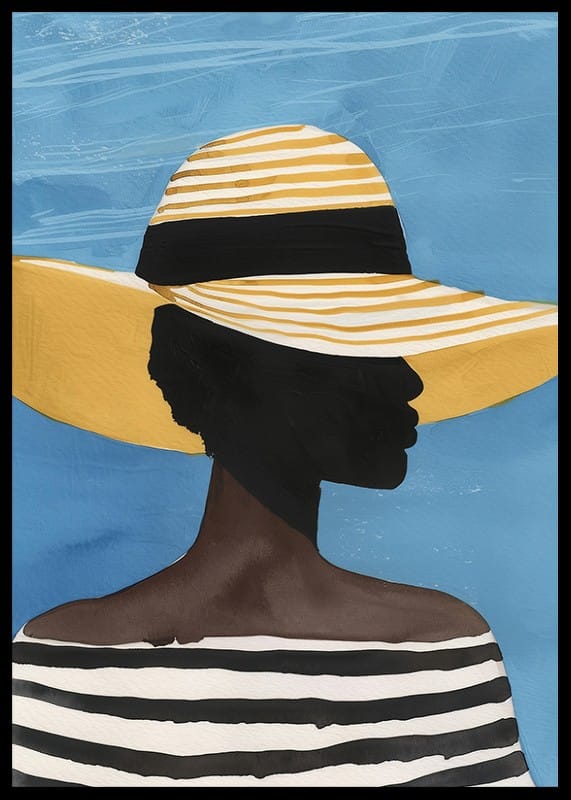 This stunning poster catches the eye with its sophisticated silhouette against a clear blue sky. The expressive figure, dressed in a striped top and wide-brimmed hat, exudes the beauty and elegance of summer.