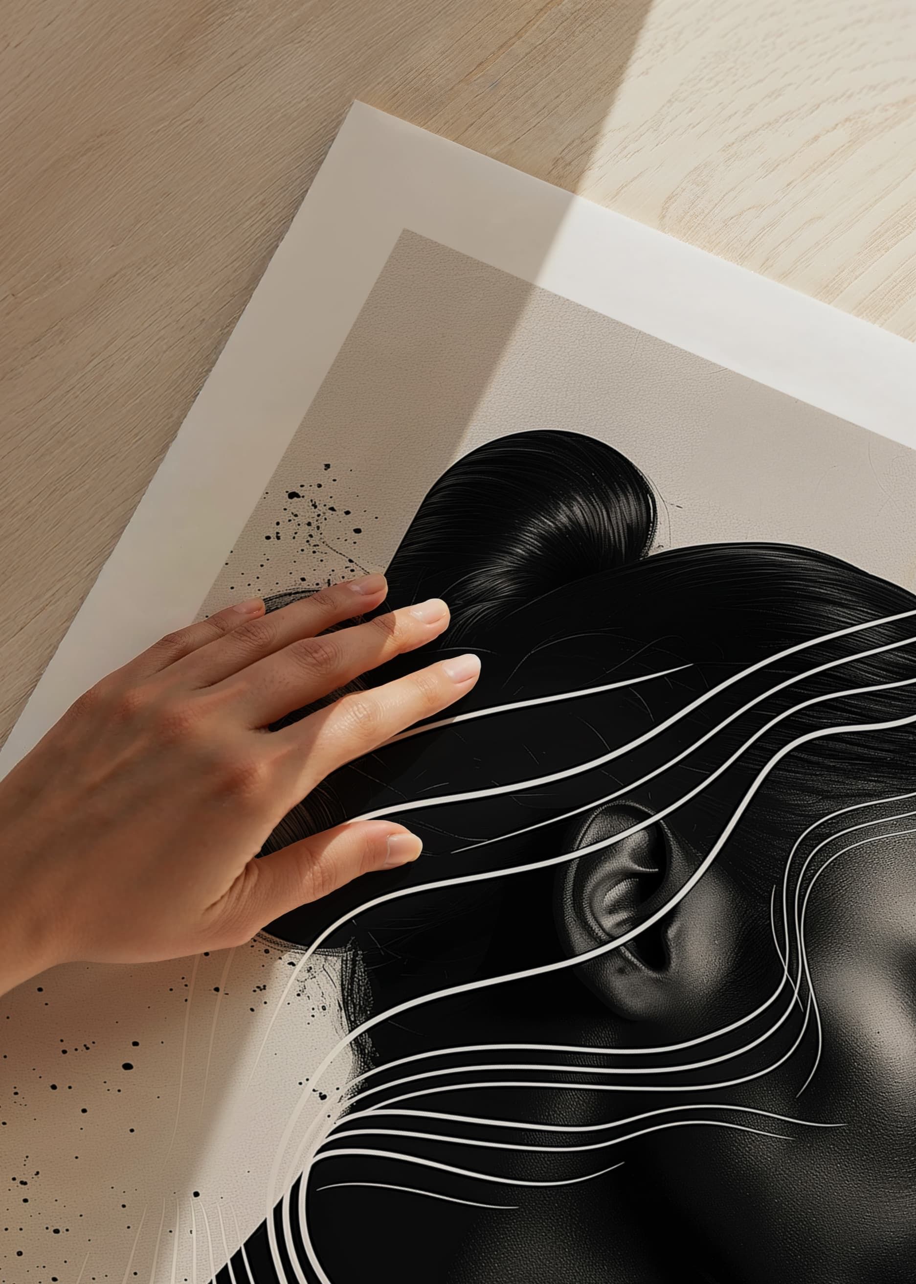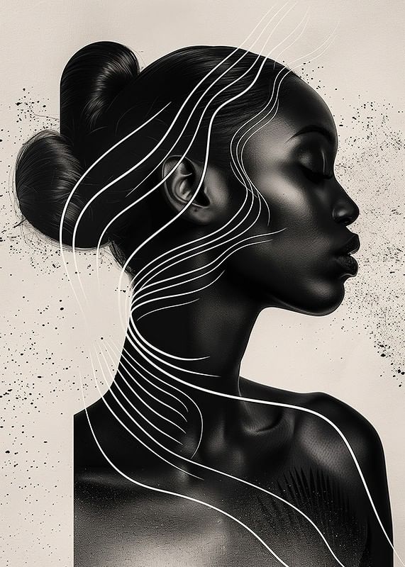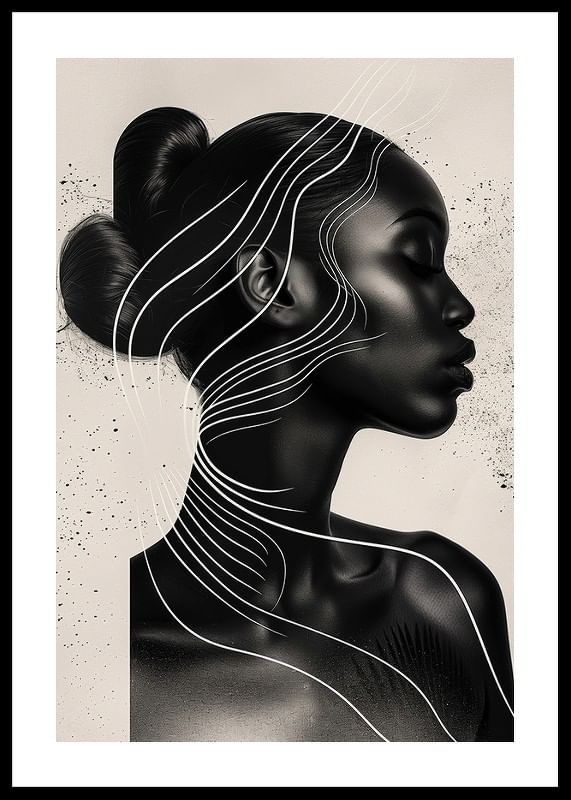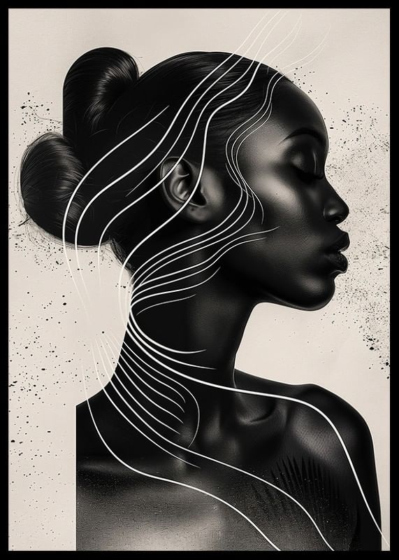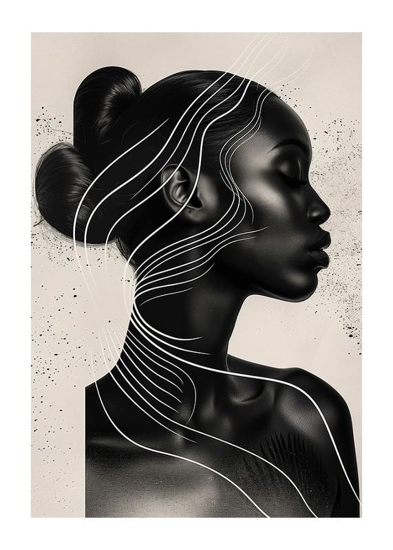 This poster captures an elegant profile in a world of soft shadows and undulating lines, weaving a sense of timeless grace. With its minimalist color palette and emphasis on detail, it conveys a quiet strength and mystery.