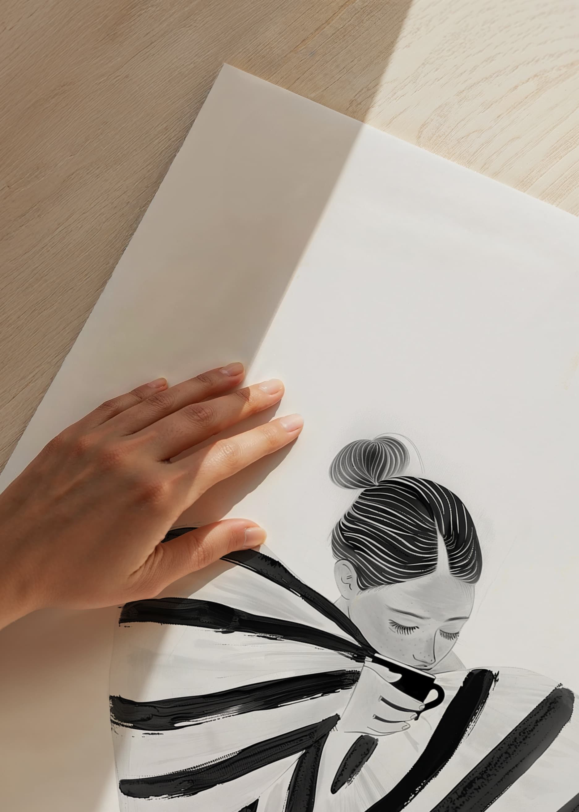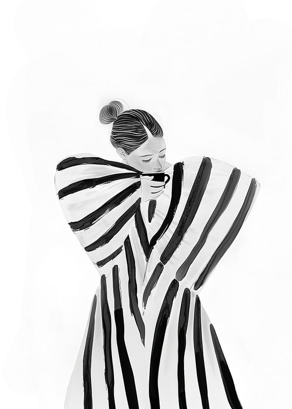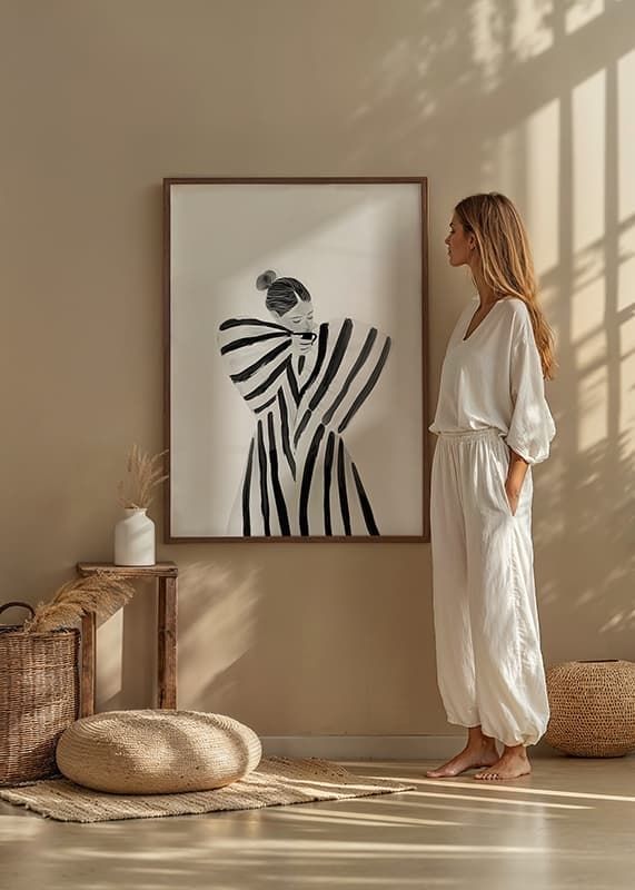 This poster catches the eye with its elegant figure dressed in distinctive black and white stripes. The contrasting simplicity of the design highlights a sense of calm and serenity. With each line, the viewer is invited into a world of introspection and style.