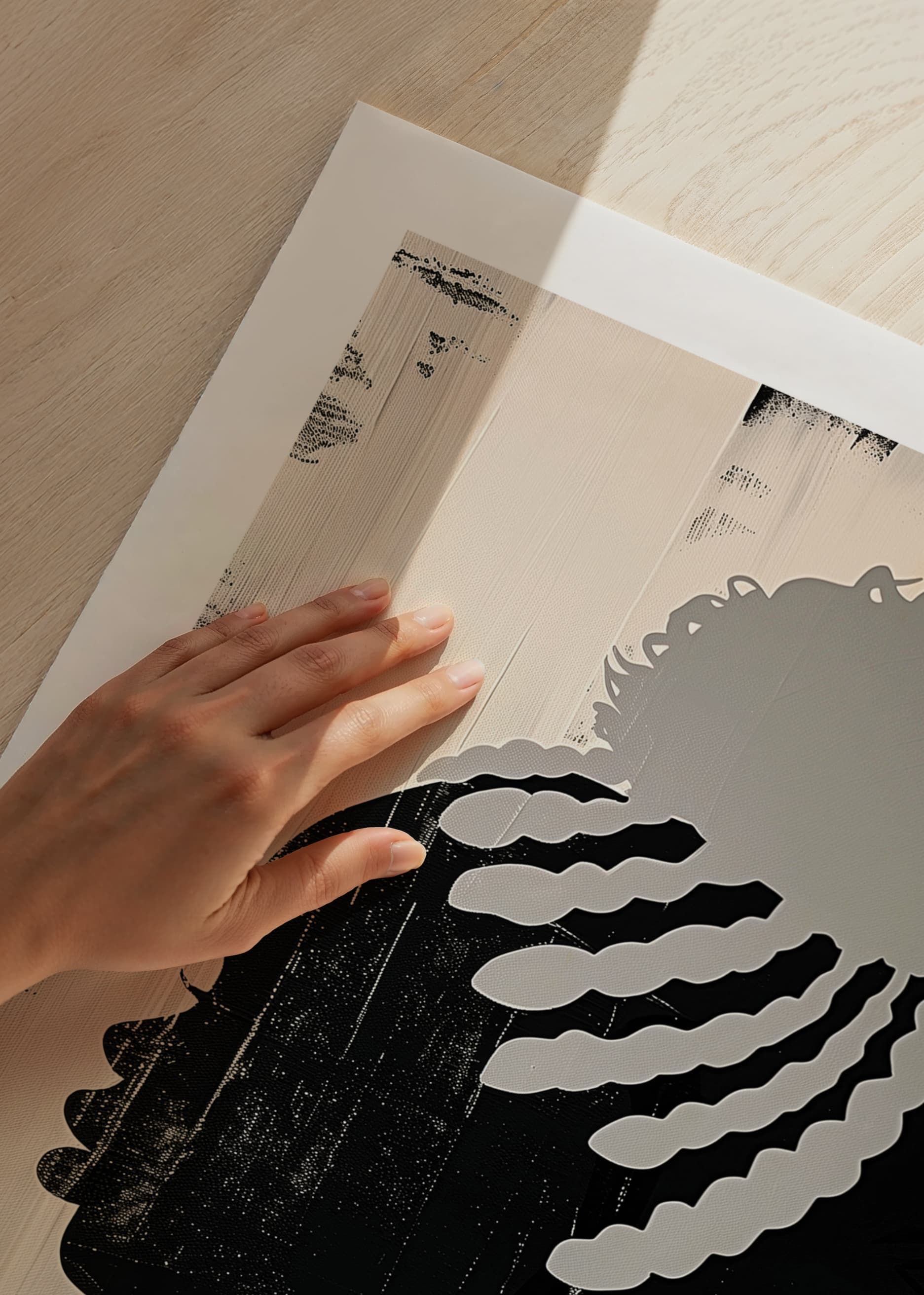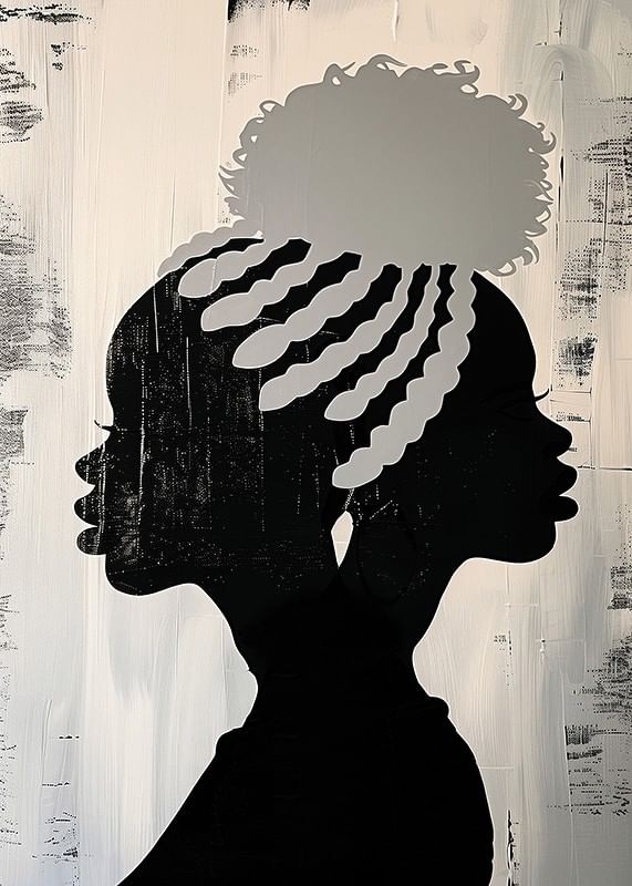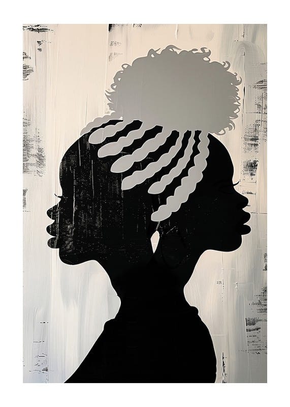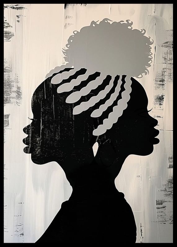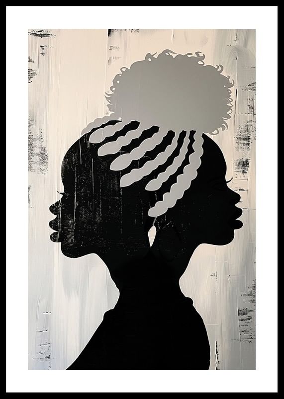 This poster captivates with two silhouettes that meet in an elegant dance of shadow and light. Each bend and curve tells a story of strength and beauty, captured in timeless contrast. The sparse background highlights the depth and style of the subject.