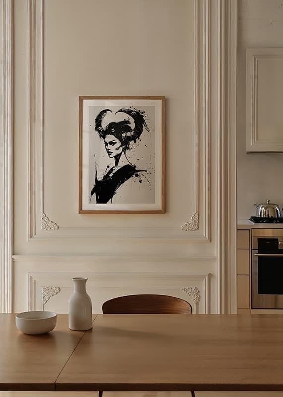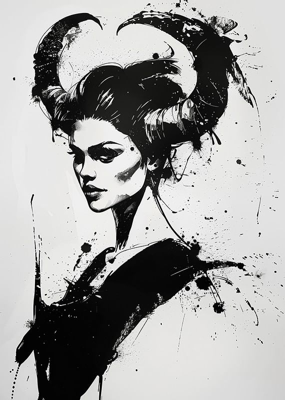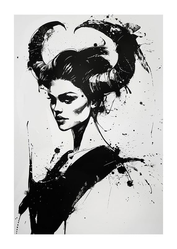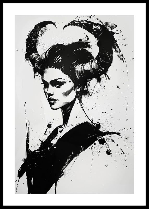 This poster immediately catches the eye with its dramatic black and white portrait. Bold brushstrokes and strong contrasts shape a mysterious figure with oversized horns, giving a sense of magic and strength.