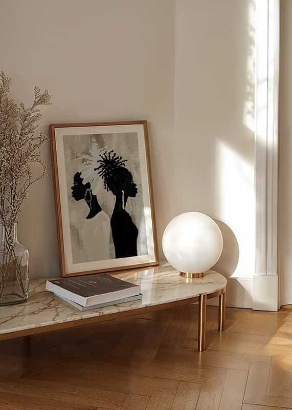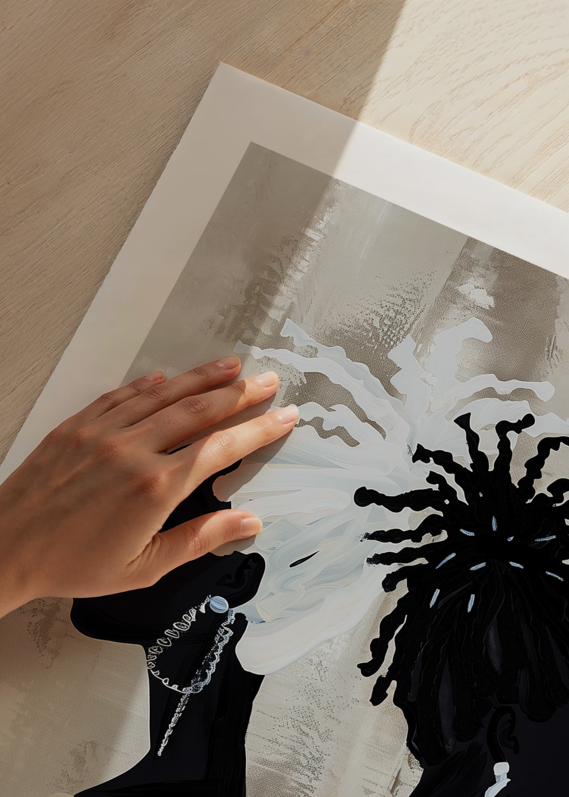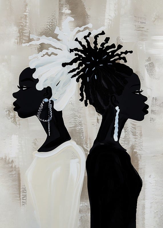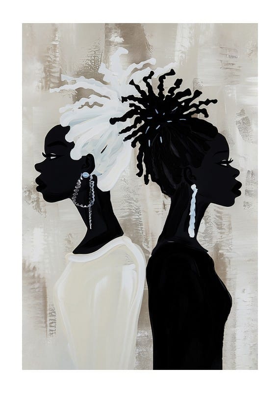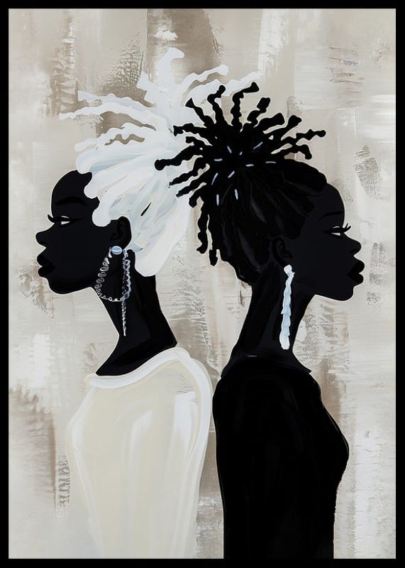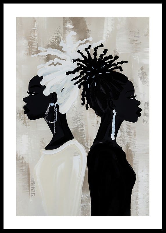 This poster captures a fascinating contrast of two profiles, where black and white merge in perfect harmony. The elegant details of the hairstyles and earrings enhance the sense of style and individuality.
