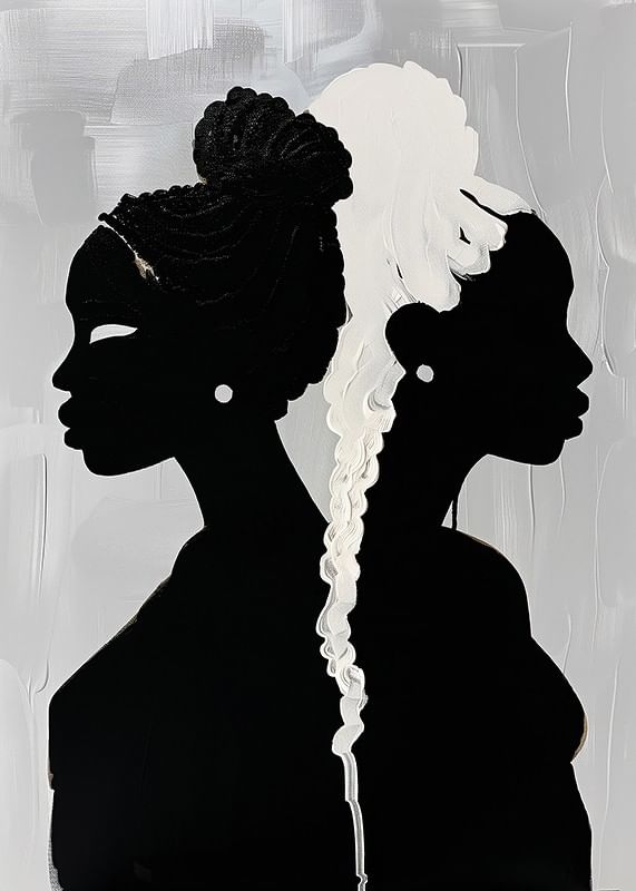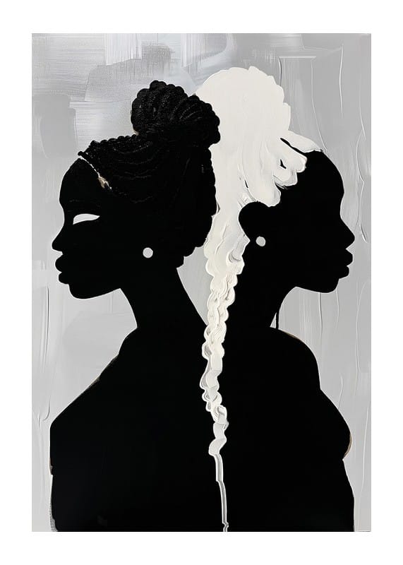 The poster captures two silhouetted profiles, one in black and one in white, placed back to back against a subtle, grey background. The graphic simplicity and contrast between the two figures create a sense of balance and duality.