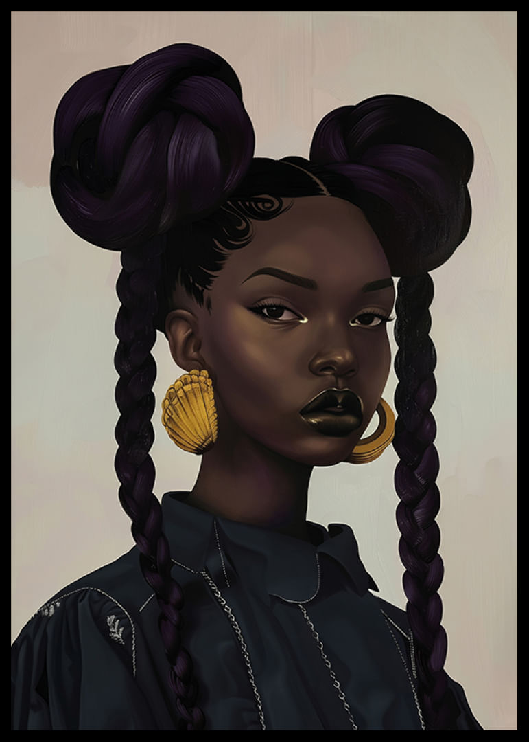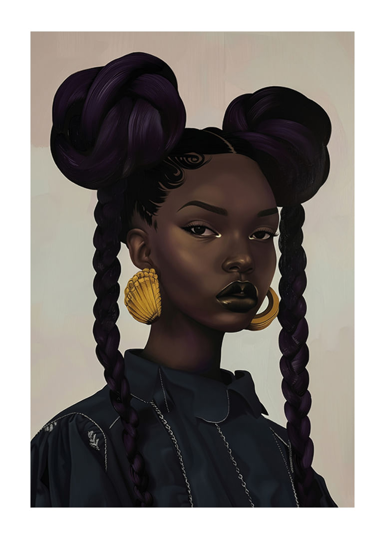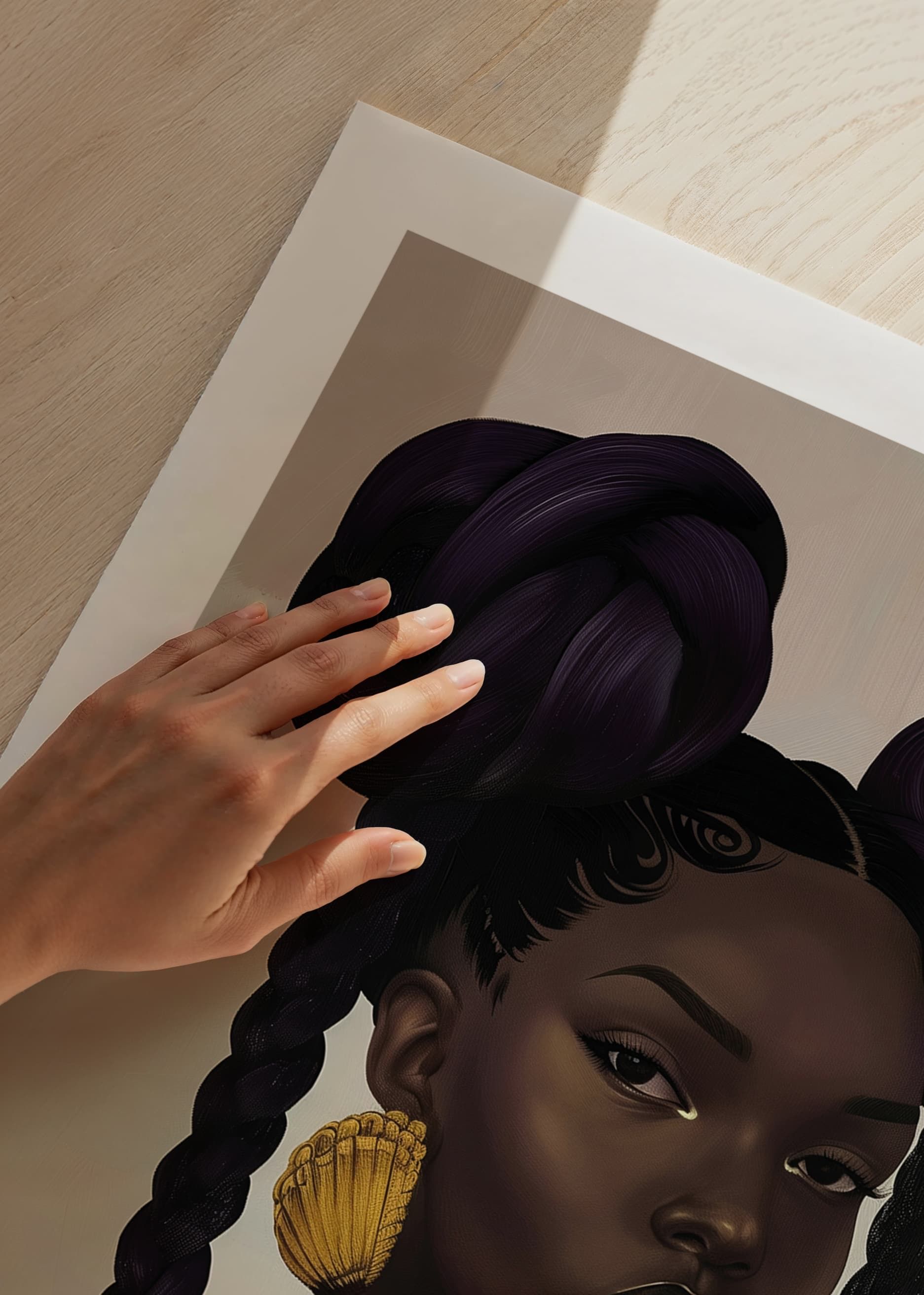 This poster immediately catches the viewer's attention with its elegant portrait. The deep tones of the hair combined with the golden earrings create a harmonious and majestic feeling. The subtle expression enhances the unique charm of the poster.