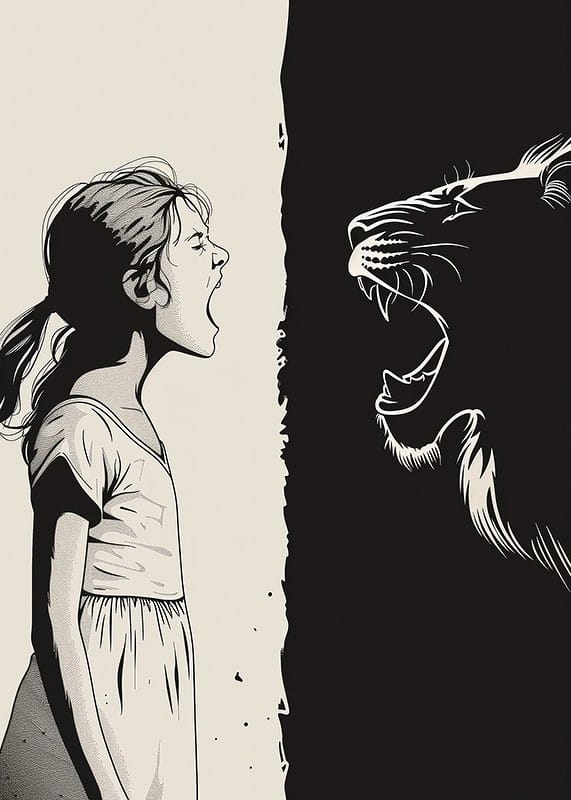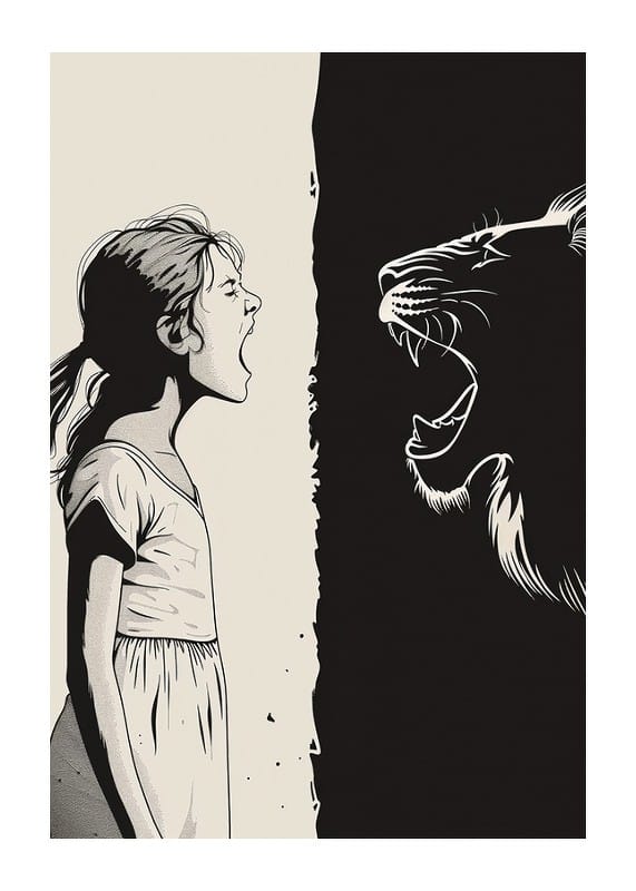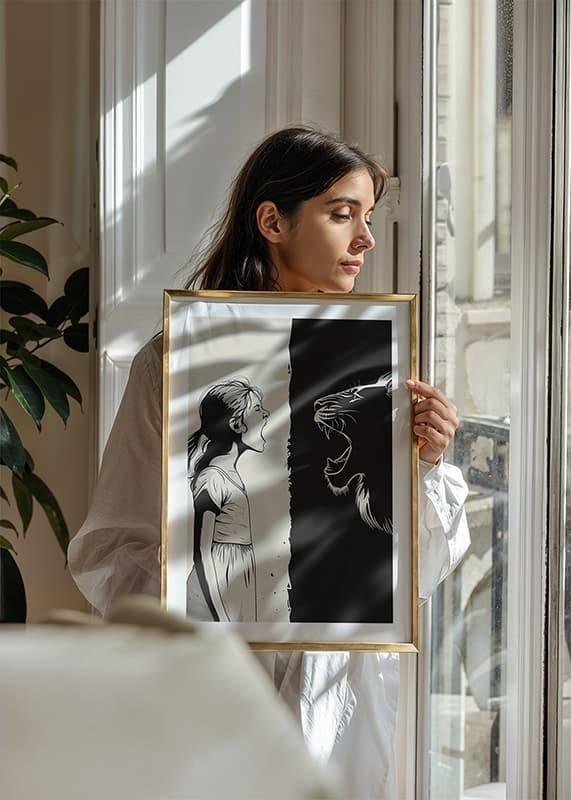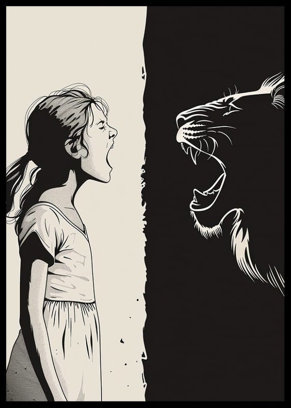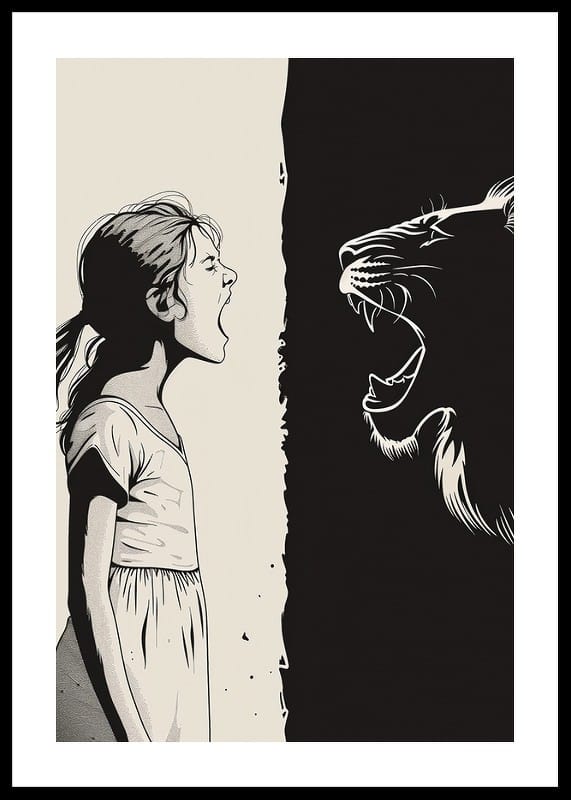 This poster captures a dramatic encounter between a young girl and a big cat, where their roars merge in a powerful symbiosis. The contrast between white and black gives a distinctive graphic style and creates a strong visual impact.
