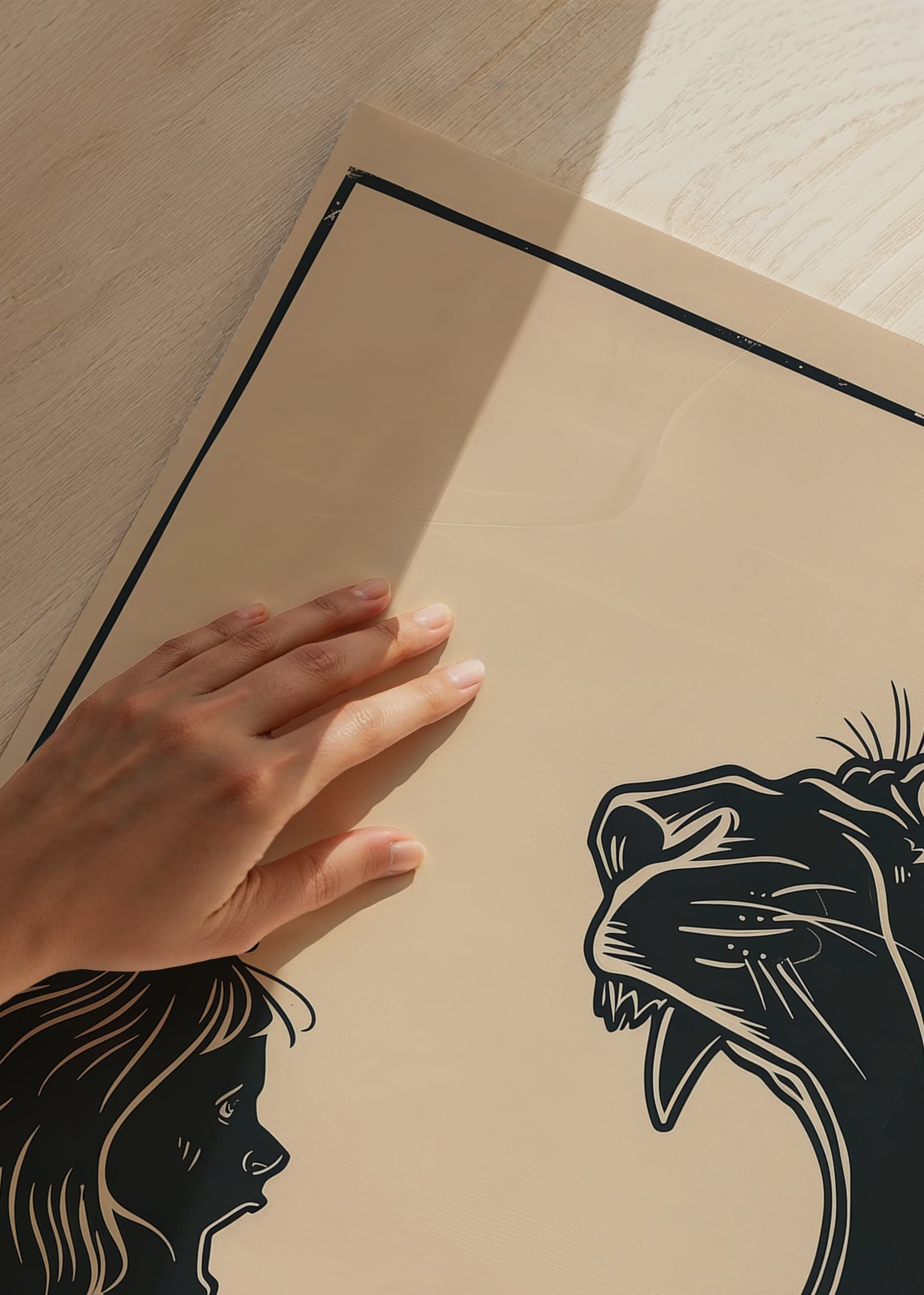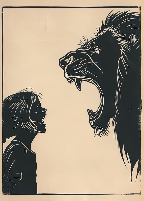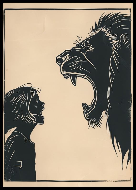 This poster captures a powerful moment where a child stands face to face with a mighty lion, their cries intertwined in a courageous expression. There is an intense sense of togetherness and courage, where the innocence of man meets the raw power of nature.