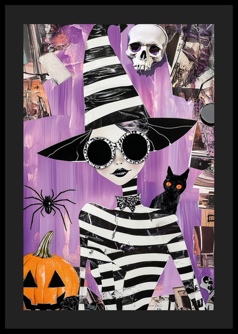 This poster immediately catches the eye with its colorful and imaginative depiction of a mysterious witch in black and white, surrounded by iconic Halloween elements such as a black cat and a grinning pumpkin.