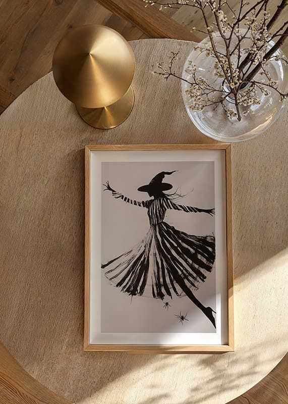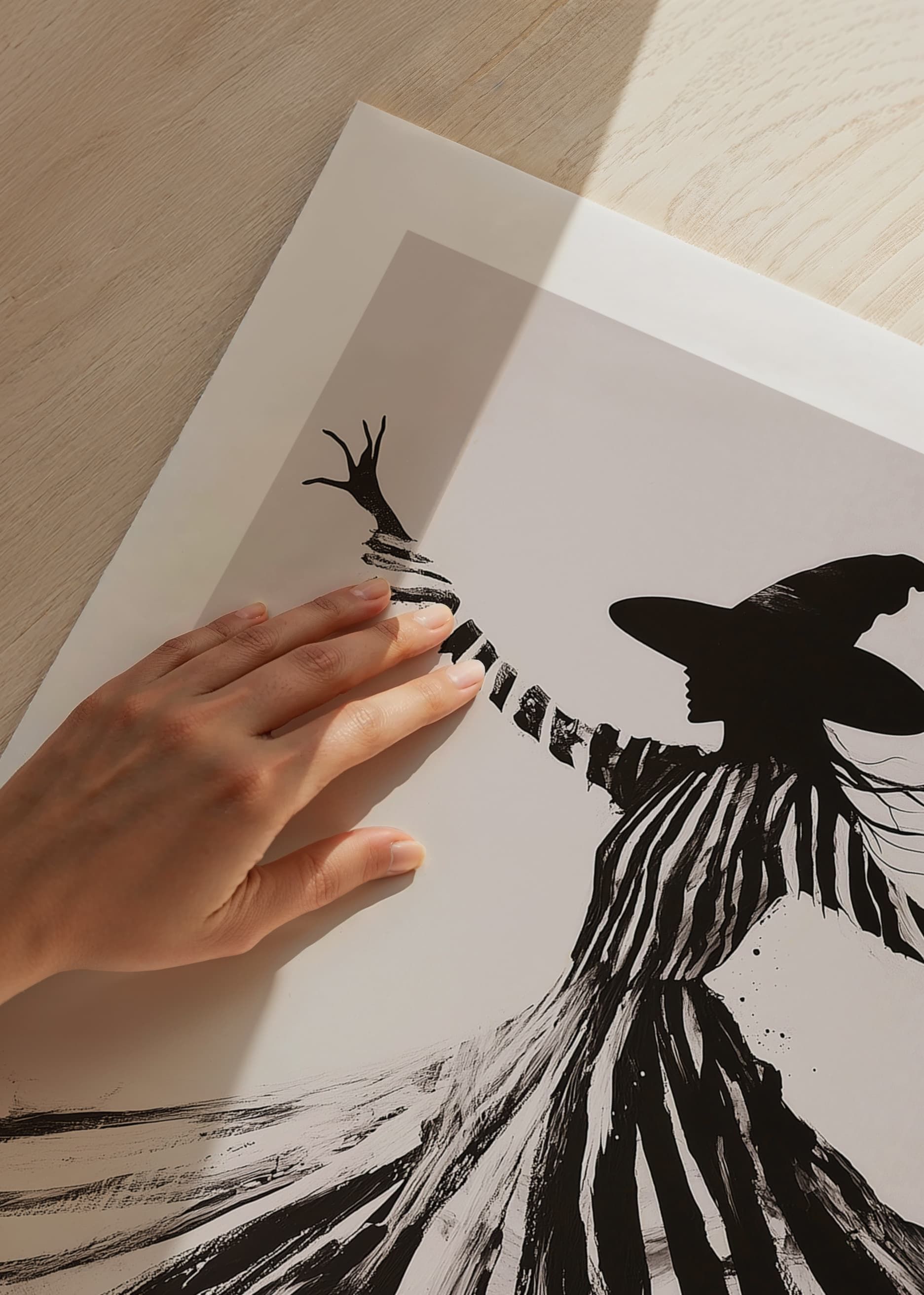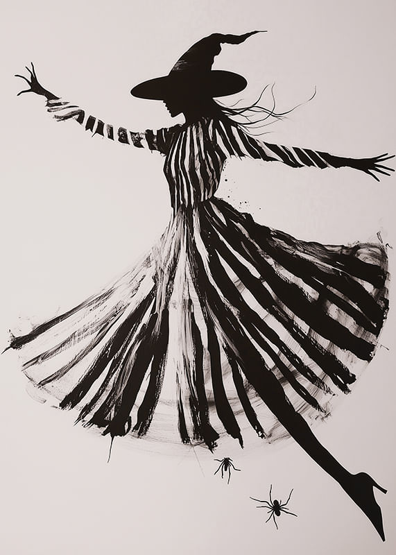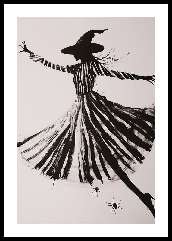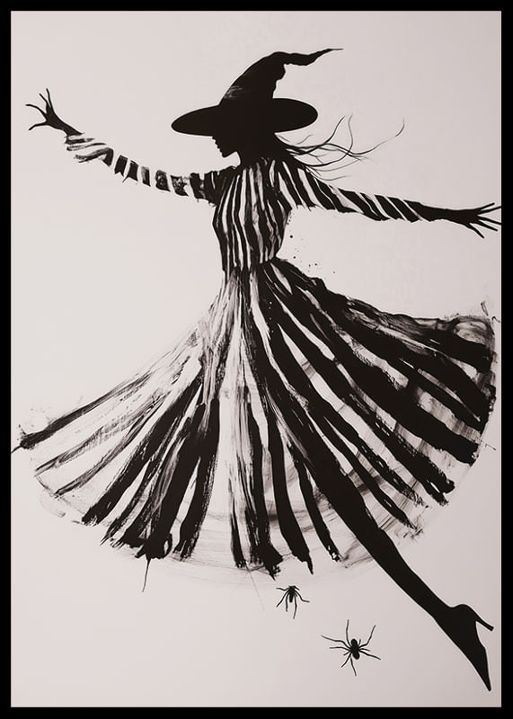 This poster captures a magical atmosphere with a silhouette of a dancing witch in black and white. The celebration of mystery and elegance is intertwined in every brushstroke and the creation of bold contrasts.