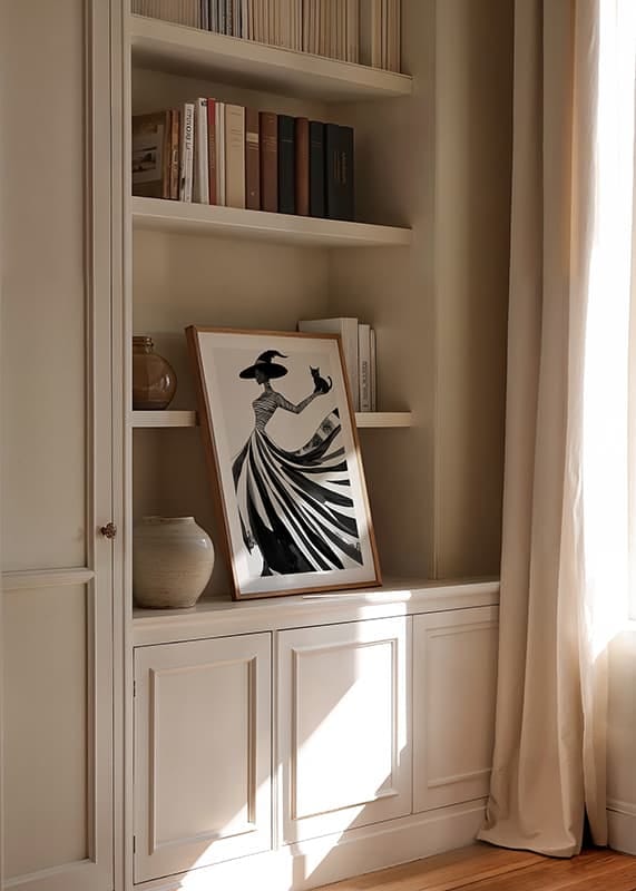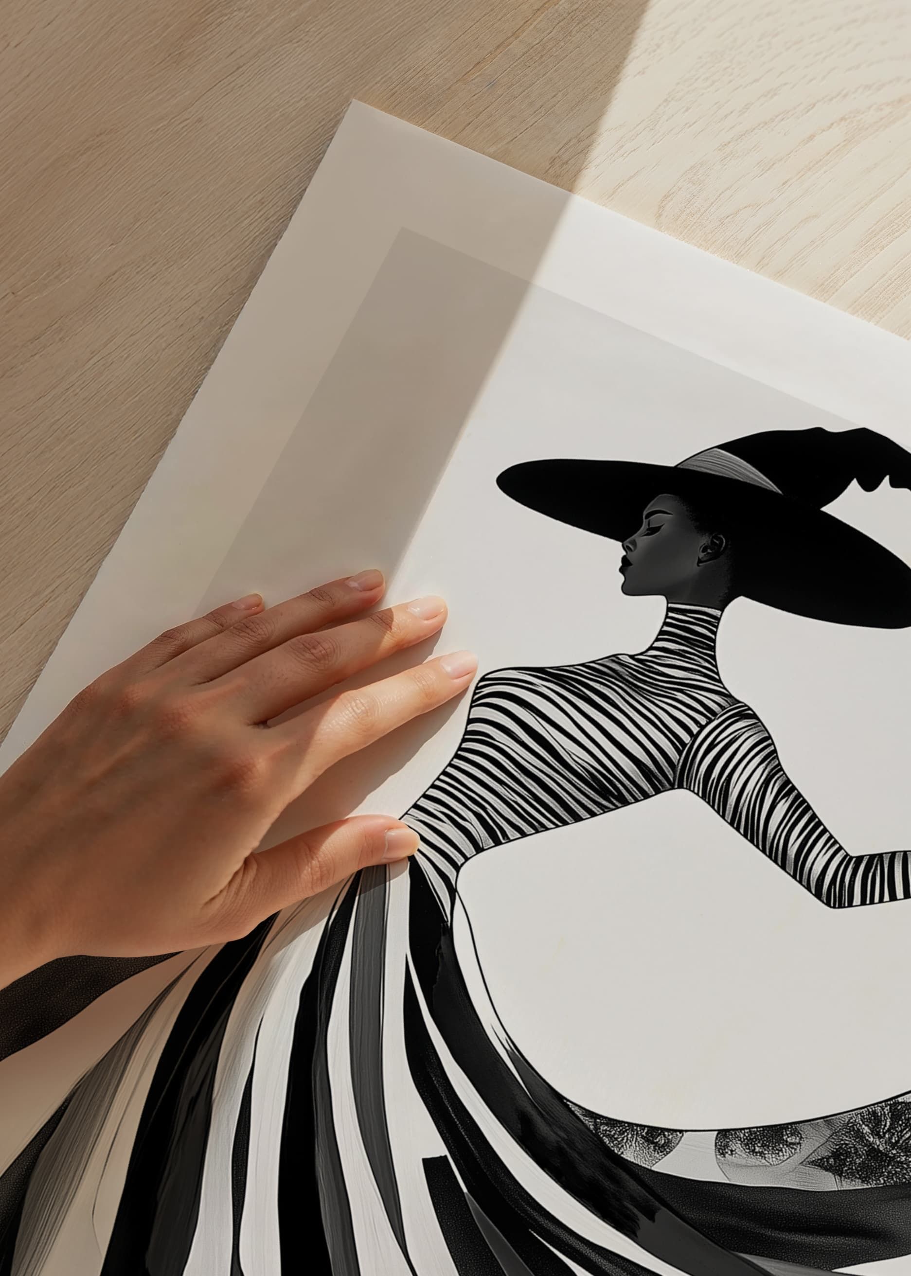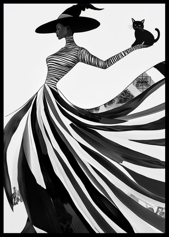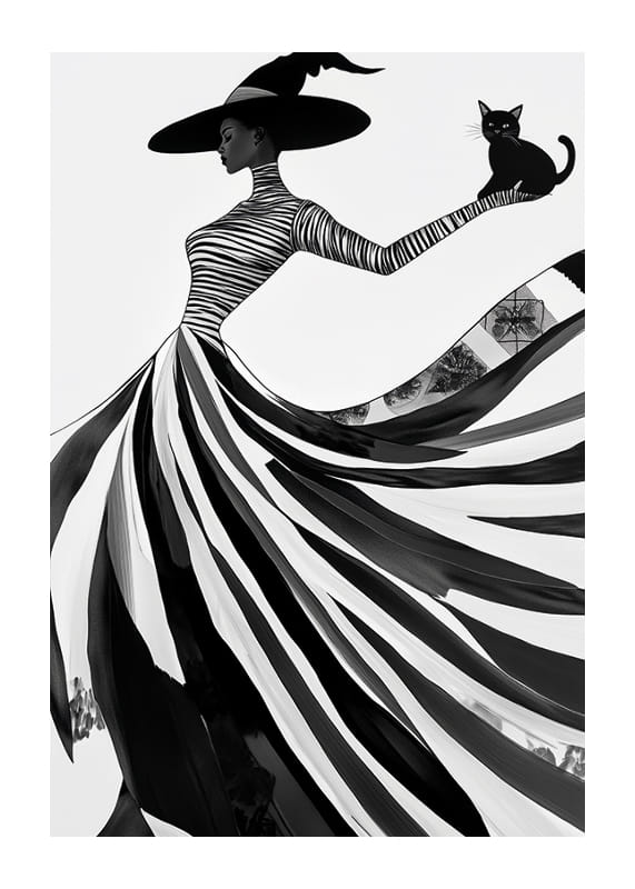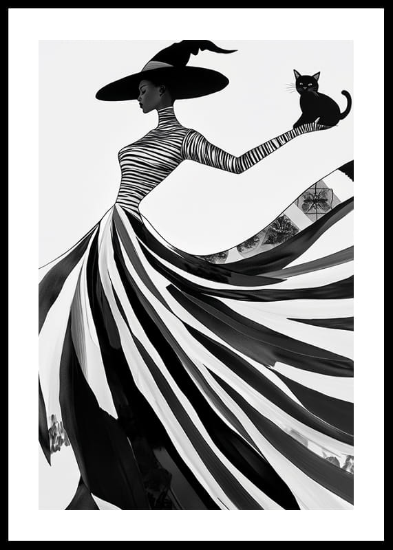 This poster captures a mysterious silhouette with a bold combination of black and white. Featuring an elegant witch's hat and a black cat, the artwork evokes a sense of magic and style. The sweeping lines create a movement that is both captivating and artistic.