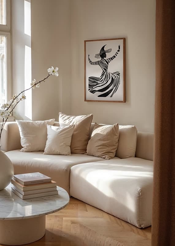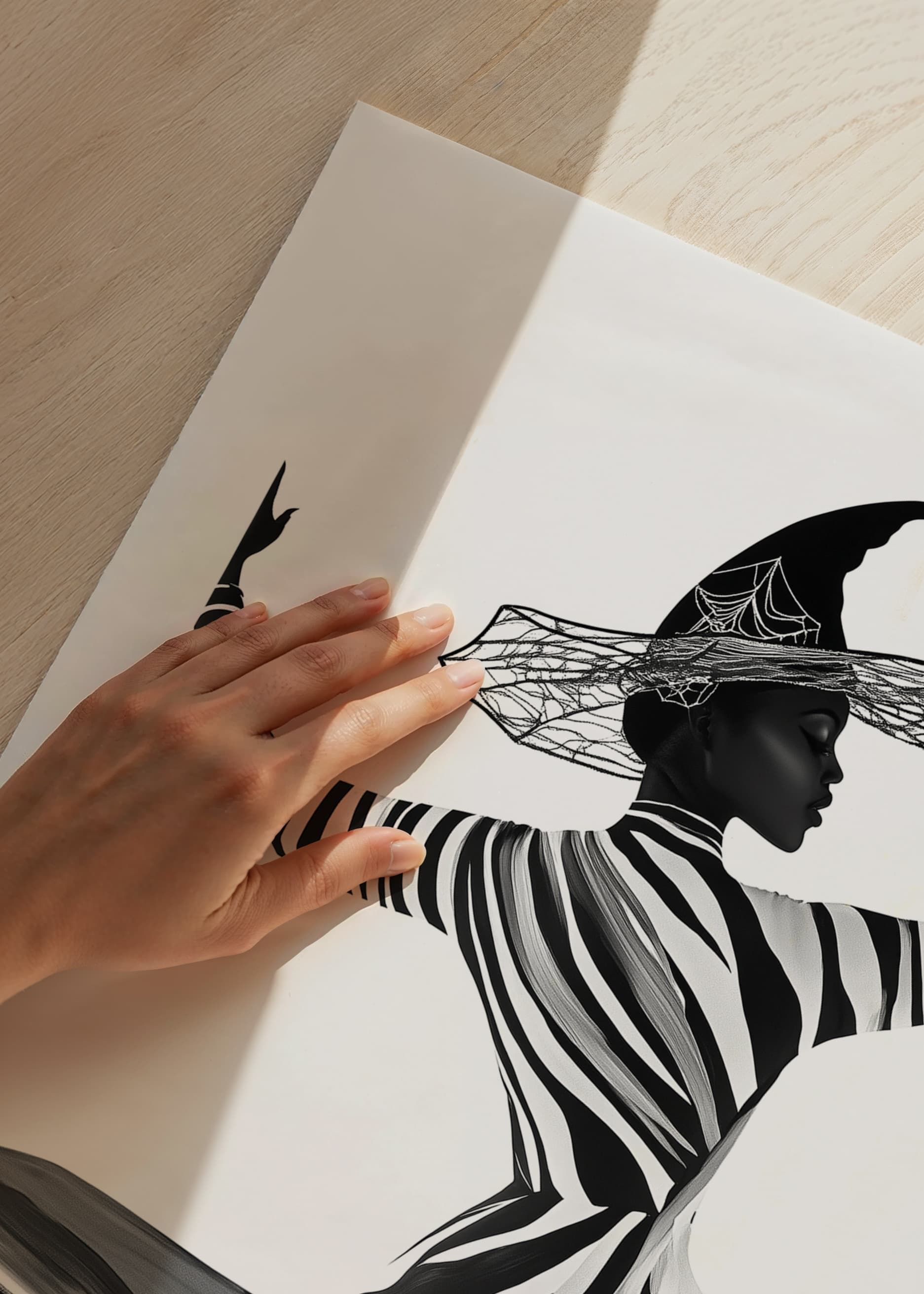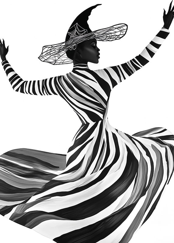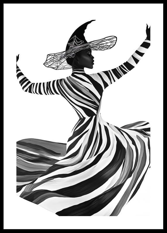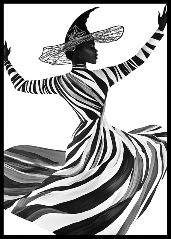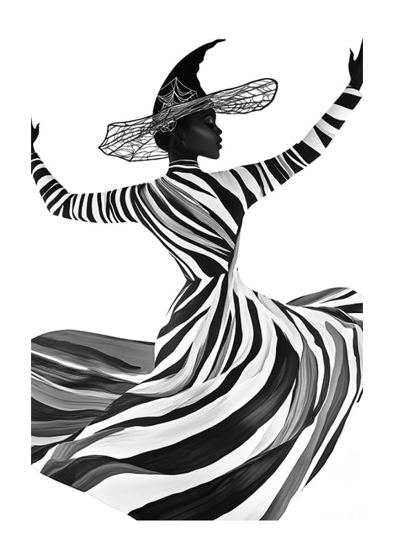 This poster catches the eye with a hypnotic dance of stripes where black and white merge into an elegant swirl. The hat with the spider web pattern adds a mysterious charm that inspires the imagination.
