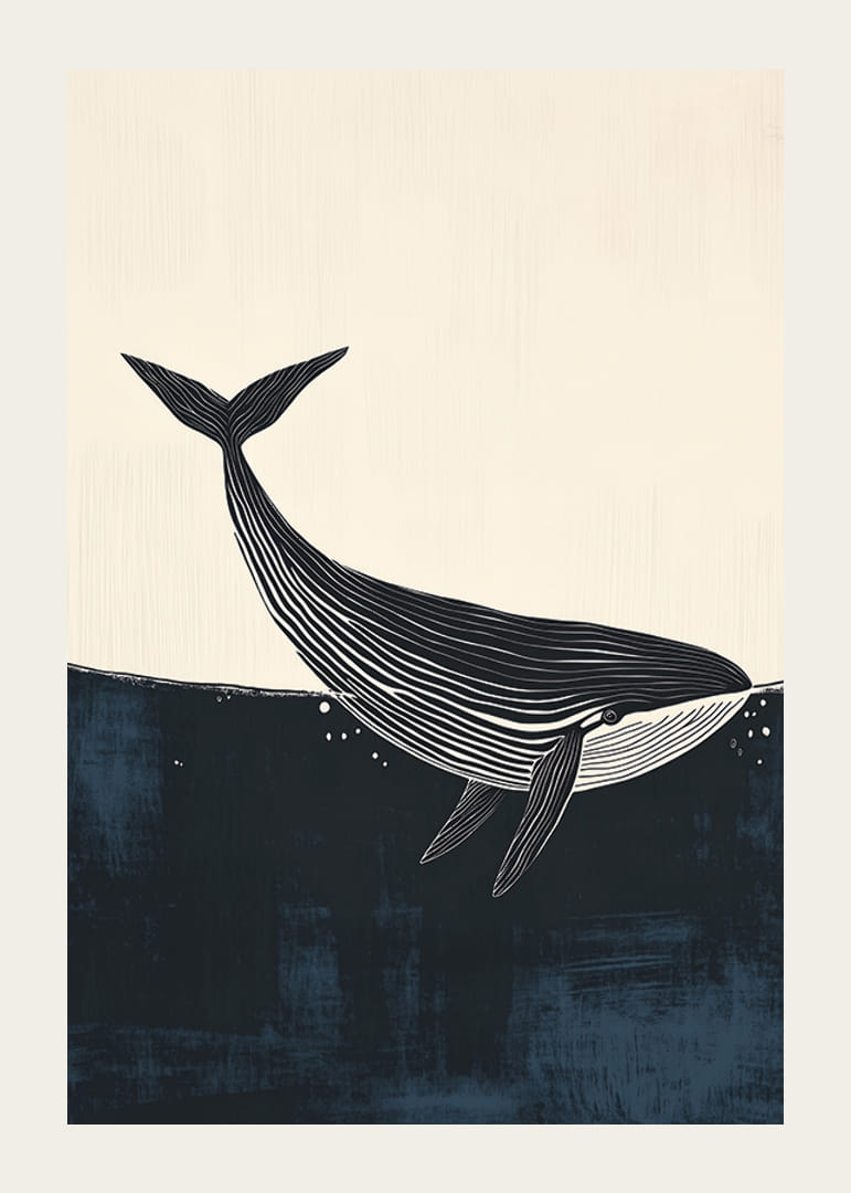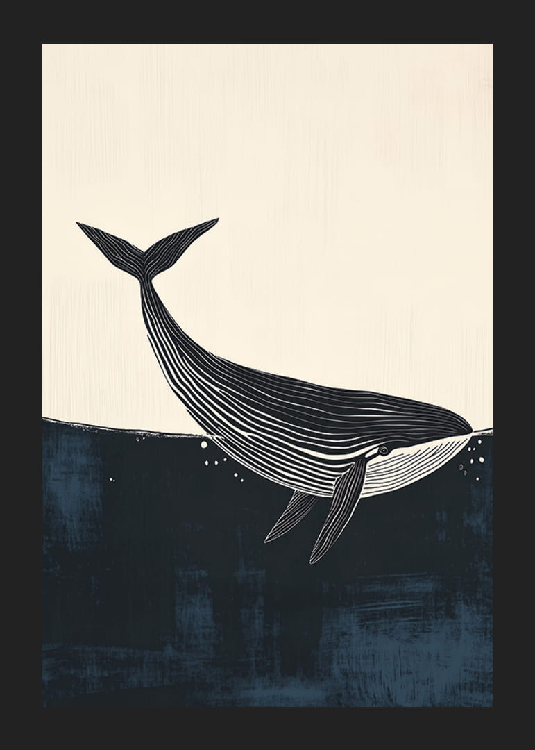 A poster with a simple yet powerful illustration of a whale majestically floating through the deep blue sea creates a sense of calm and infinity. The sober color palette of dark blue and white gives a timeless feel, while the whale's graceful lines draw the eye to the wonders of nature.