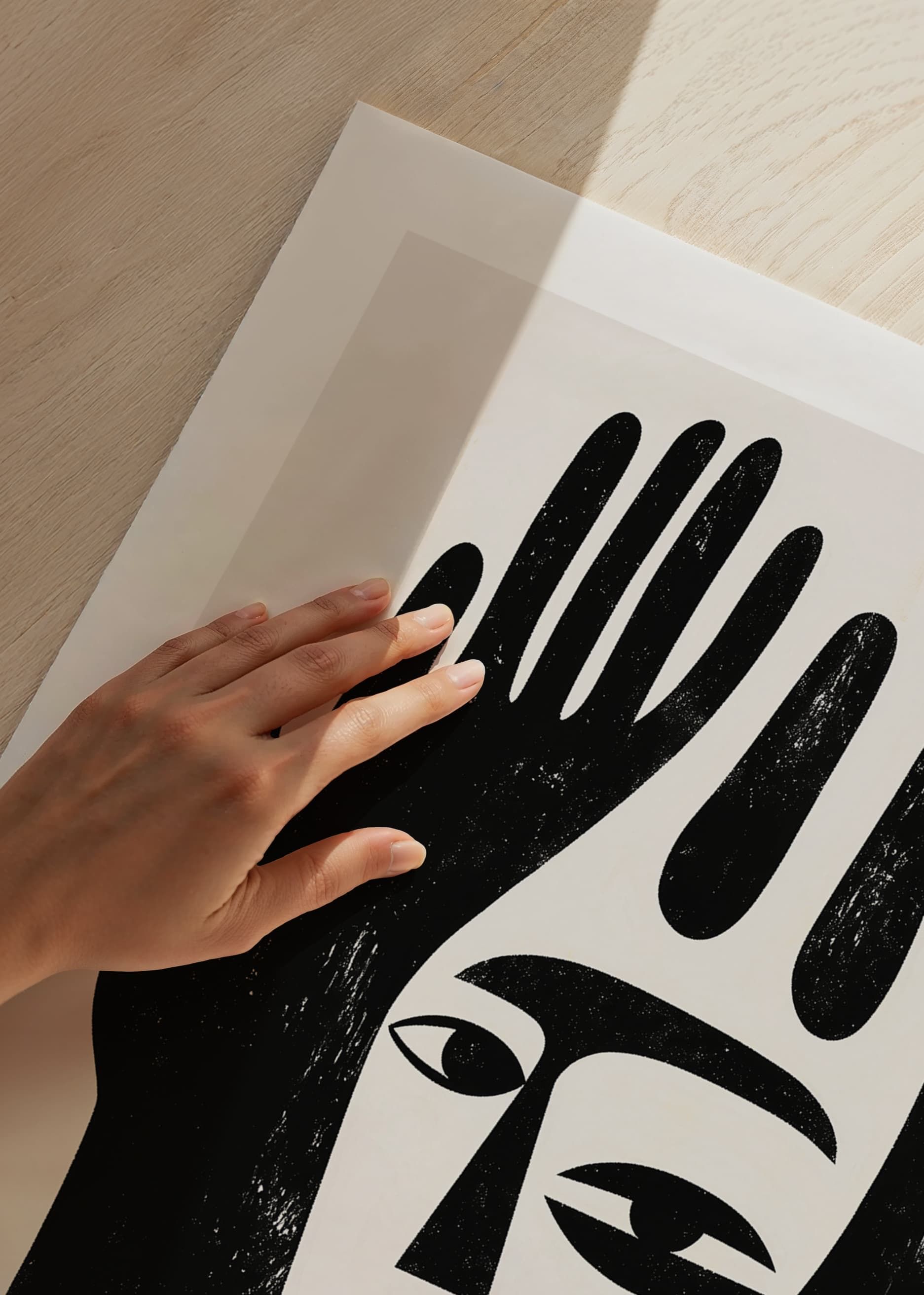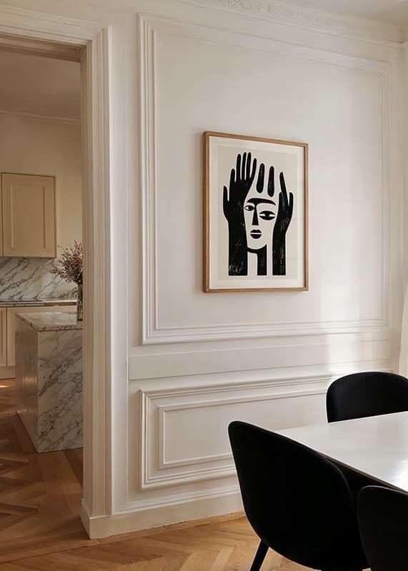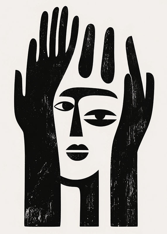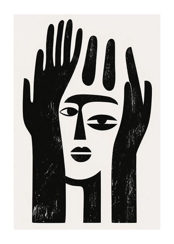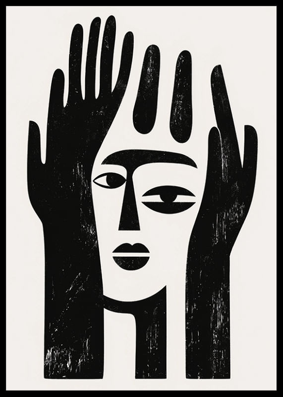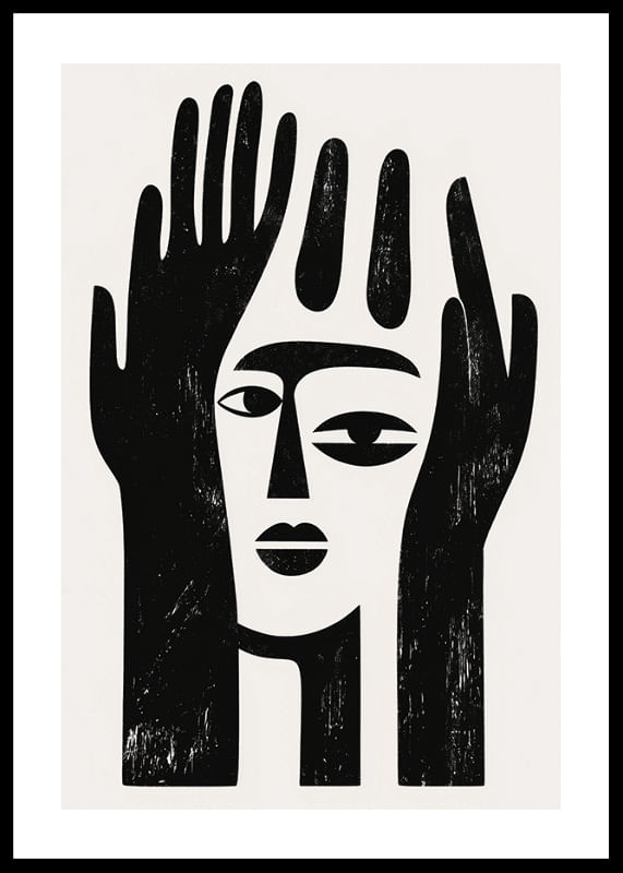 This poster catches the eye with its bold and minimalist design that combines black and white shapes into a mysterious facial expression. It unites the face and hands in a harmonious balance, creating an atmosphere of contemplation and tranquility.