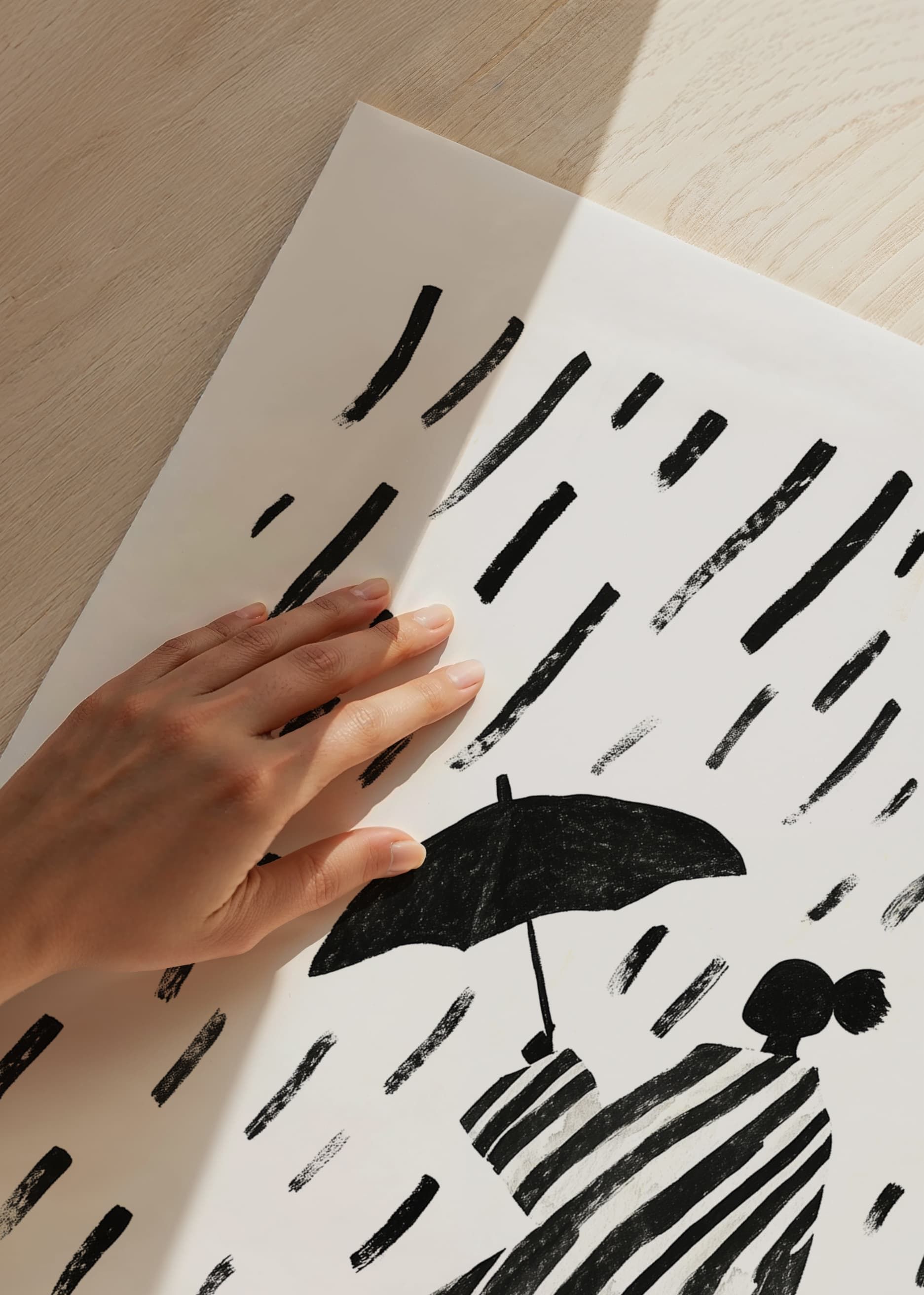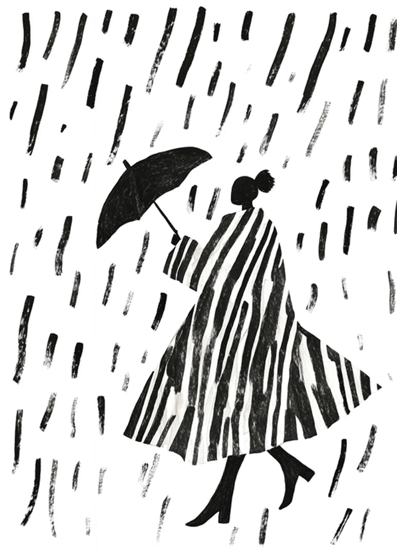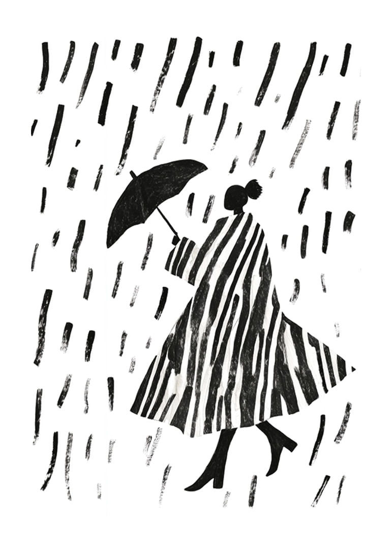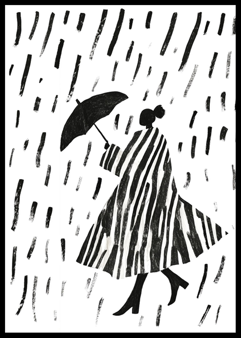 This poster captures the elegant beauty of a silhouette walking in the rain. The bold, black and white stripes create a hypnotic pattern that will bring any room to life. The combination of sleek lines and the simple rainy weather gives the poster a timeless charm.