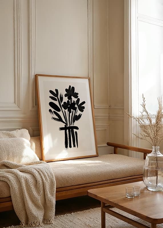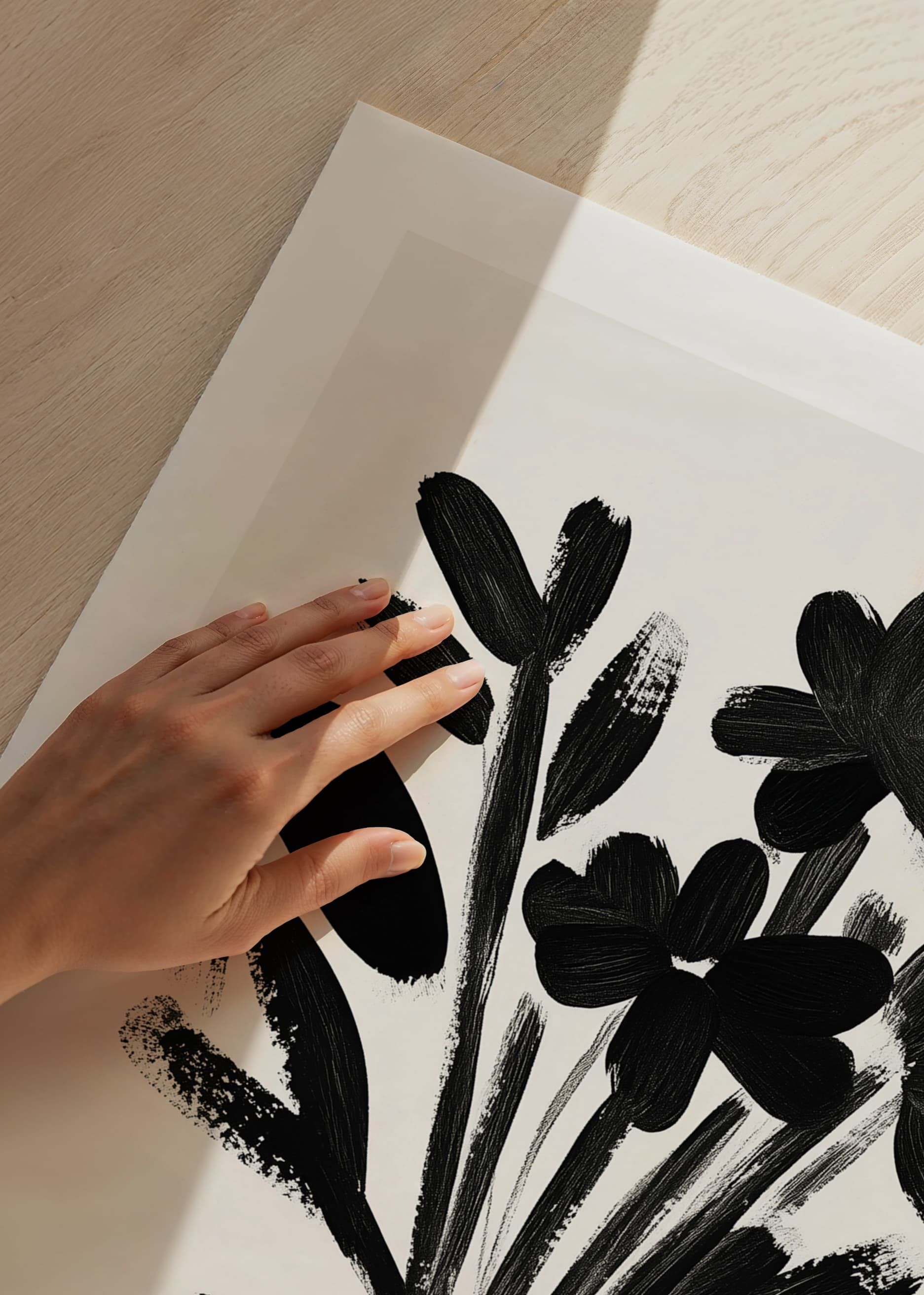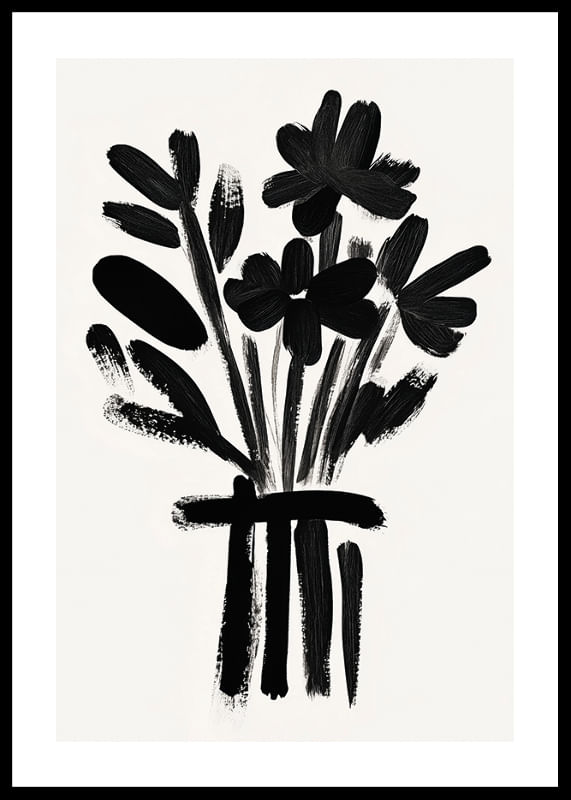 This poster catches the eye with its dramatic brushstrokes and black and white contrasts. With a sense of movement and elegance, it recreates the beauty of flowers in an abstract form. The minimalist design and visual power enhance the atmosphere of the room.