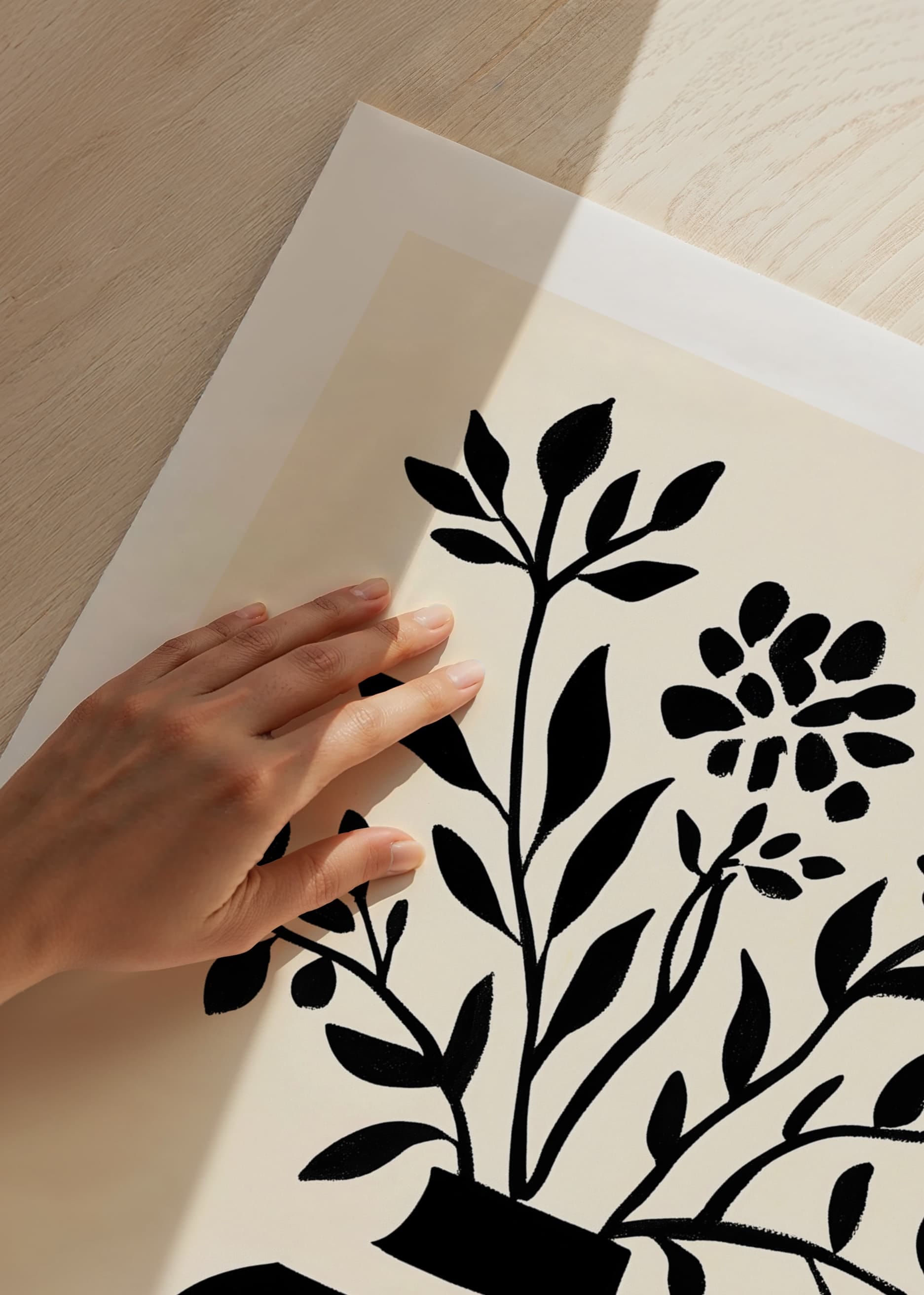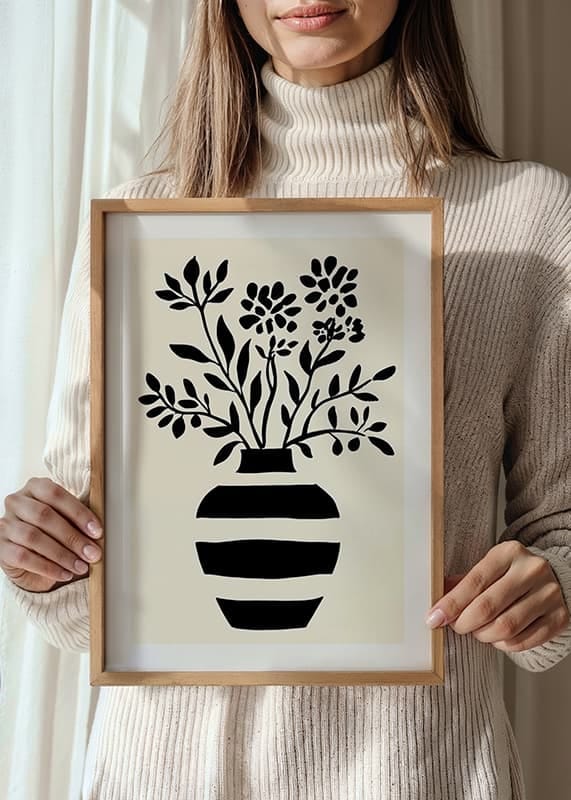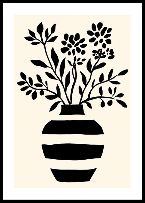 This poster catches the eye with its simple yet powerful style. A black and white silhouette of flowers rises from a striped vase, giving a sense of timeless elegance. The minimalist black and white theme creates a tranquil atmosphere, perfect for adding a touch of sophistication to any room.