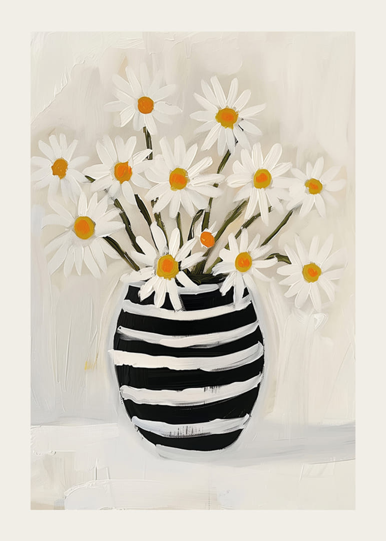 This poster catches the eye with its radiant daisies shooting up from an elegant striped vase. The vibrant contrasts between the white petals and the monochrome vase create a sense of calm and beauty.