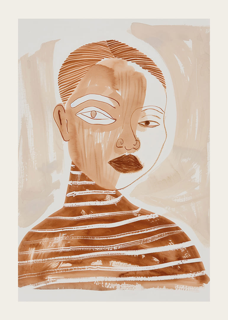 This poster catches your eye with its soft, earthy color scheme and its personal expression. The lines and shapes of the face are painted with a gentle hand, creating a sense of calm and introspection.