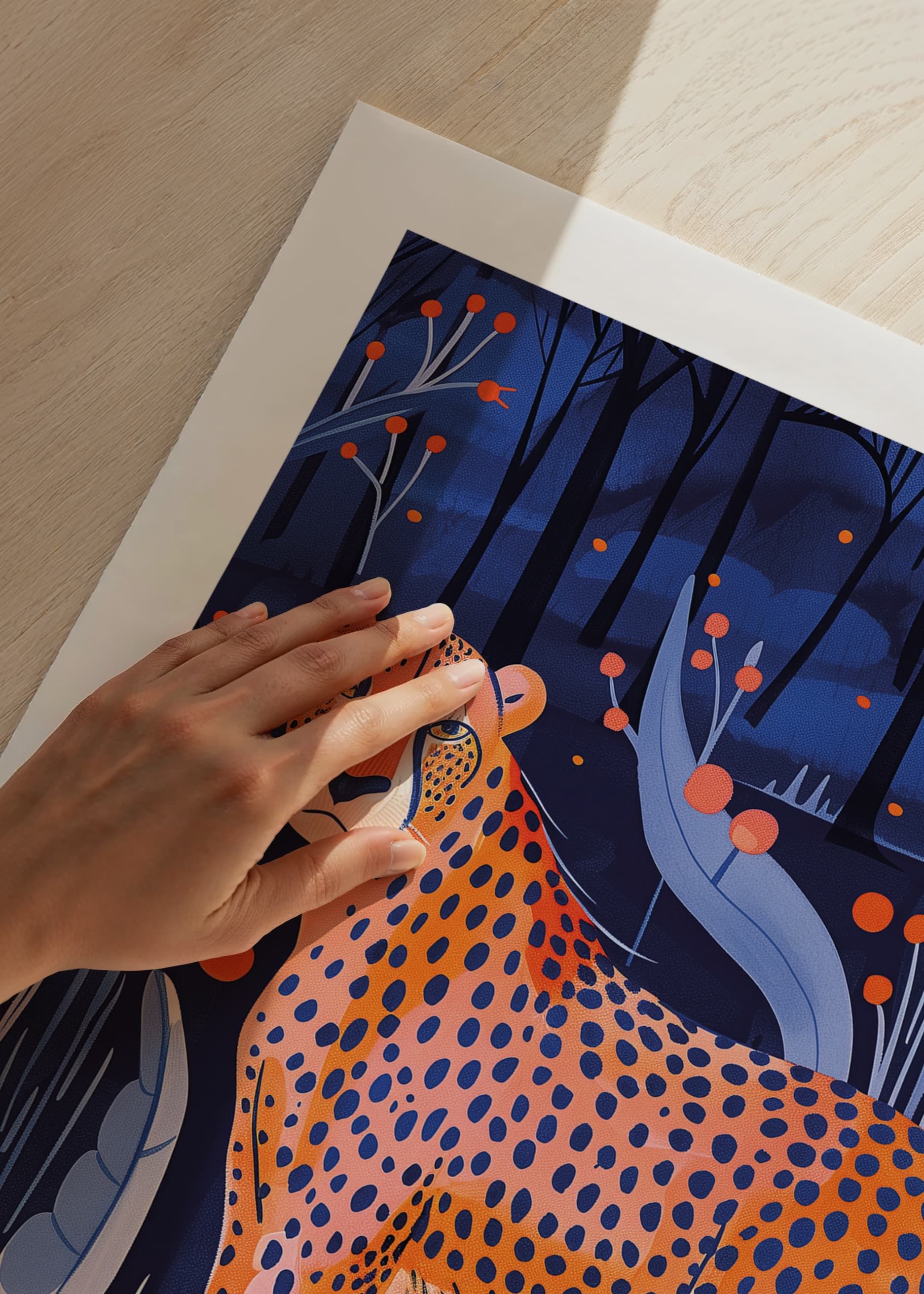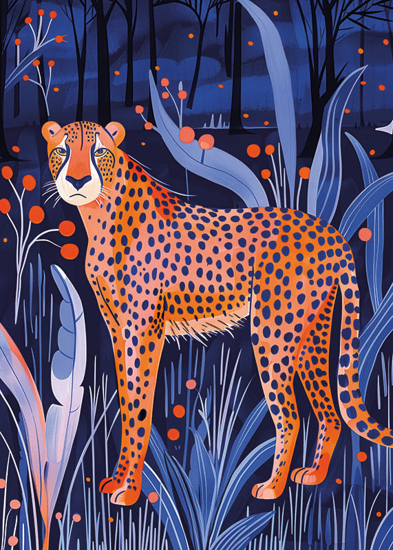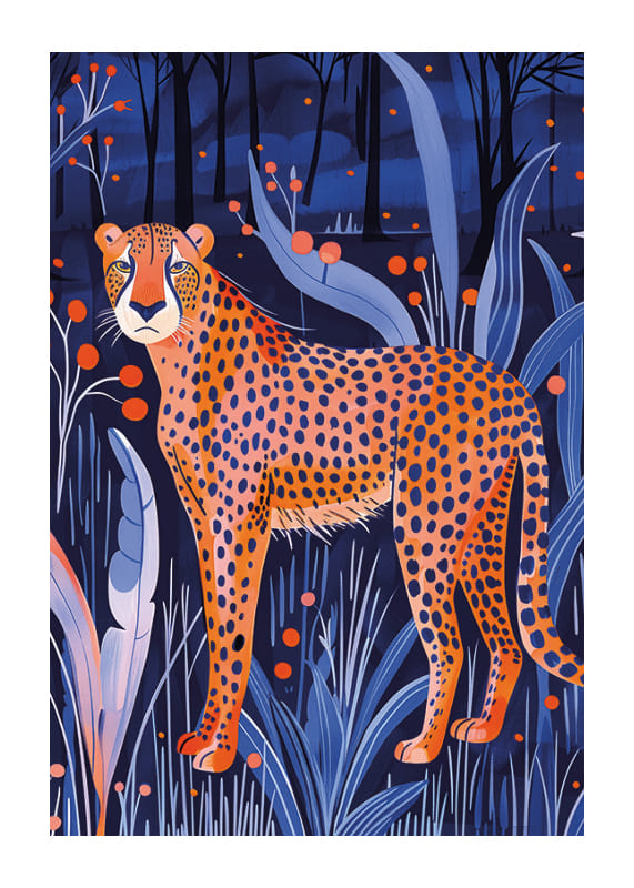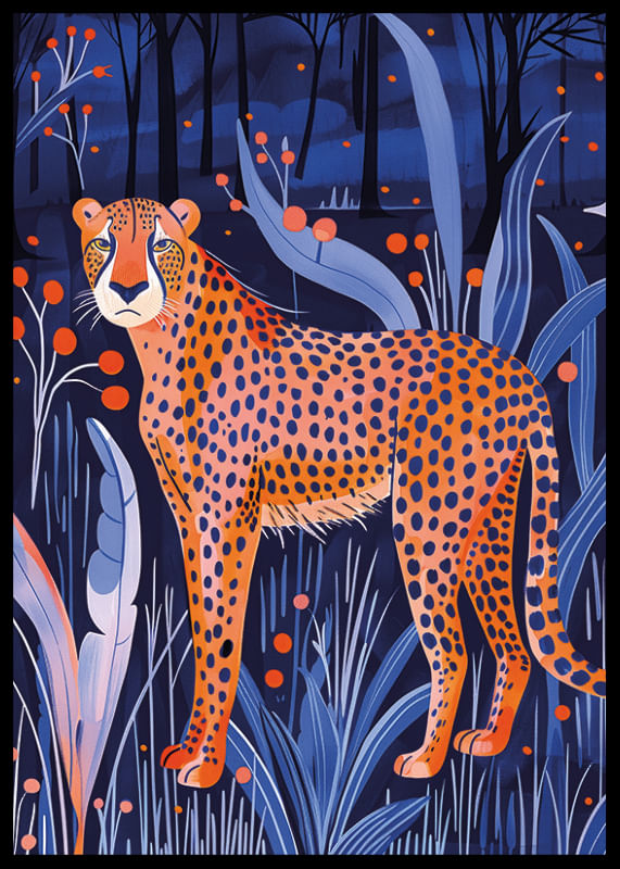 This poster captures the majestic beauty of a leopard moving elegantly through a mysterious nocturnal forest. The deep blue color palette creates a tranquil atmosphere, while the vibrant orange spots on the leopard provide a strong contrast.