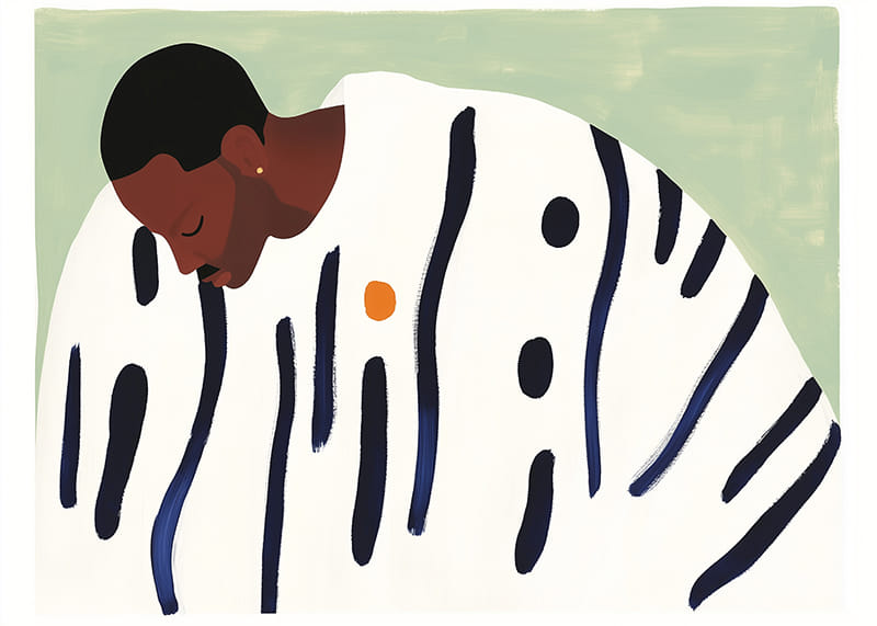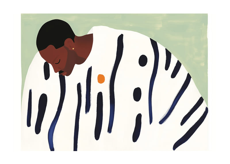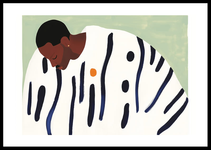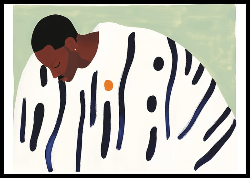 This poster captures a moment of calm and reflection, where bold lines and soft colors combine to create a sense of inner peace. The stylized depiction, with rich contrasts and subtle details, invites contemplation and stillness.