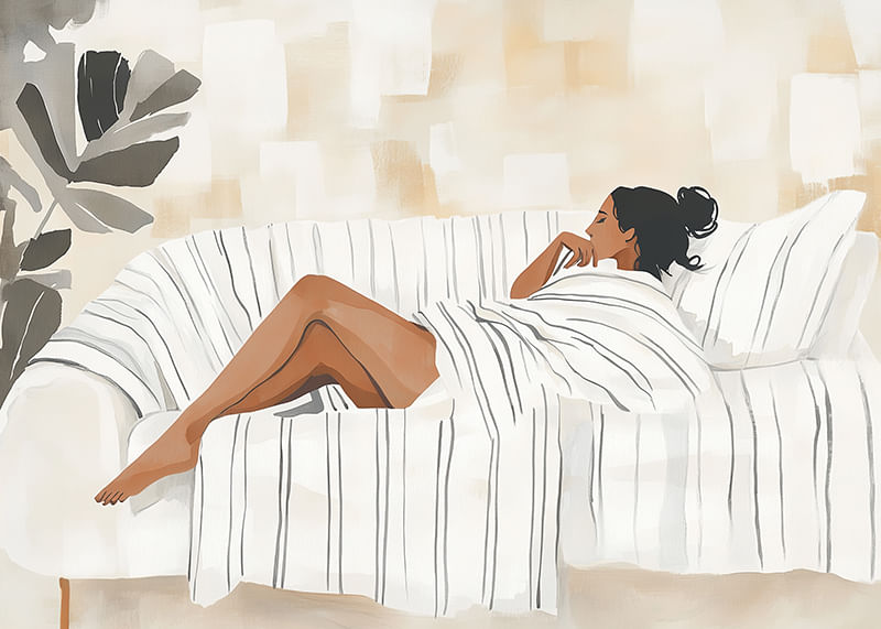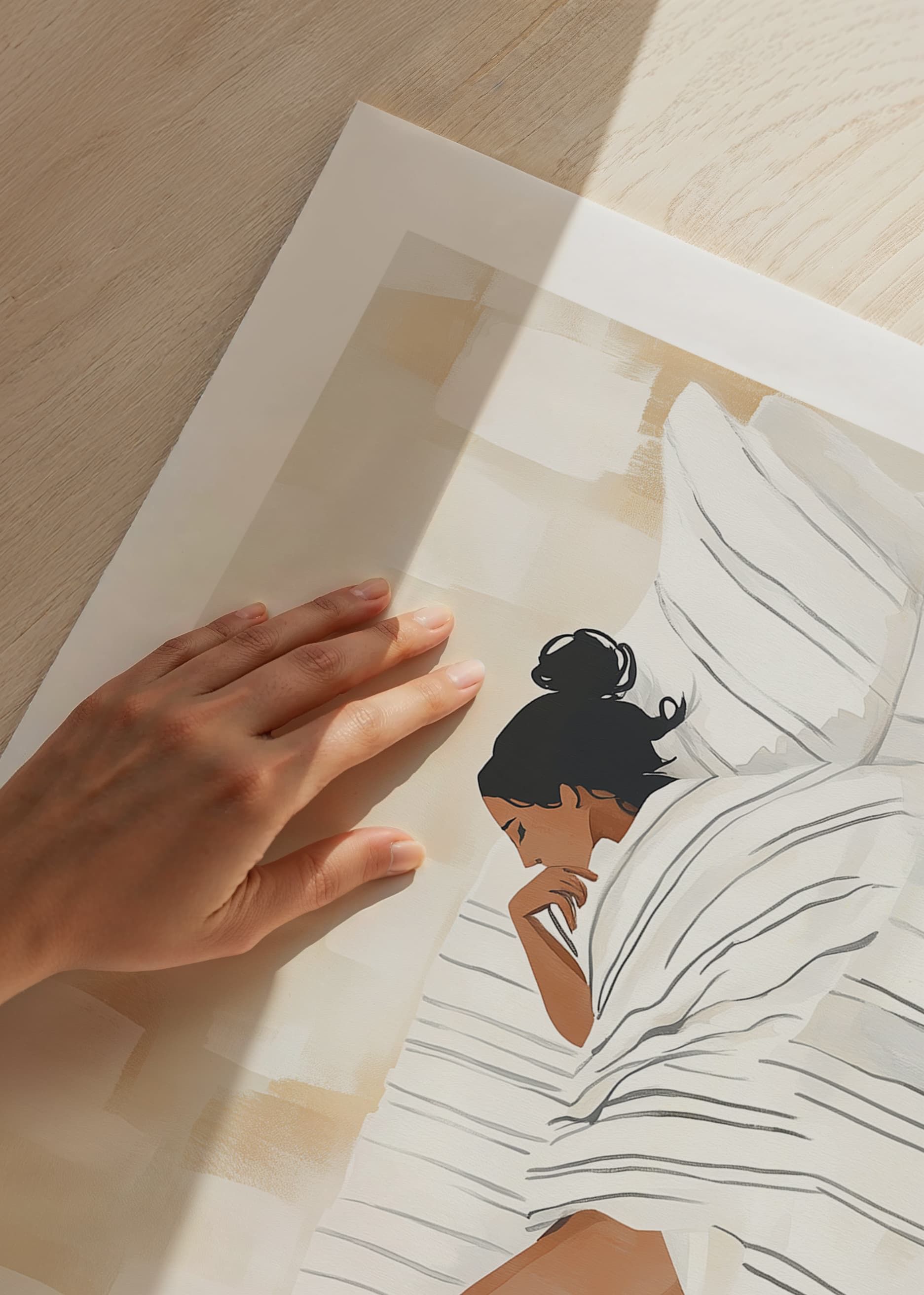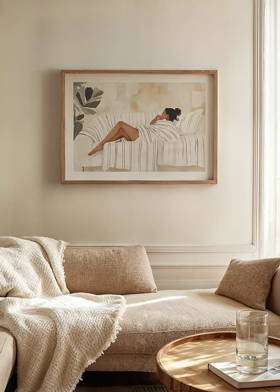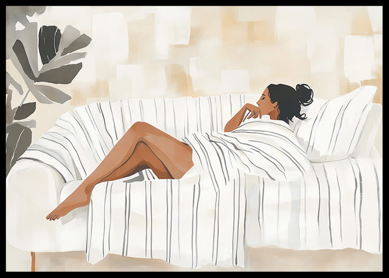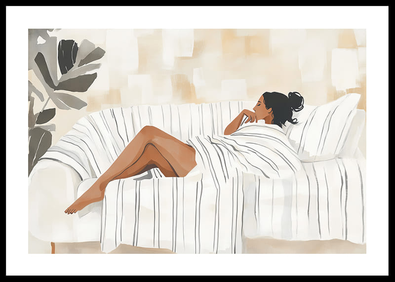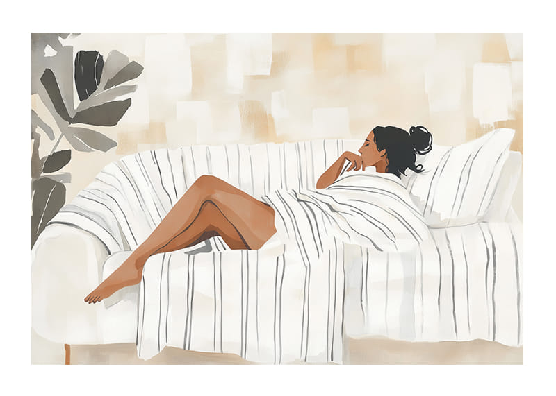 This poster captures a moment of stillness and relaxation, where a woman lies comfortably wrapped in a striped blanket on a sofa. The soft, earthy tones create an atmosphere of harmony and tranquility. The subtle details allow the viewer's mind to dream away to places of sensual tranquility.