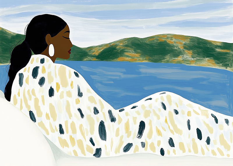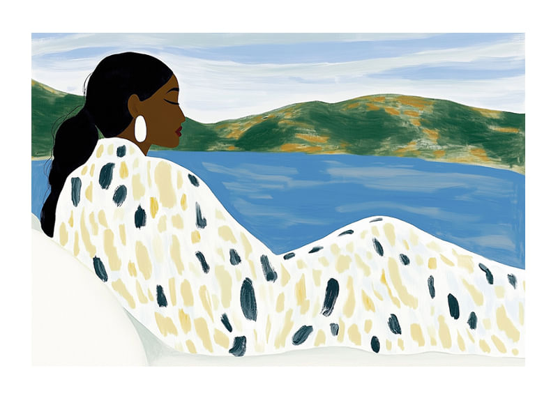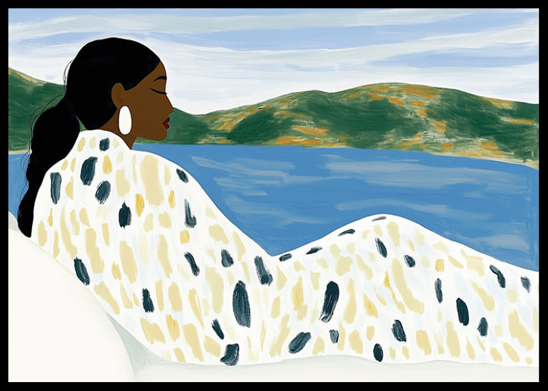 This poster captures a woman in total relaxation by a still lake, surrounded by soft colors and rolling landscapes. The calm blue and green tones create an atmosphere of peace and tranquility.