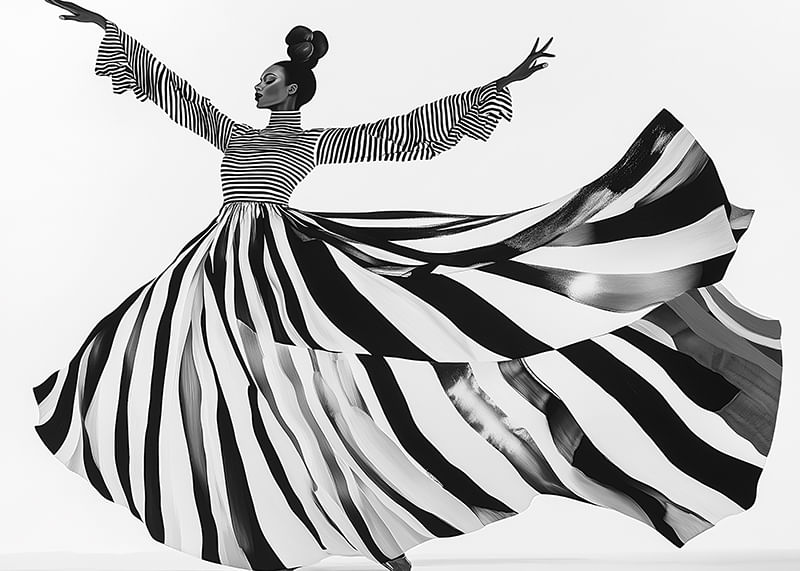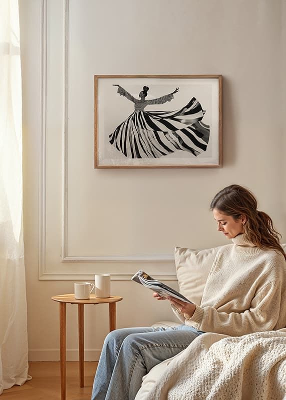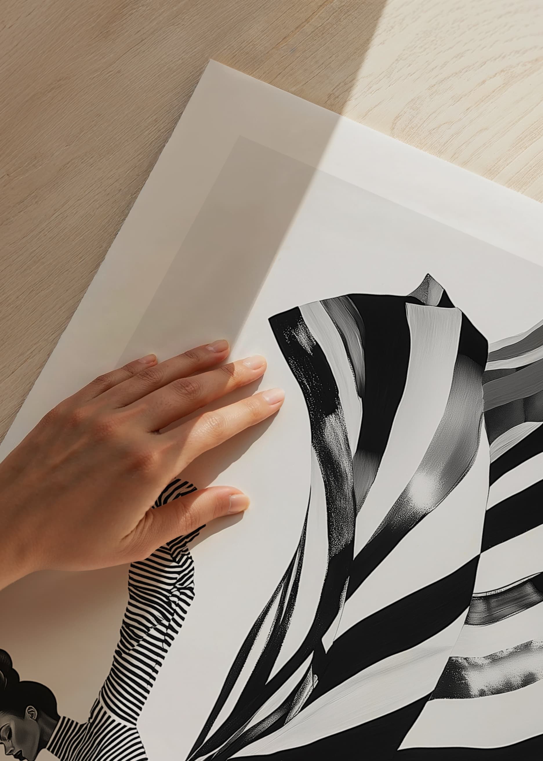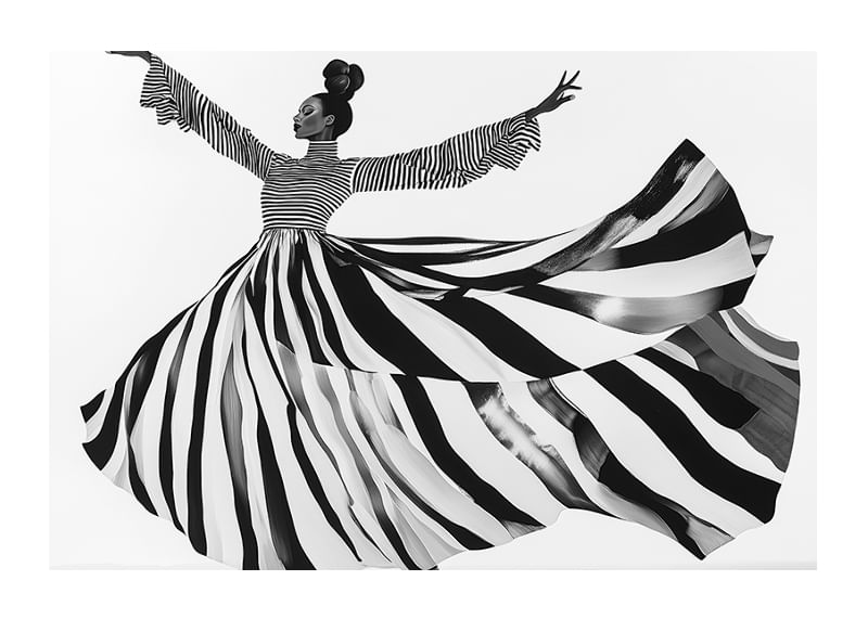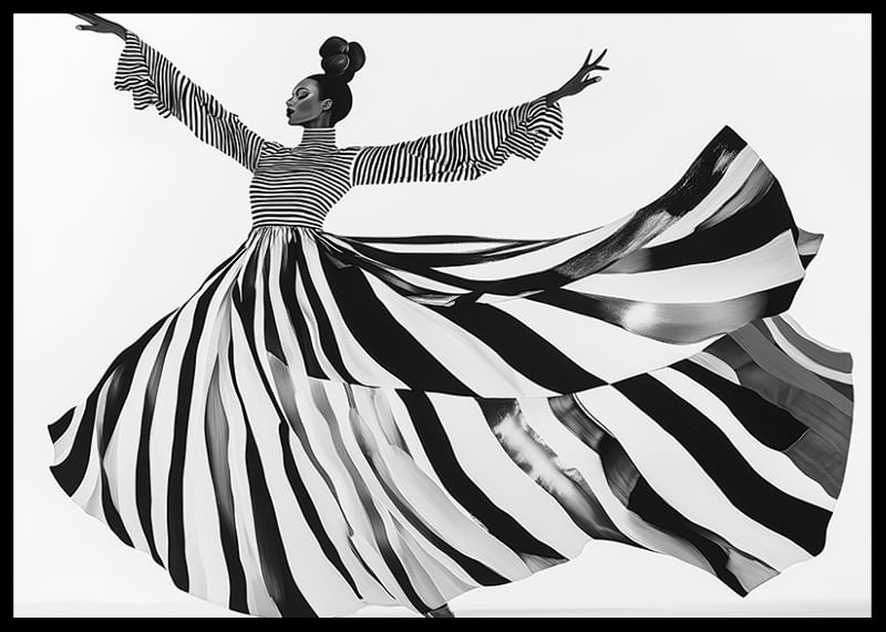 With captivating simplicity, this poster captures black and white stripes in a hypnotic dance. The contrast creates a dynamic movement that seems to float and swirl in a moment of timeless elegance.