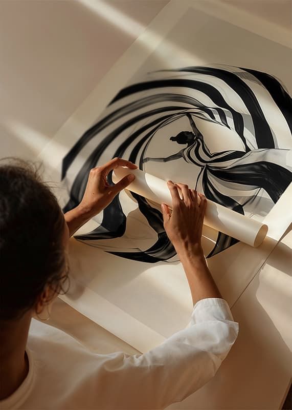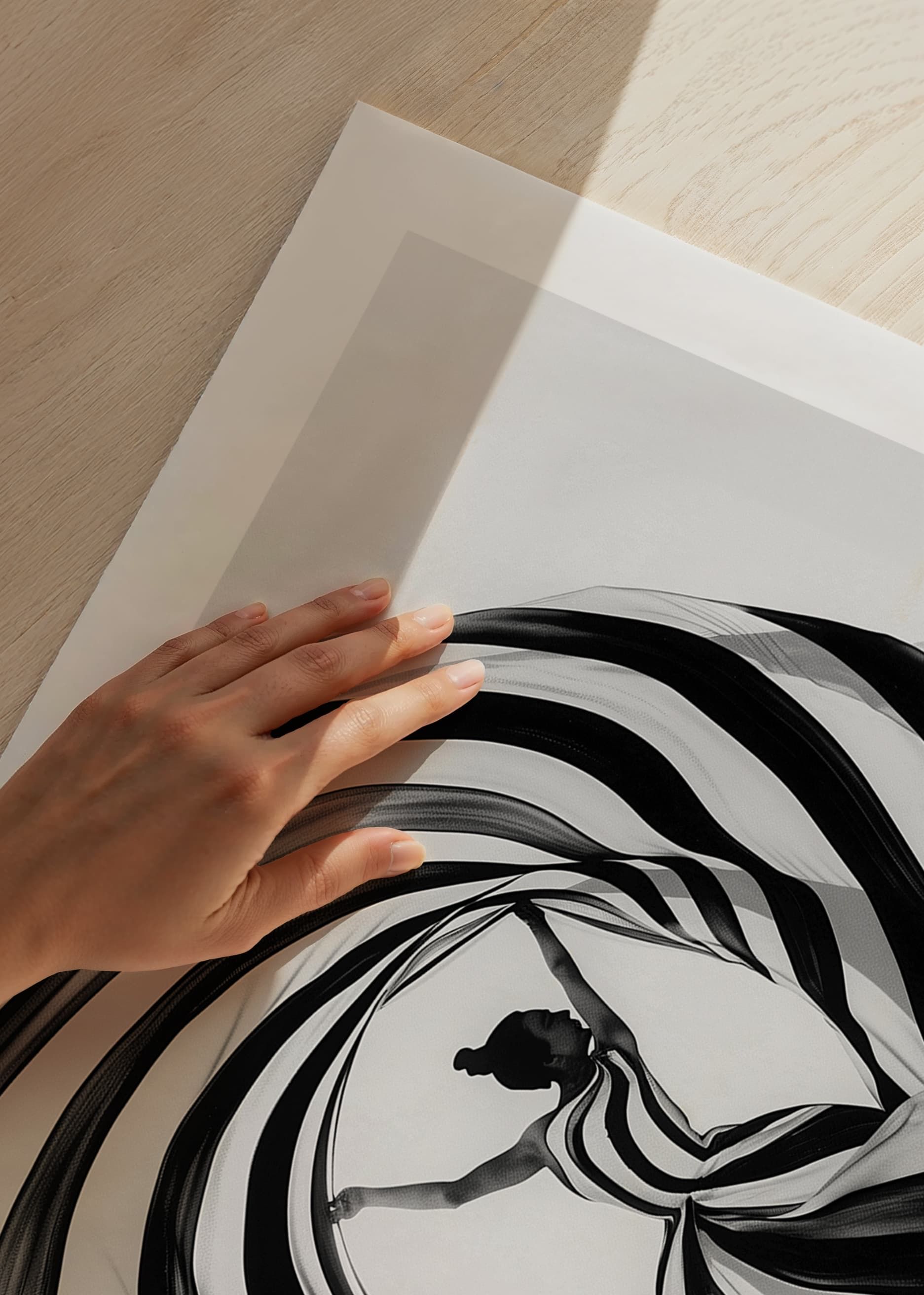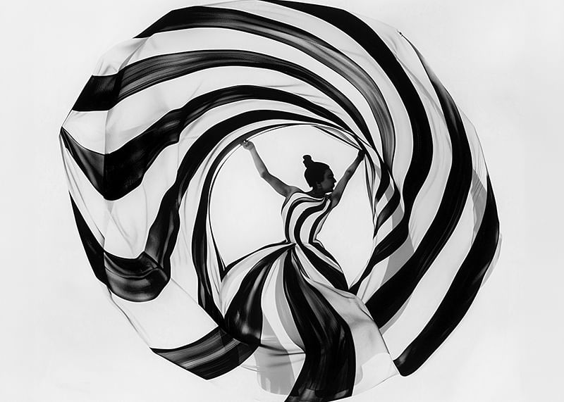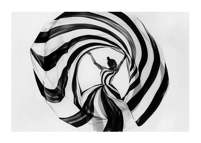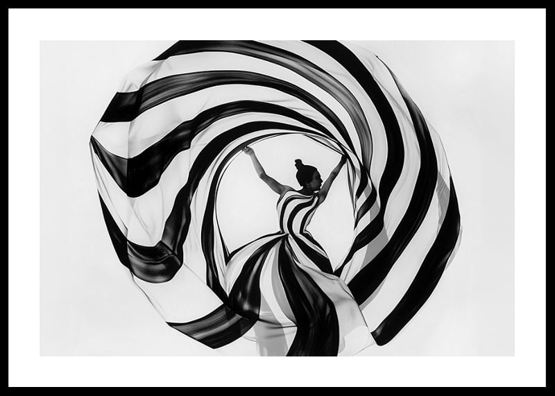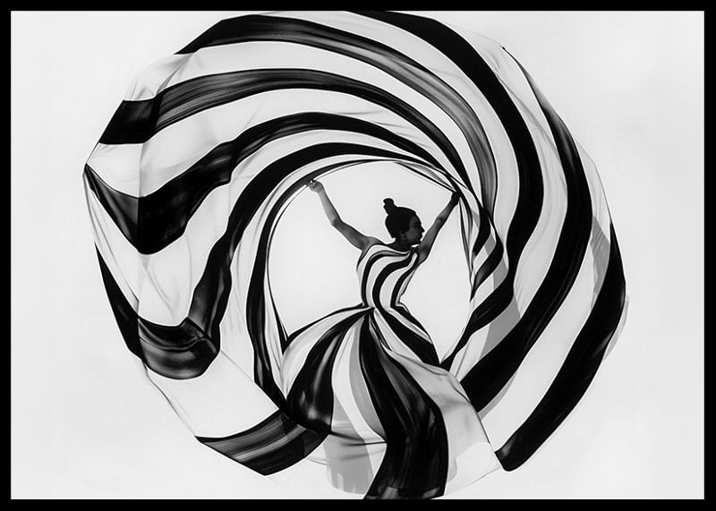 This poster immediately catches the eye with its dramatic play of black and white spirals that wrap around a dancer in a perfect balance of movement and stillness. The pattern gives a sense of timeless elegance and seductive simplicity, where every line and curve enhances a sense of magic.