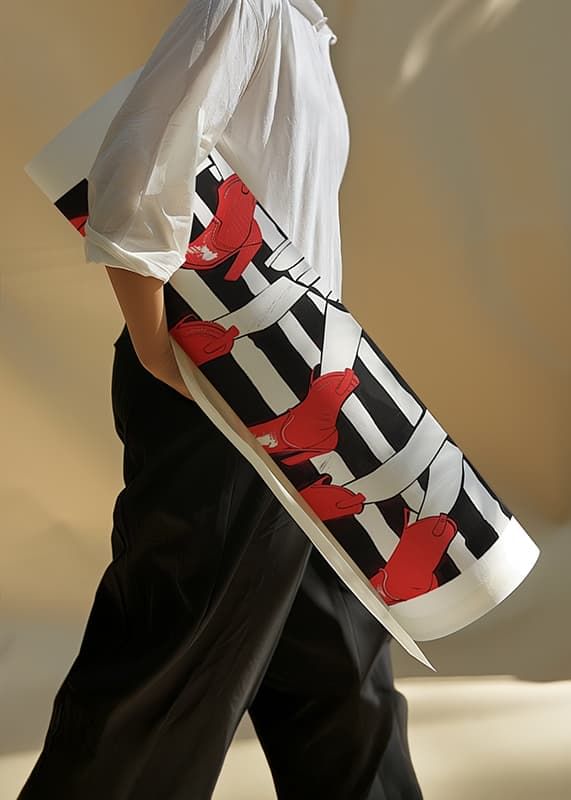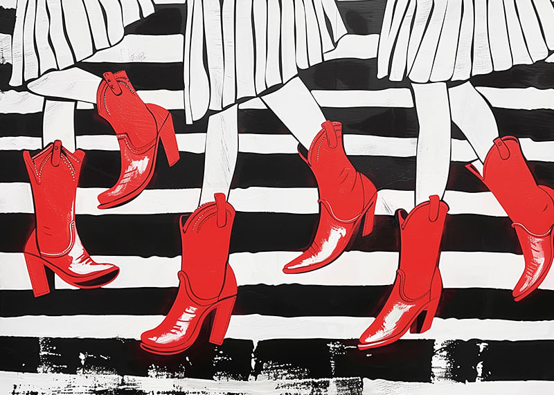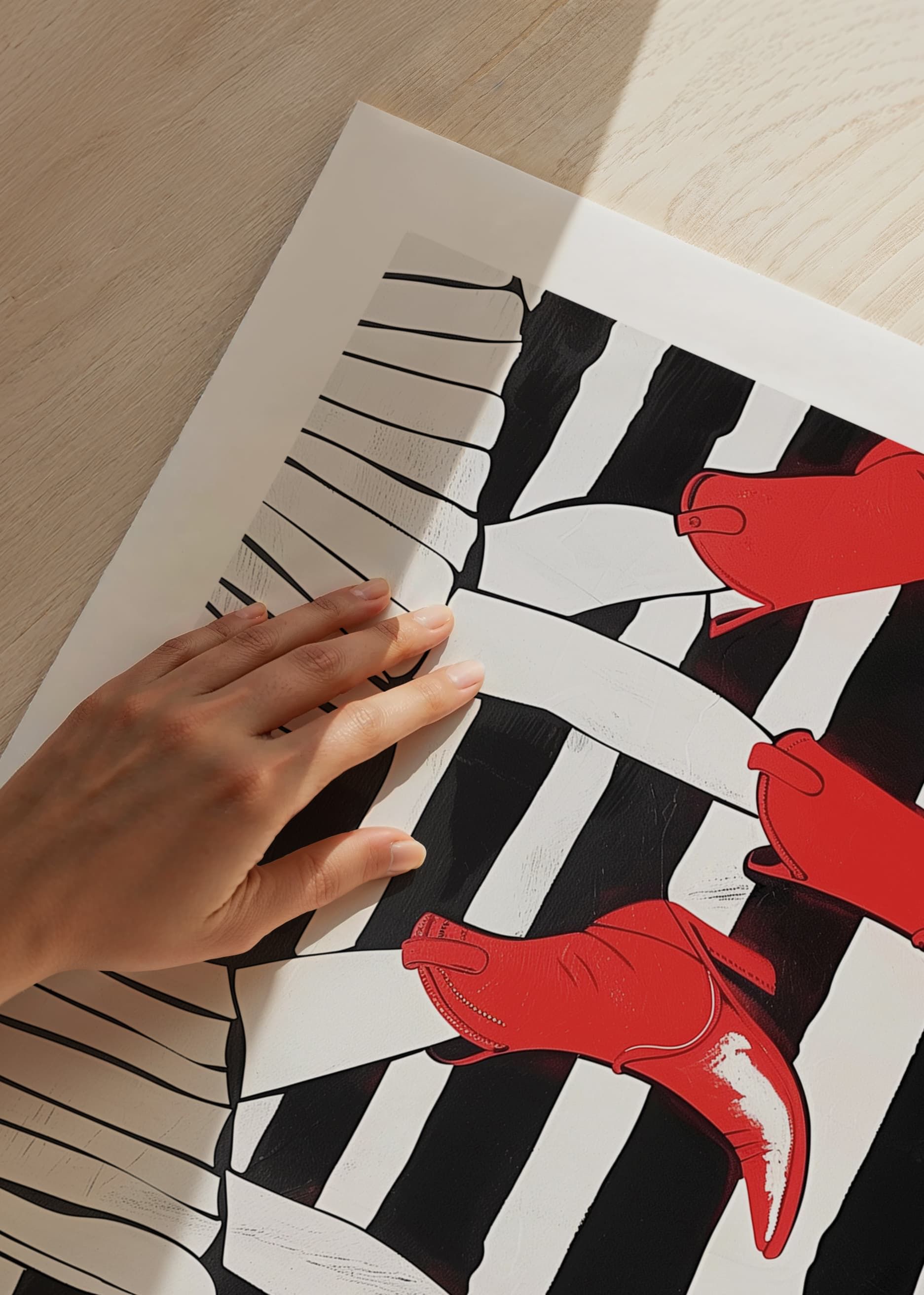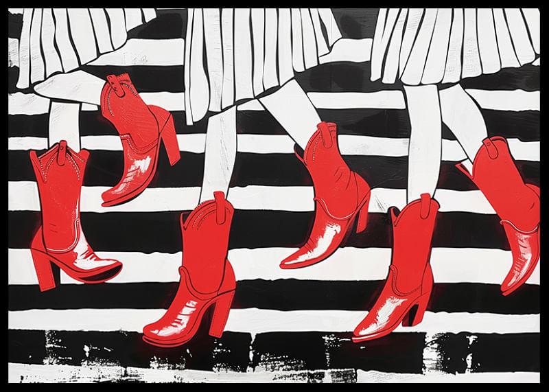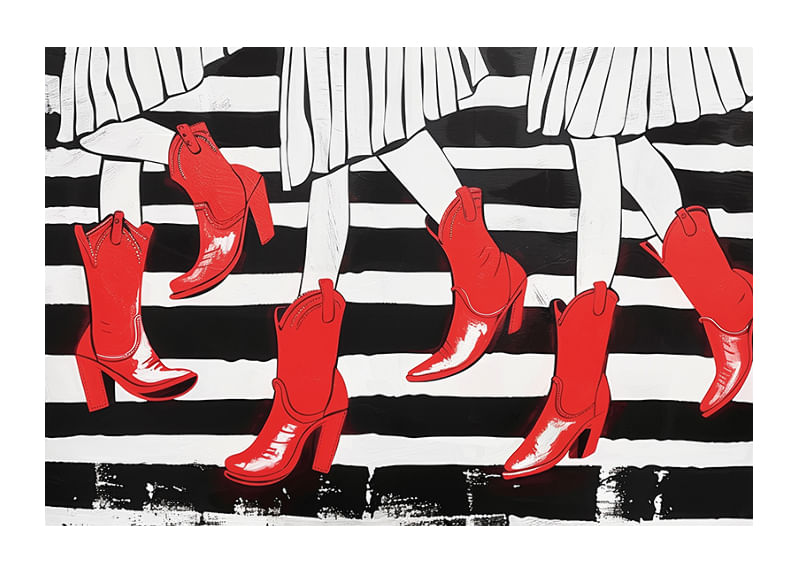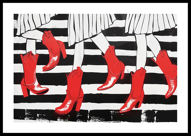 This poster catches the eye with its stylish red boots contrasting dramatically against bold black and white stripes. The carefully depicted movements give an impression of energy and fashion, evoking a sense of creativity and style.