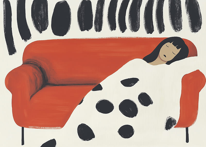 This poster captures a dreamlike scene where a woman rests peacefully on a red sofa, wrapped in a blanket of bold black dots. The contrasts between the vibrant red sofa and the graphic black patterns create a sense of calm and modern style.