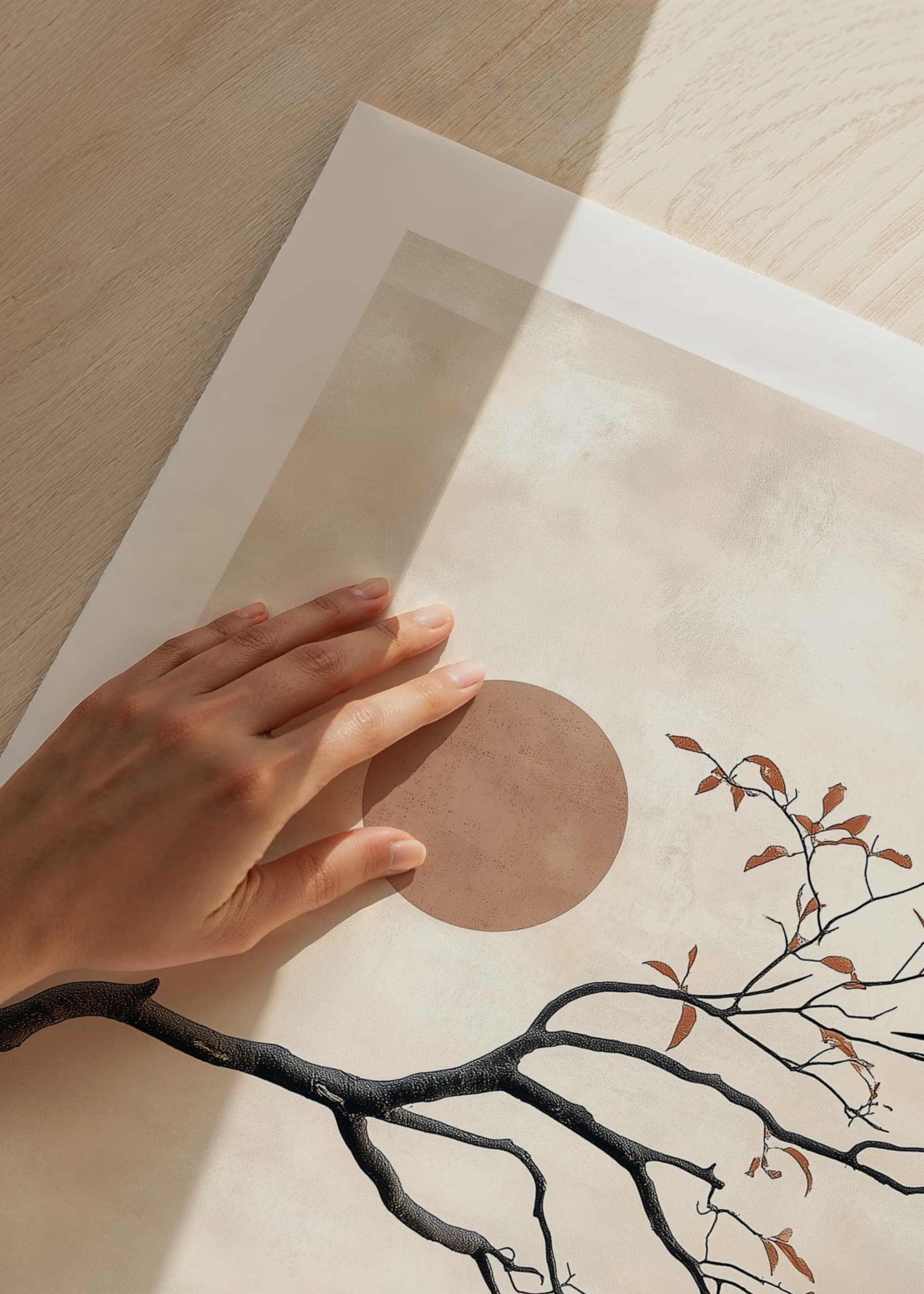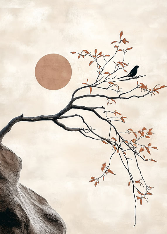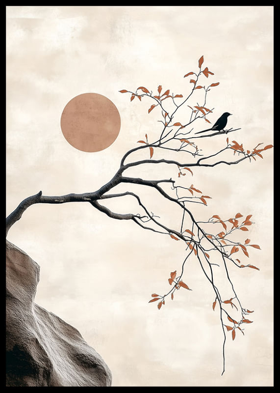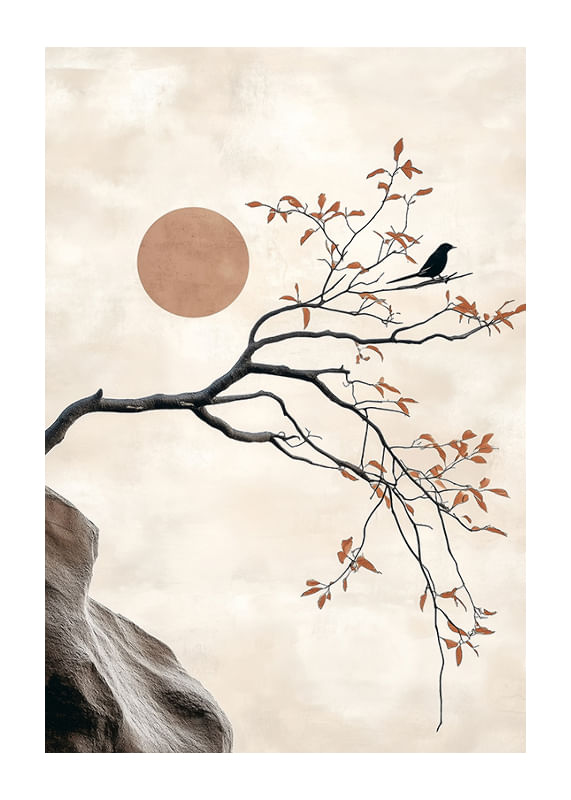 This poster captures a tranquil scene with a lone bird perched on a branch, framed by soft light and a round sun in the sky, giving a sense of peace. The leaves on the branch have warm, earthy tones that contrast beautifully against the light background.