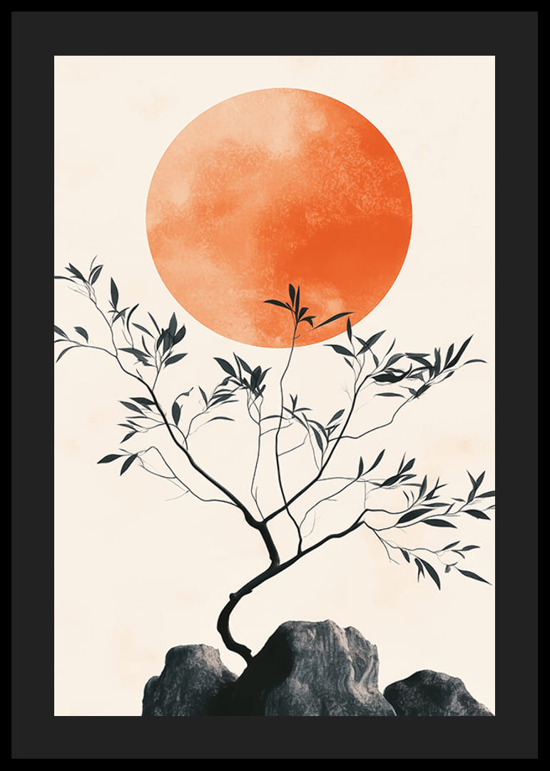 This artistic poster captures a timeless harmony between the elements of nature, where an elegantly curved tree branch contrasts with the fiery, round sun in the background. The minimalist design and natural colors create a calm and meditative feel.