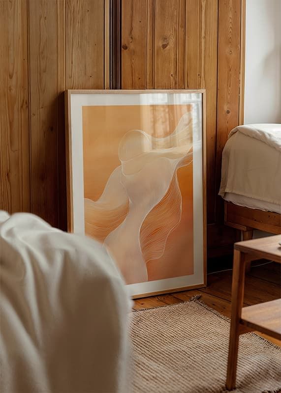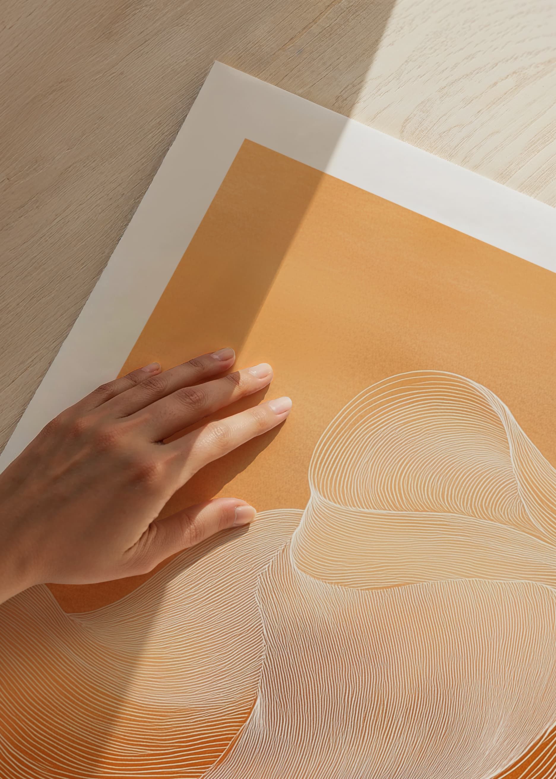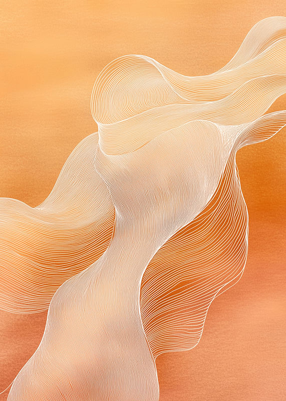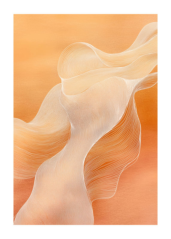 This poster conveys a sense of calm with its soft, floating lines in golden orange tones. The ethereal waves bring to mind the peaceful moments of sunset, where the light dances across the horizon.