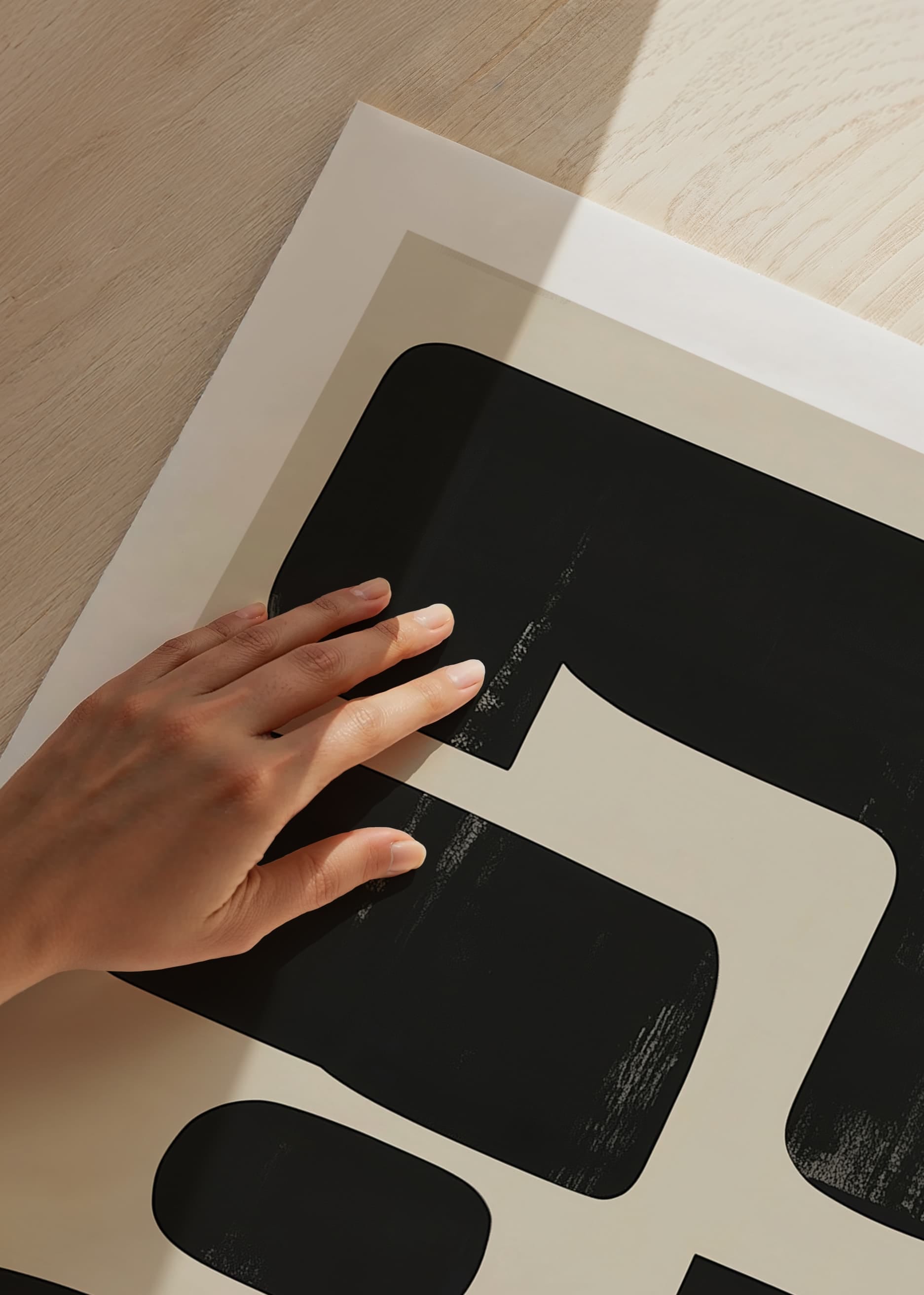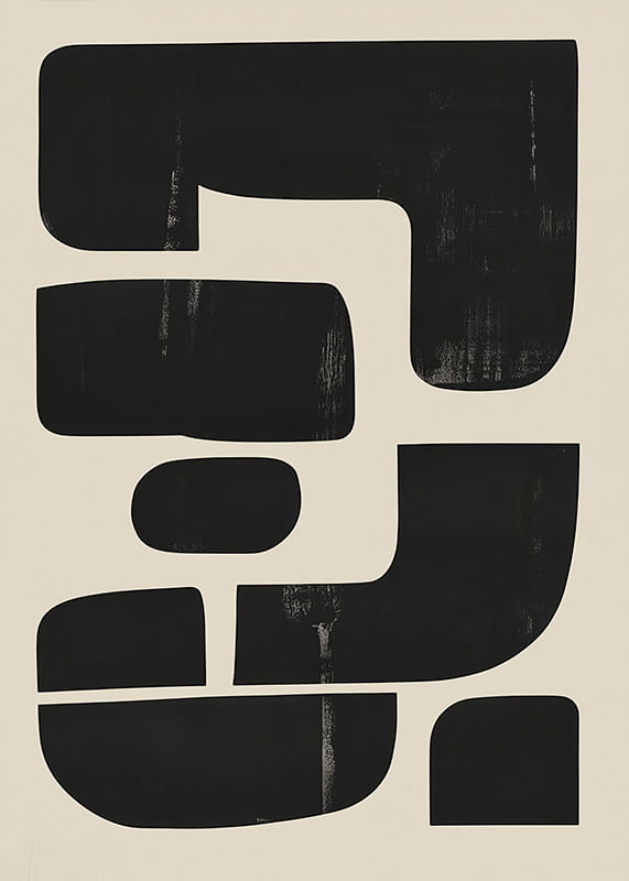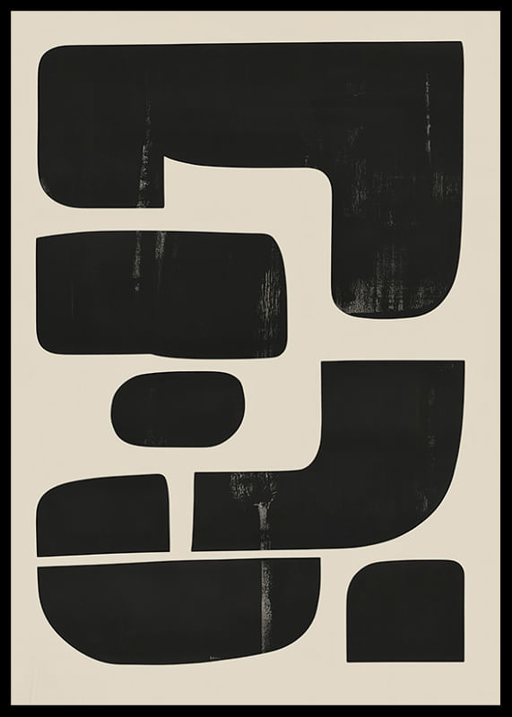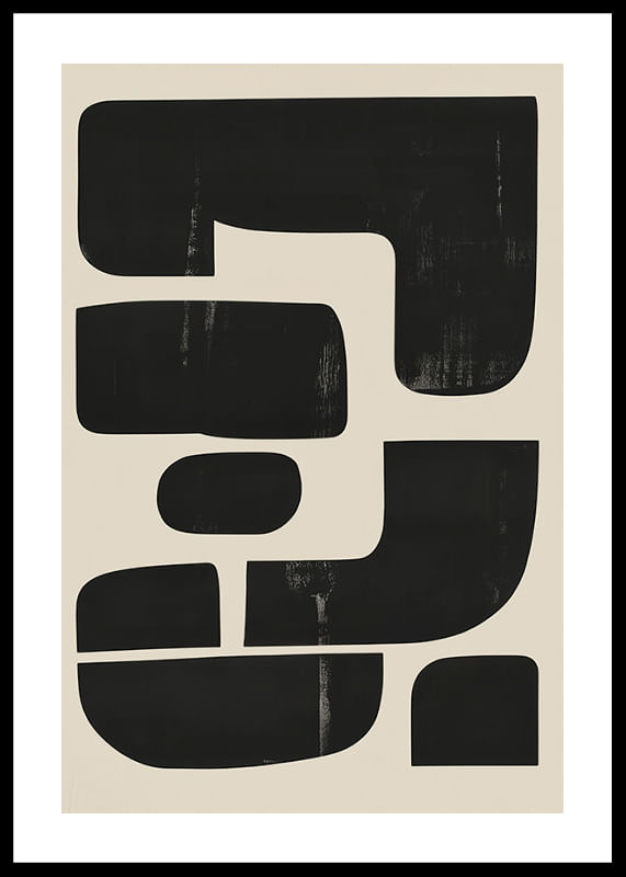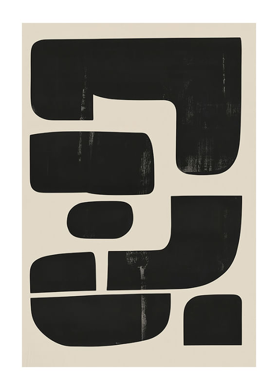This poster catches the eye with its black and white shapes dancing in a perfect arrangement. Each geometric outline contributes to a sense of both boldness and harmony. The minimalist expression gives the room a modern touch and creates a sophisticated atmosphere.