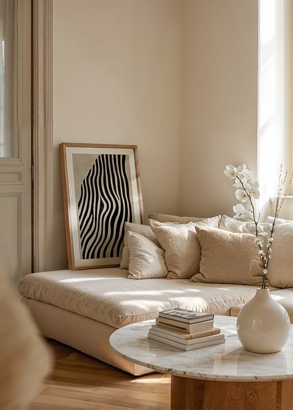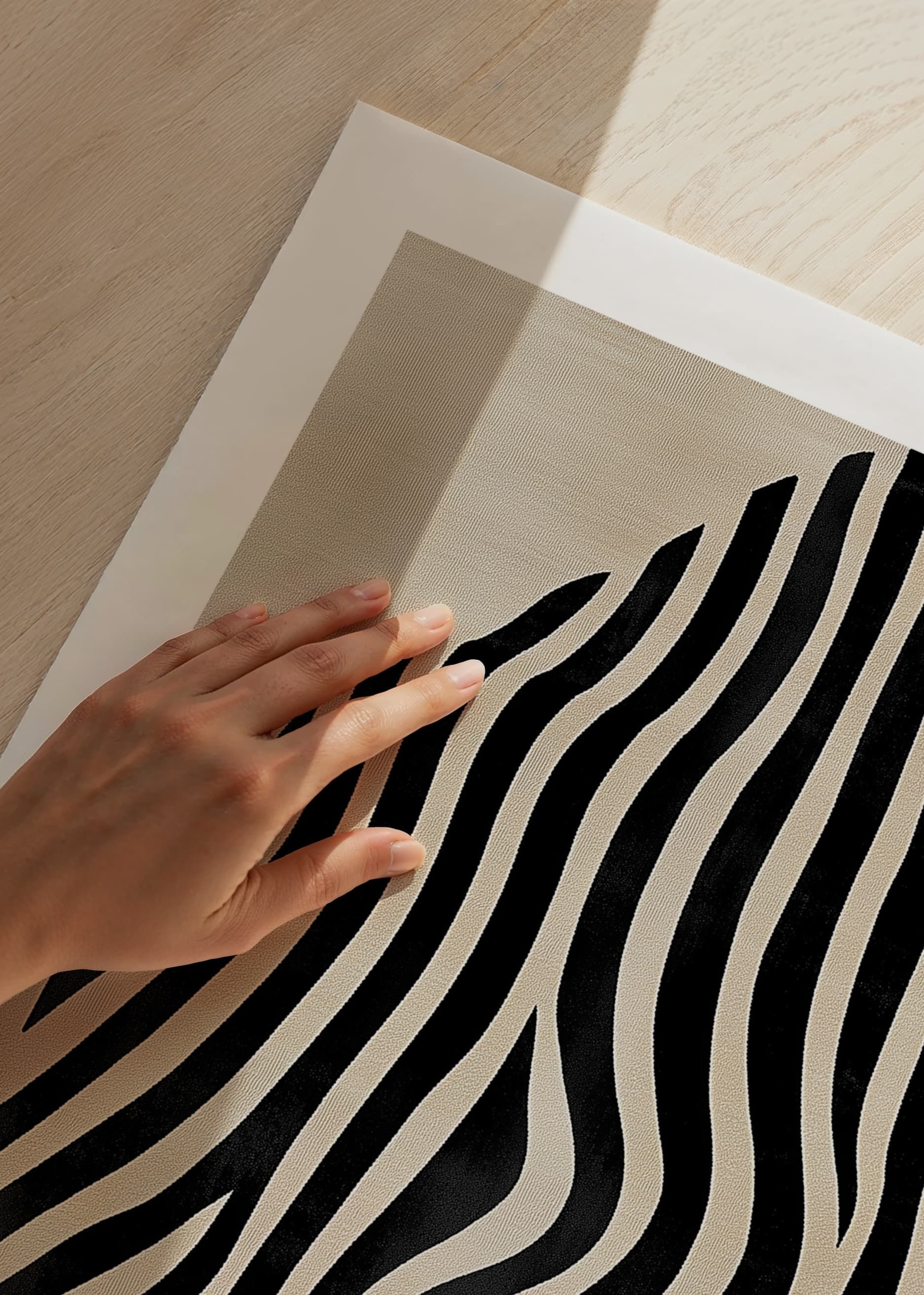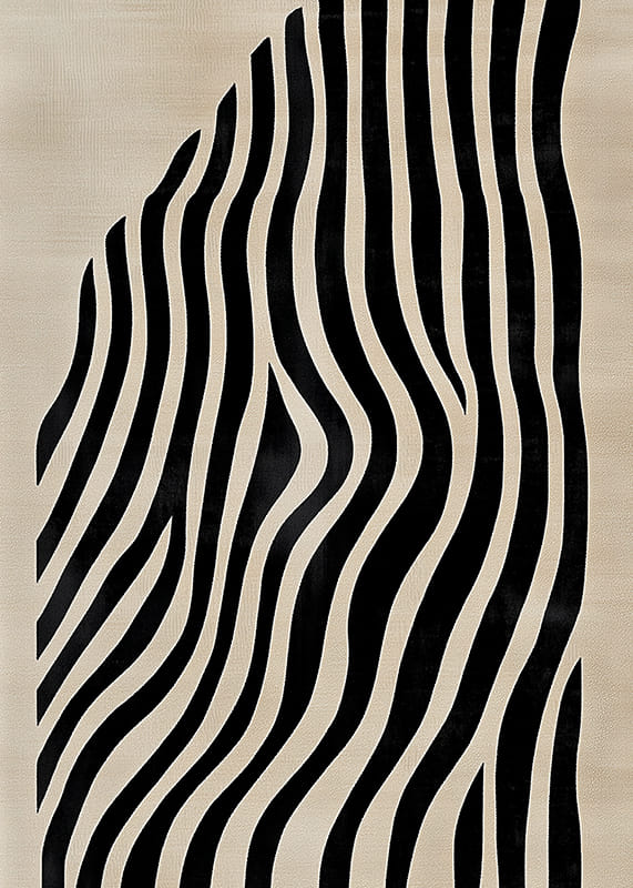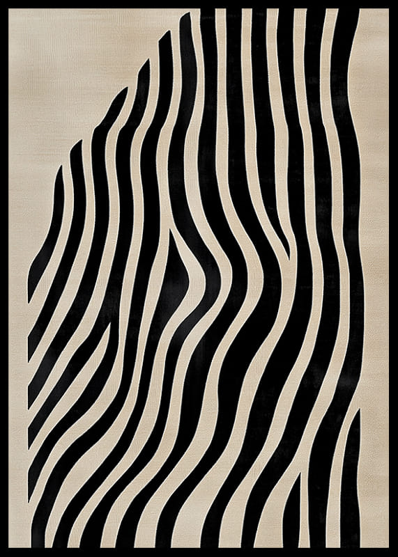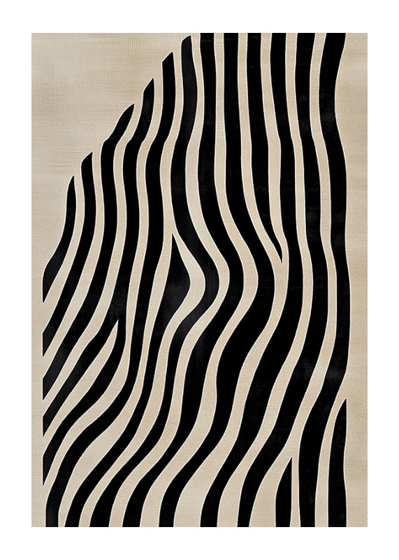 This poster captivates with its black lines that wave across a soft beige background, creating an illusion of movement and balance. The contrasting simplicity creates a visual fascination that immediately captures the attention.