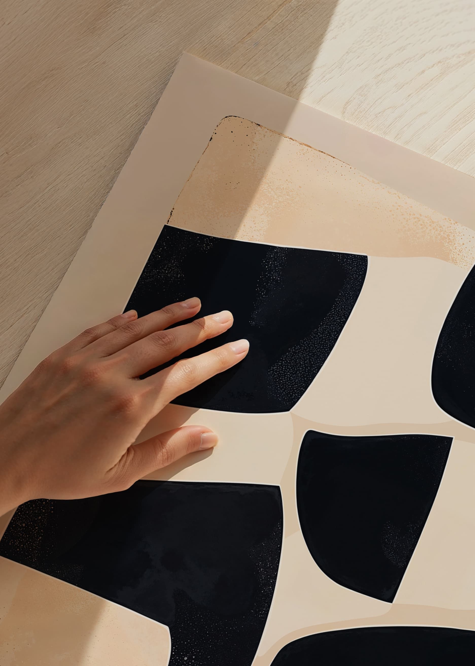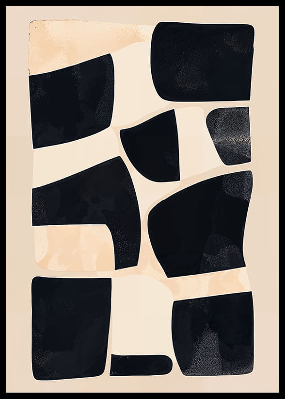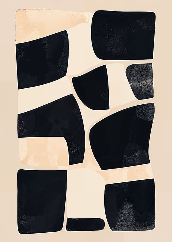 This poster catches the eye with its black and white geometric shapes that seem to float in perfect balance. The soft curves against the light background create a sense of sophistication and calm.