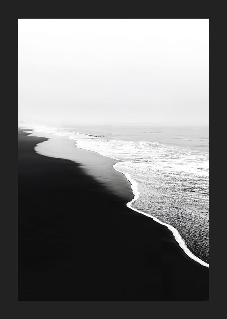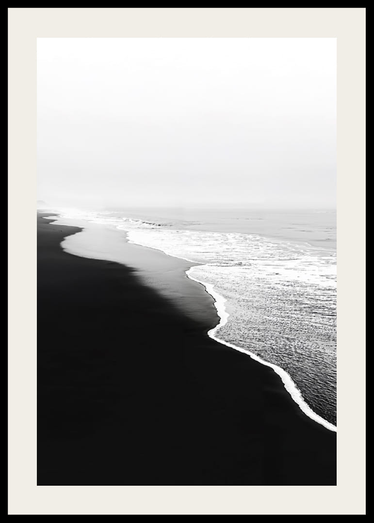 A visually striking poster that captures the contrasts between the black sand beach and the foamy white waves of the ocean. It is an image of stillness and movement, where the elements meet in a harmonious dance.