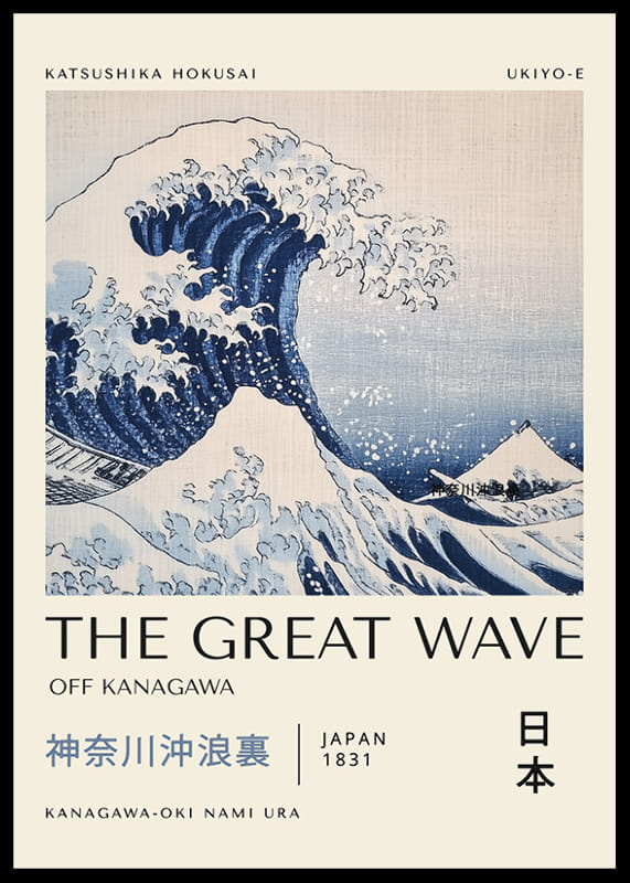 This poster, with its iconic image of the Great Wave off Kanagawa, expresses both the beauty and power of nature. The dynamic motif combines deep blue tones with elegant, undulating lines that convey movement and drama.
