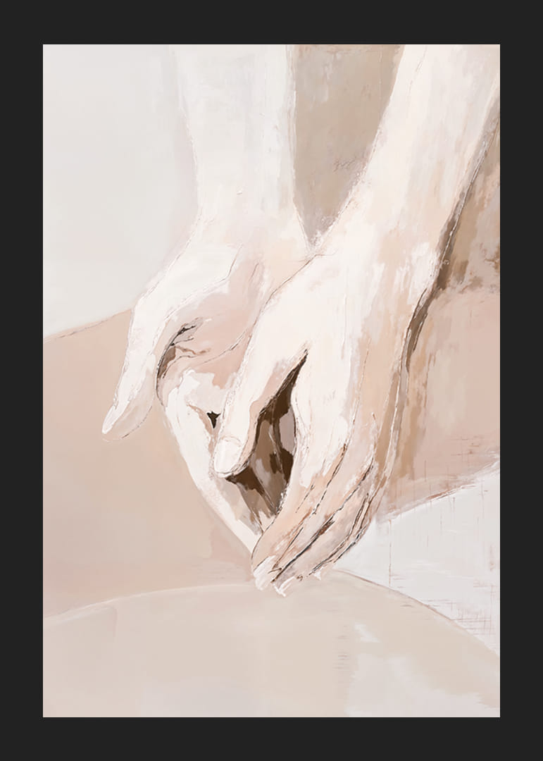 The feeling of peaceful closeness and harmony takes shape in this beautiful poster. The gently painted hands rest in a soothing embrace, where every line and shade gives an impression of tenderness and peace. The poster's subtle color palette enhances the feeling of calm and compassion.