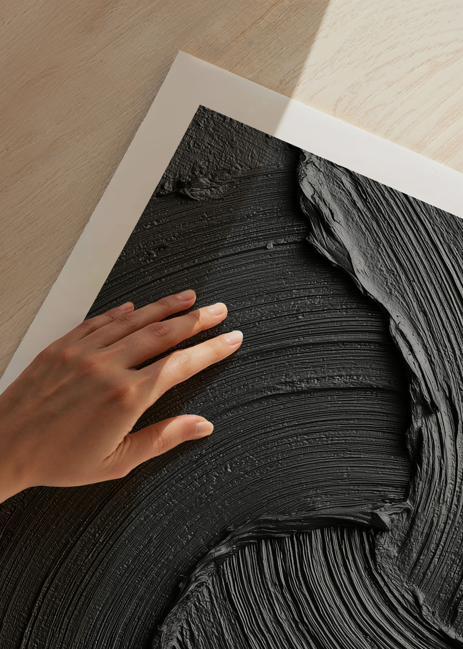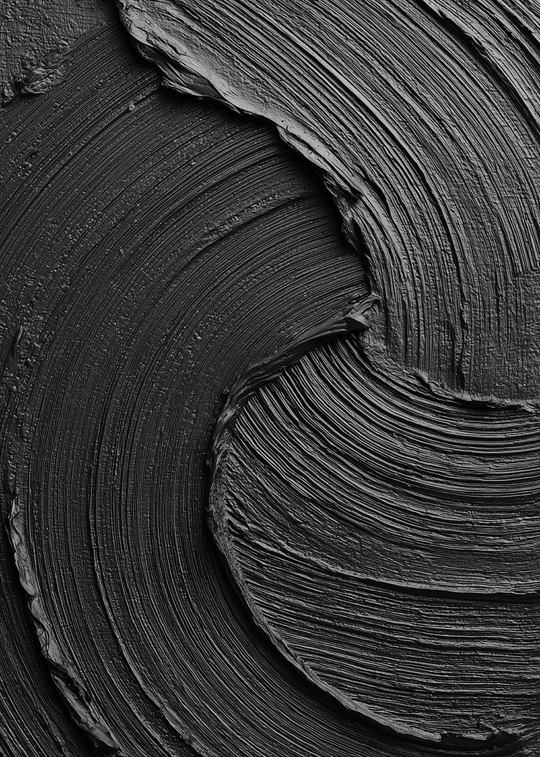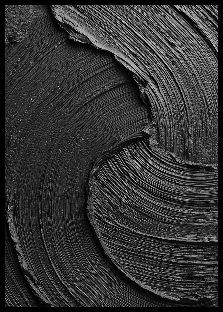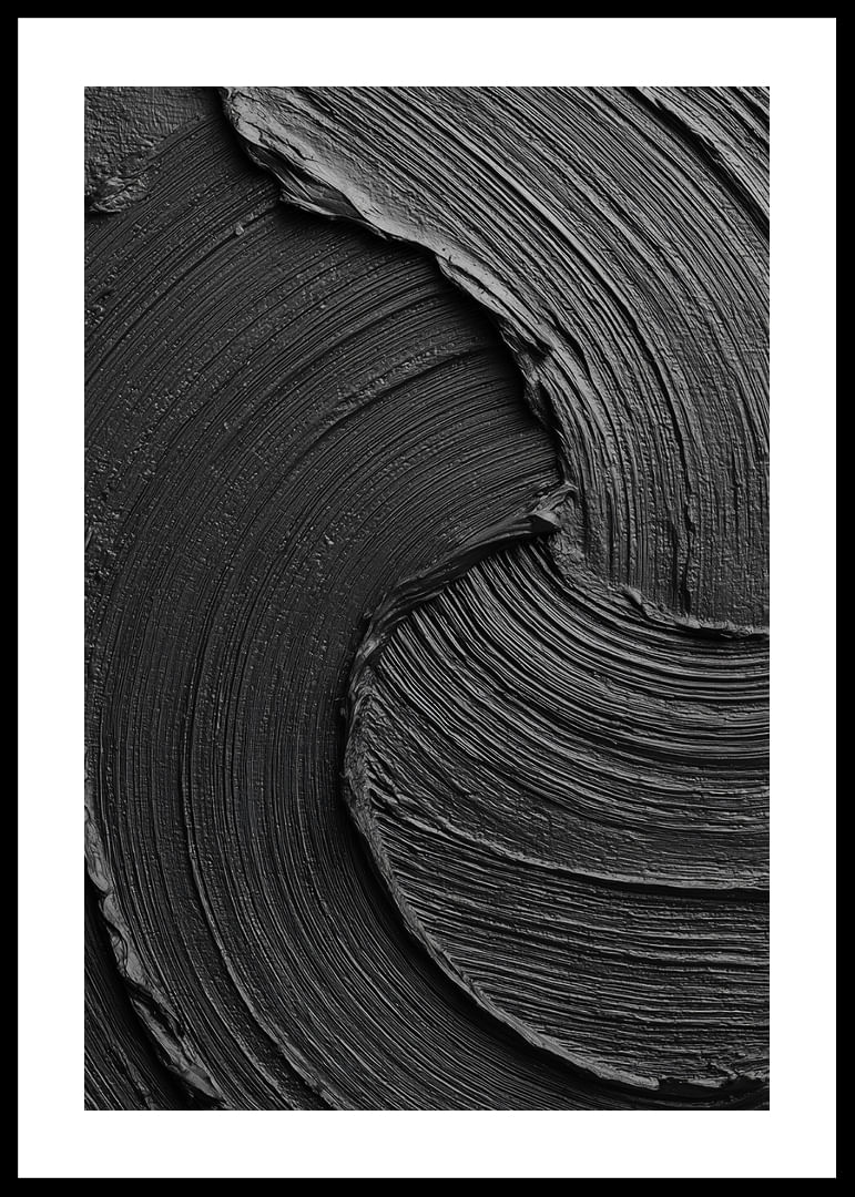 This poster catches the eye with its dark, swirling lines that dance across the surface in a hypnotic pattern. The elegant and tactile expression gives a sense of calm and style. The deep shades of black and gray create a harmonious atmosphere that lifts any room. With this poster you add a sophisticated and artistic expression to your home, perfect for the conscious interior designer.
