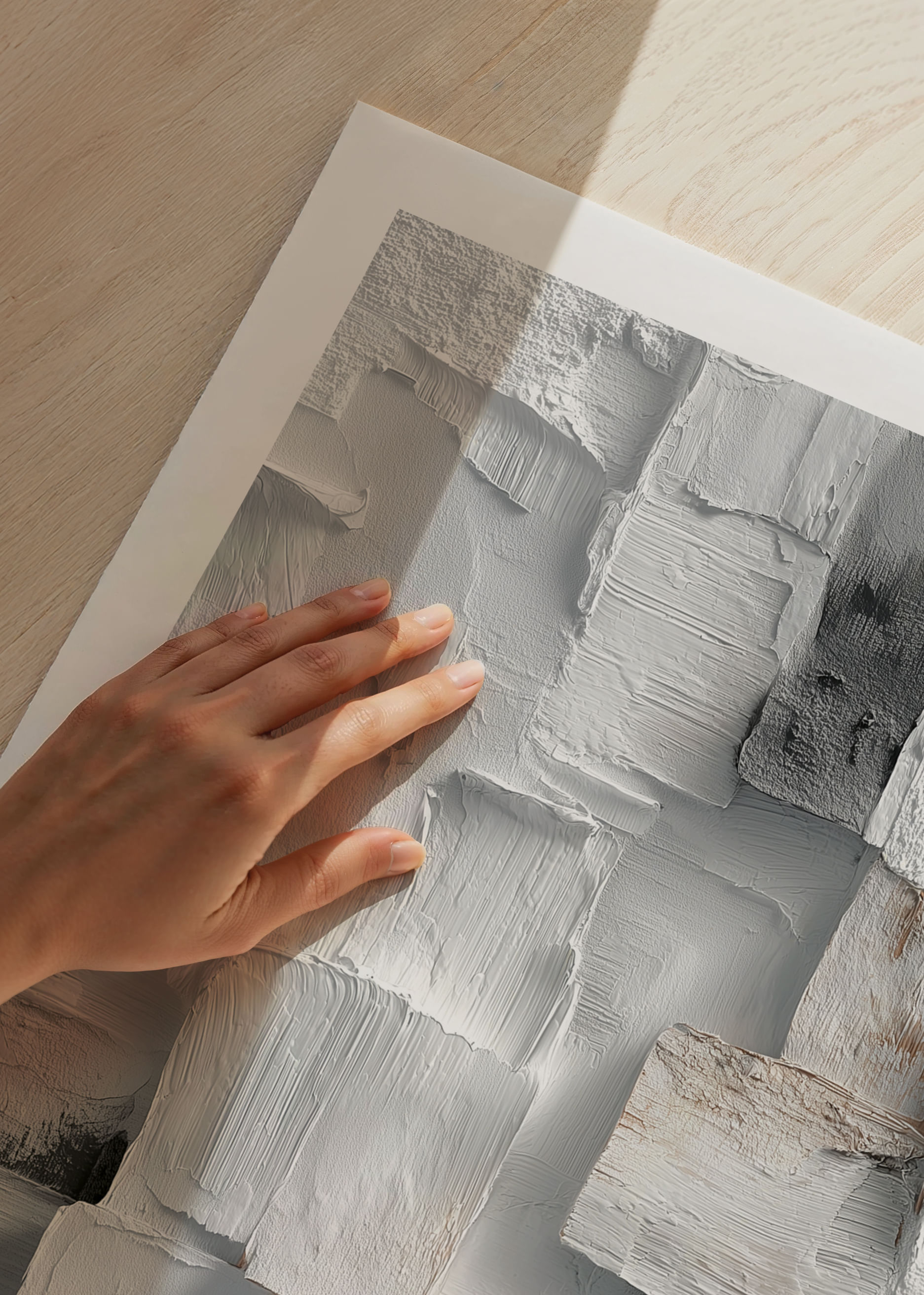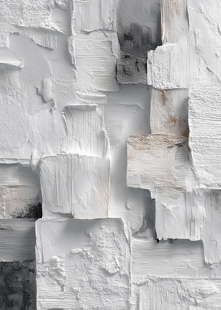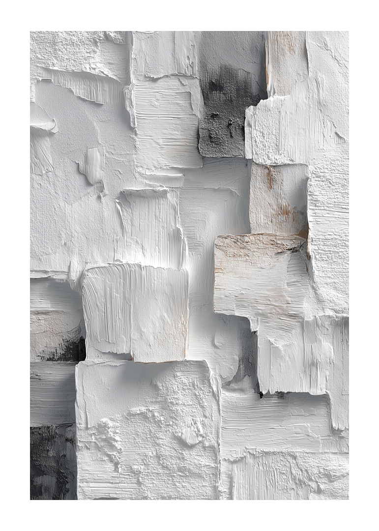 Posters with dramatic play of layers in different shades of white and grey create a fascinating depth. The brushstrokes give a sense of movement and harmony, while the varying textures play against each other in an elegant dance. This poster captures the viewer's eye and enhances the atmosphere of a room with its subtle yet powerful presence, giving a sense of timeless elegance.