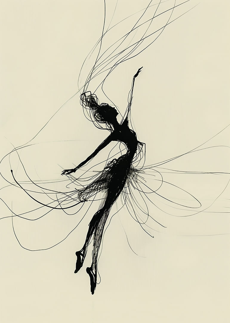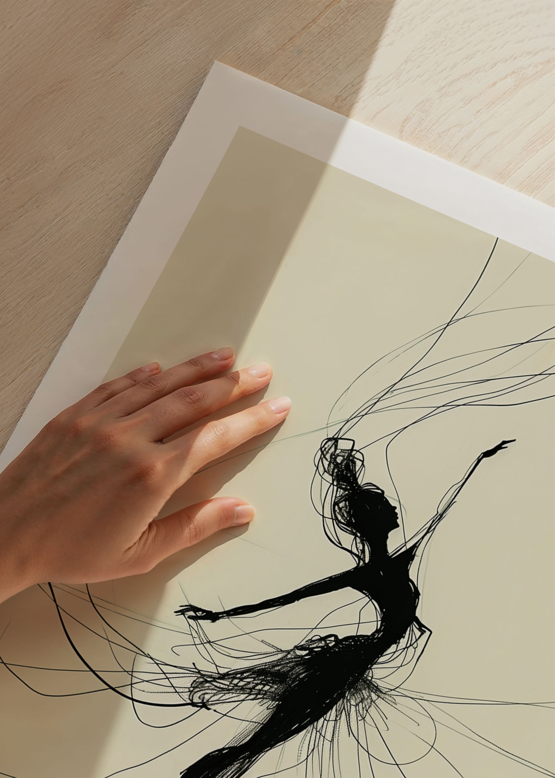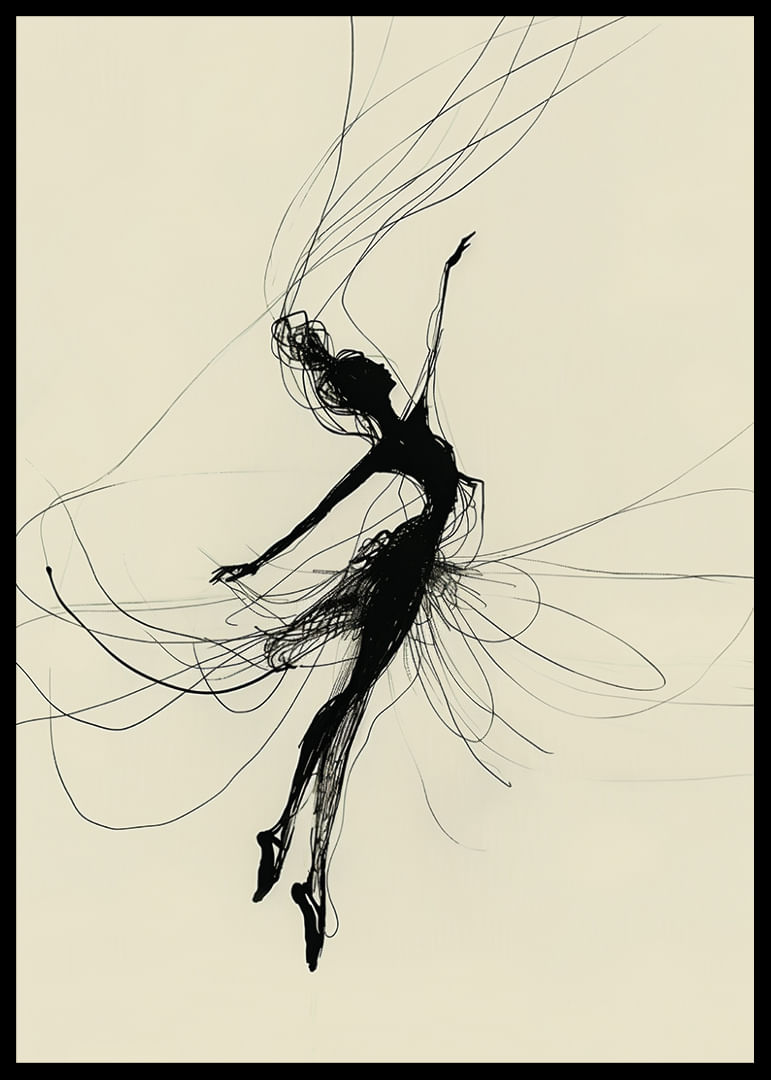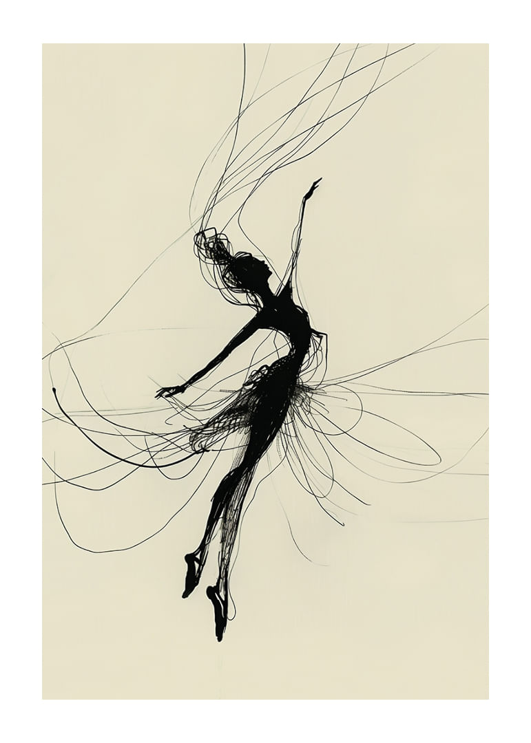 This poster captures the silhouette of a dancer in a bohemian symphony of lines and movement, with the black figure elegantly floating over a cream background. The free and fluid style of the lines gives a sense of both stillness and movement, creating a fascinating visual dynamic. The poster adds a dramatic elegance to any room, inviting the viewer to dream and be inspired by the playful energy.