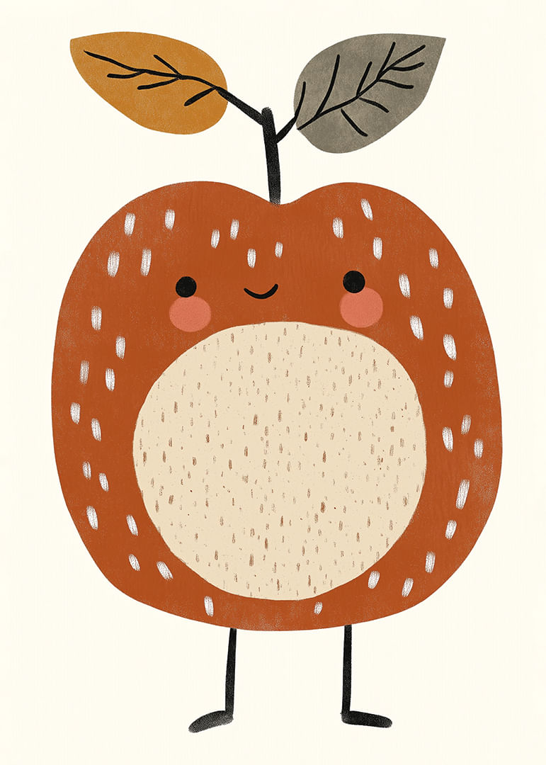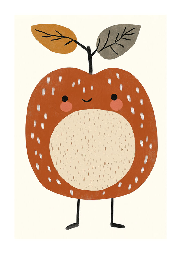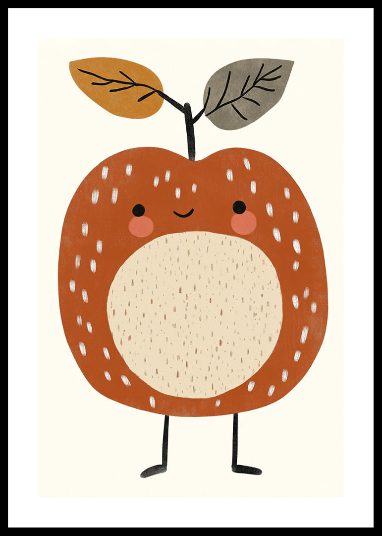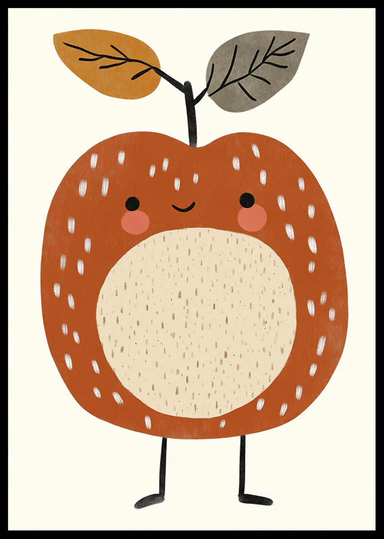 This poster captures the essence of simplicity and joy with its charming cartoon apple character. The laughing face and vibrant leaves add a sense of playfulness and warmth. Perfect for a child's room or kitchen, this poster brings an instant sense of homeliness and comfort. The soft color palette and cheerful expression make it a natural and inviting detail in any room.