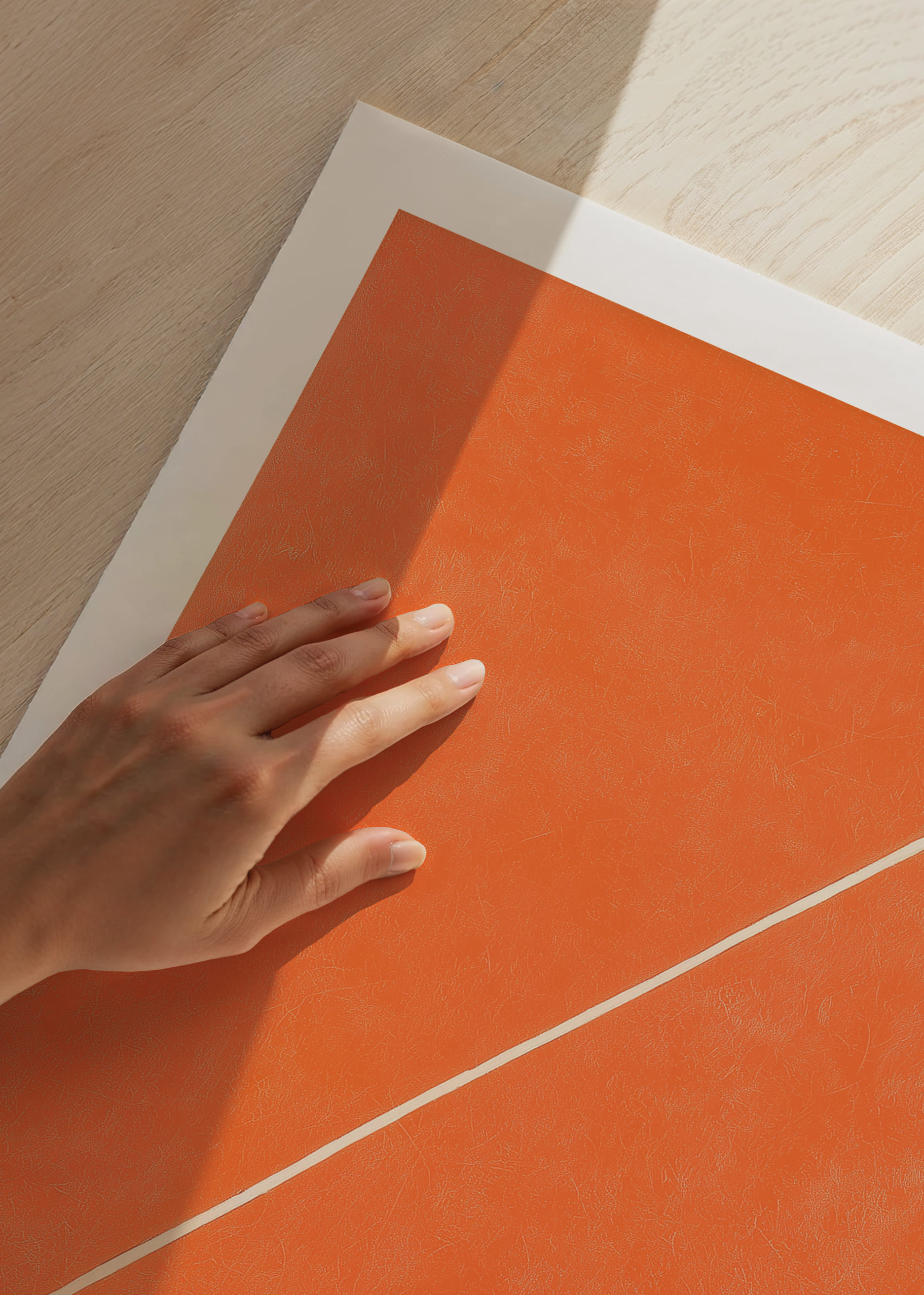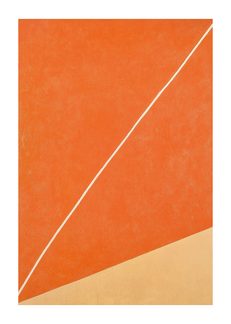 This poster immediately catches the eye with a powerful diagonal line that cuts through a vibrant orange background. The bold color contrast between orange and beige gives a noticeably modern feel. The pure simplicity and harmony of the lines create a dynamic impression that adds energy to any room. By hanging this poster in your home, you will get an inspiring mood and visual focus.