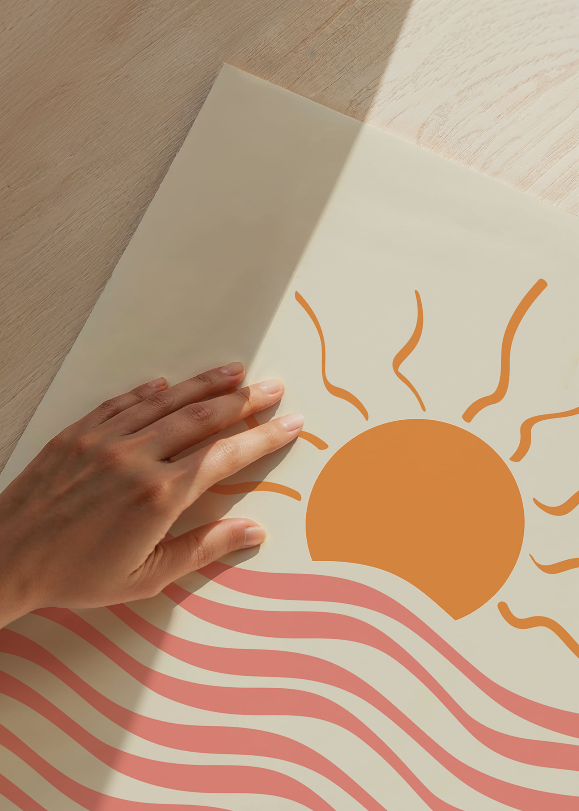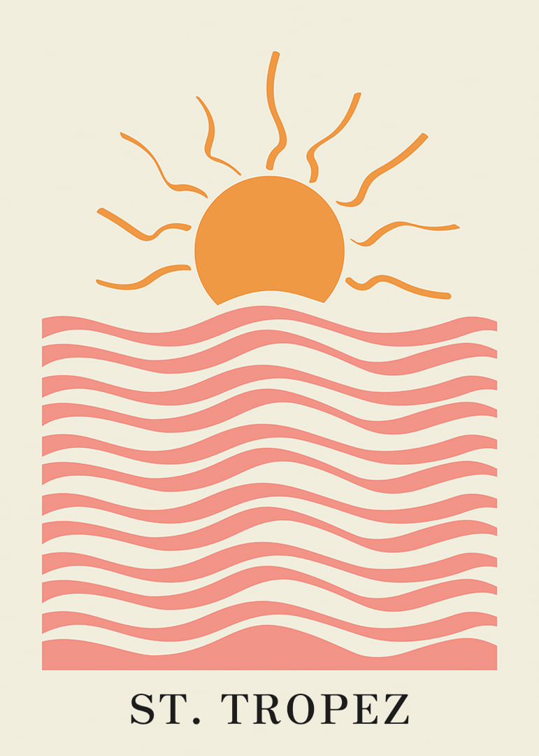 The light from the golden sun on the poster spreads a warm glow and evokes feelings of summer and tranquility. The soft lines of the waves create a harmonious movement that enhances the relaxing atmosphere. This poster transforms any room into a peaceful oasis filled with holiday dreams and the beauty of the beach, providing a constant reminder of the soothing rhythm of the sea.