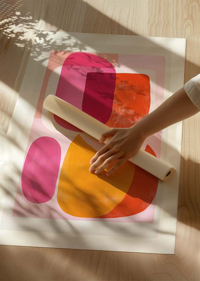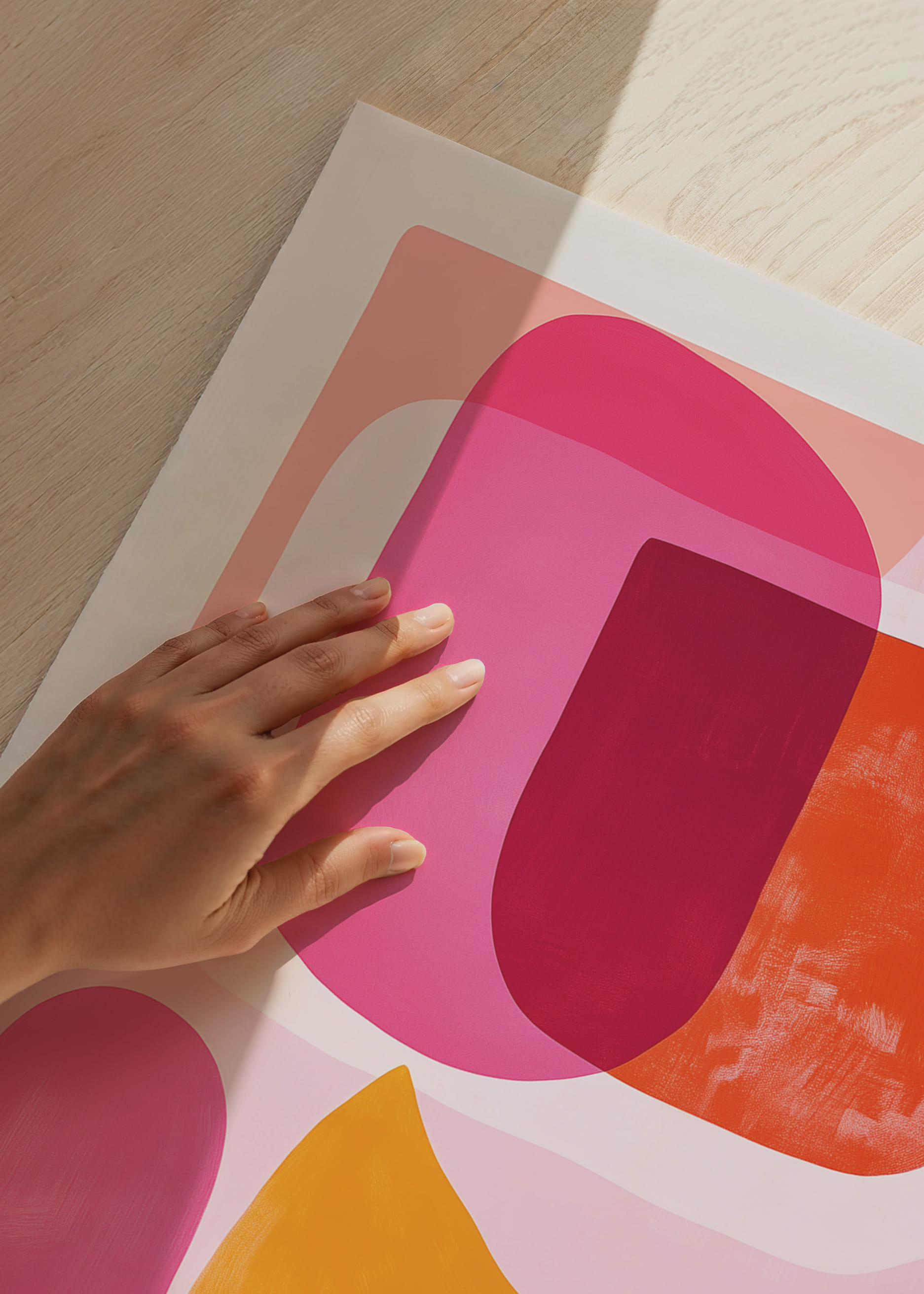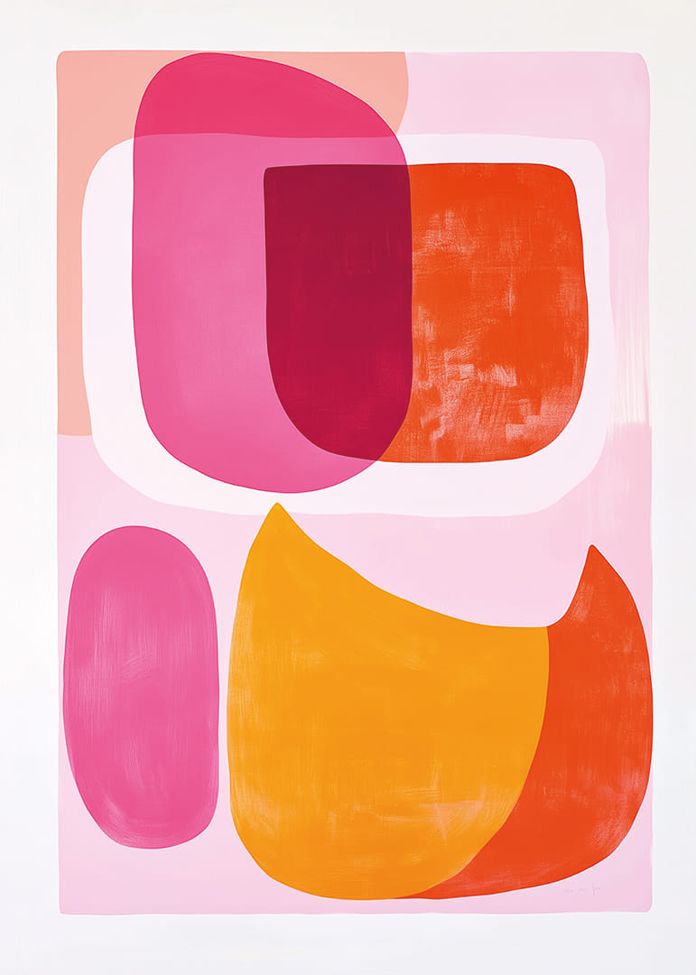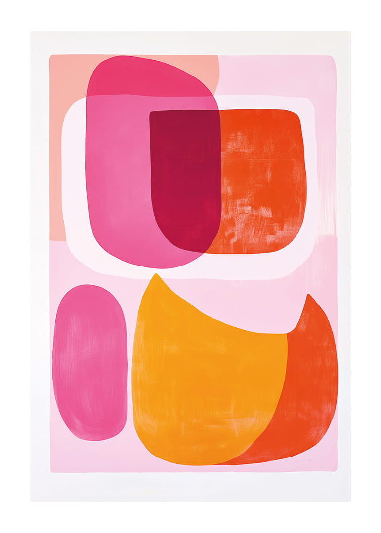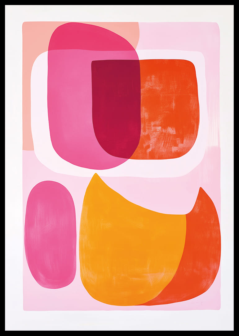 Discover the power of this poster that brings together a kaleidoscope of pink and orange tones, whose vibrant shapes dance harmoniously across the surface. The dynamic meeting of color fields creates a feeling of joy and energy. This artwork transforms any room into a place of inspiration and vibrancy, where the expressive energy of the poster enhances the home with style and presence.
