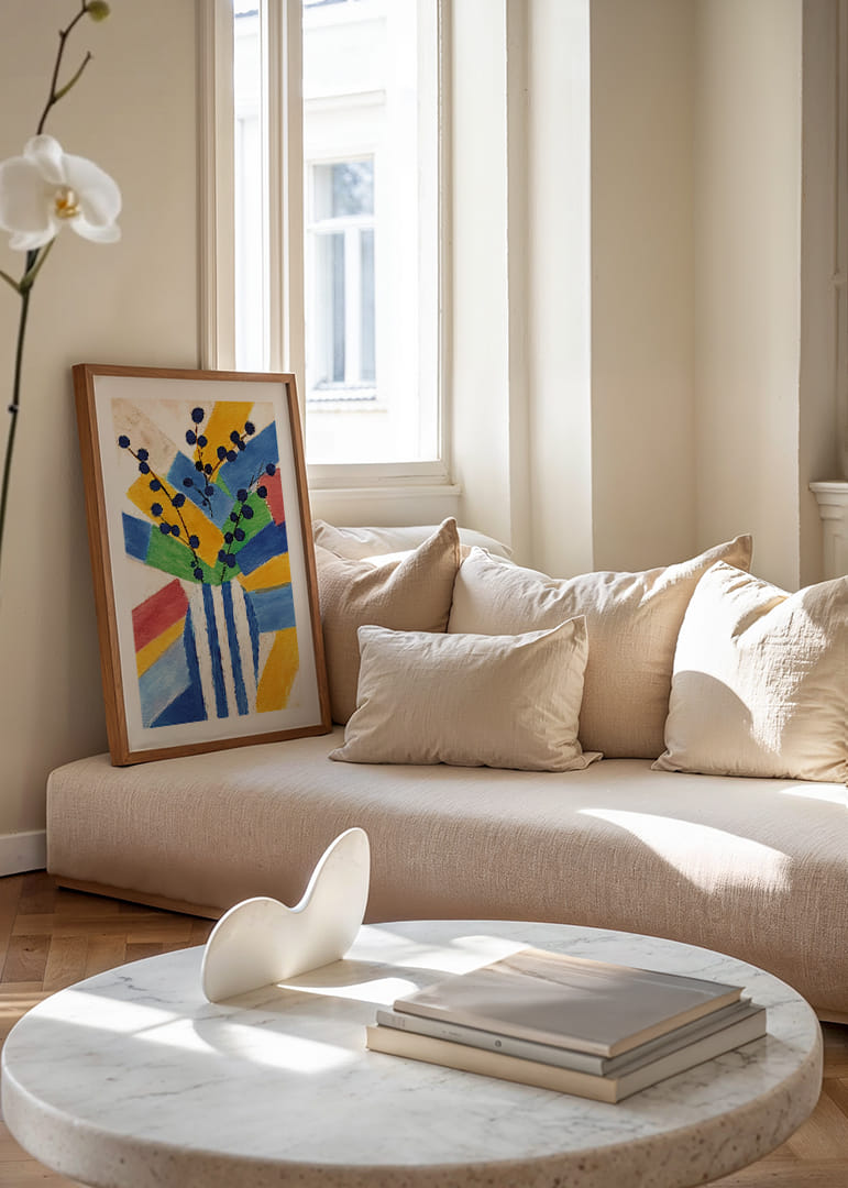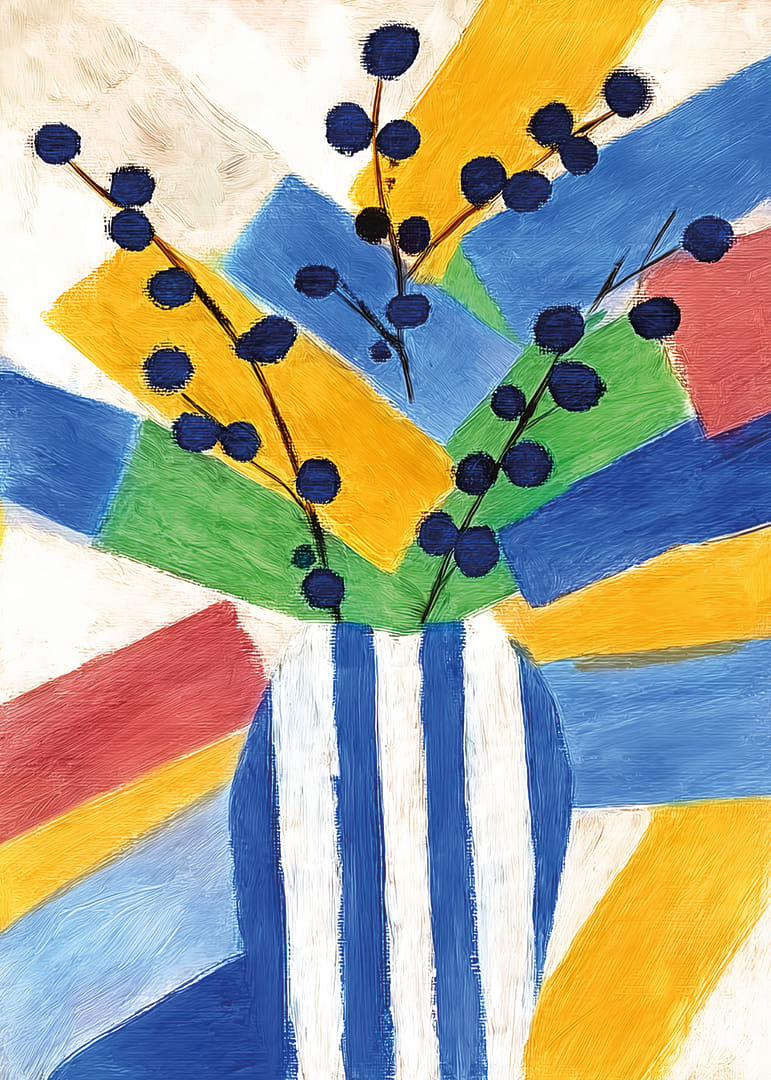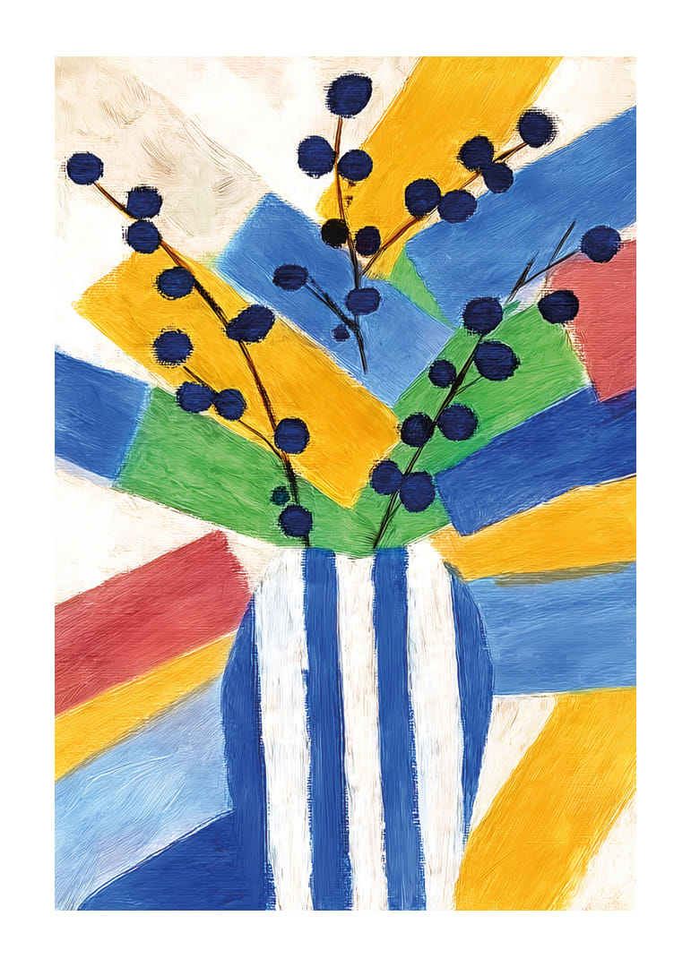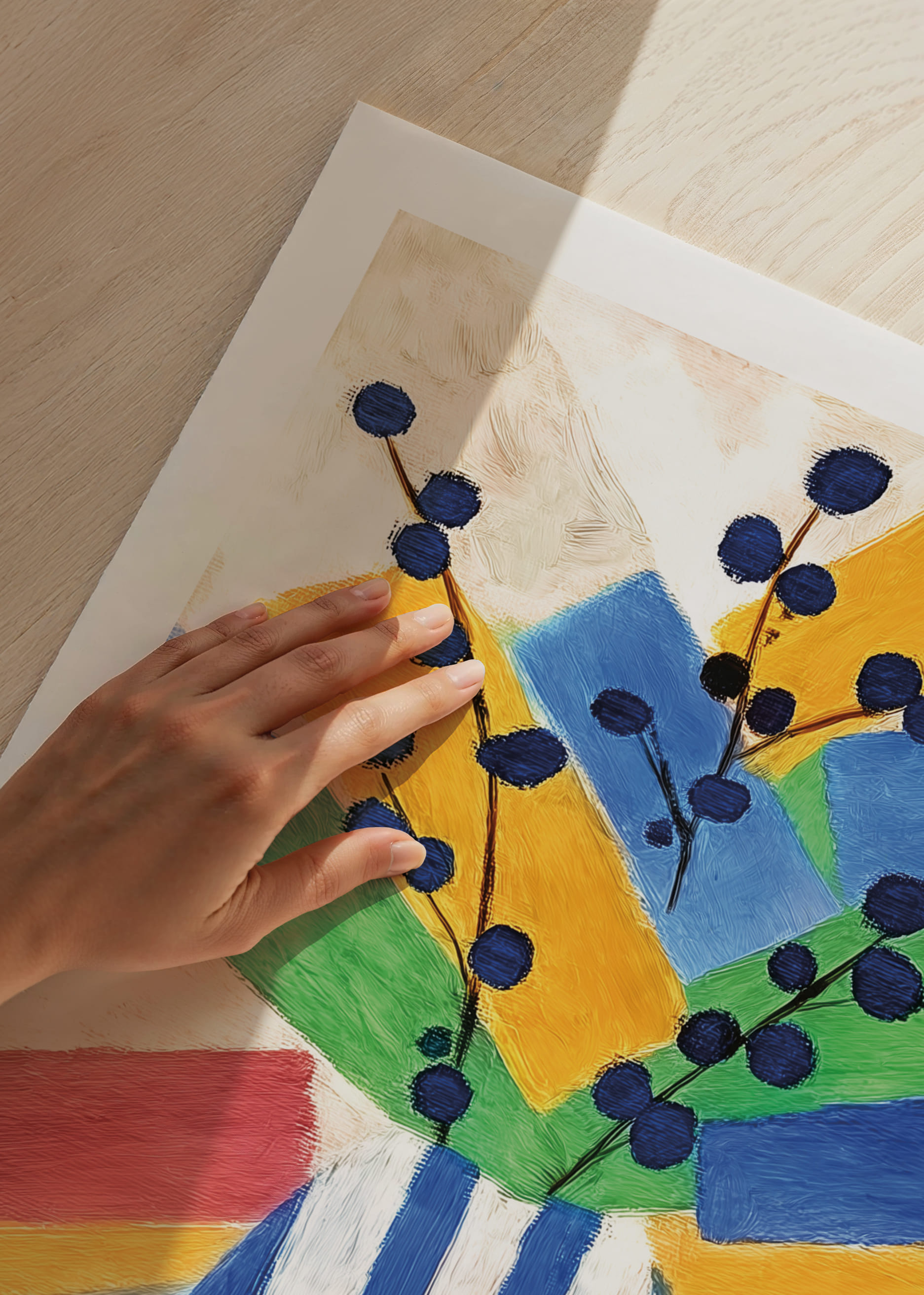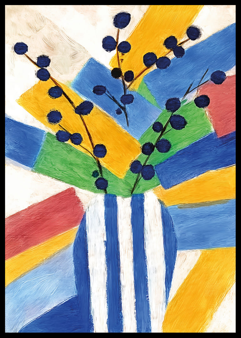 This poster immediately catches the eye with its vibrant colors and bold geometric shapes. The blue and yellow hues harmonize elegantly with the bold black lines, creating a dynamic and uplifting feel. This poster will enhance the atmosphere of any room with its artistic charm and energy, adding a modern touch to your home.