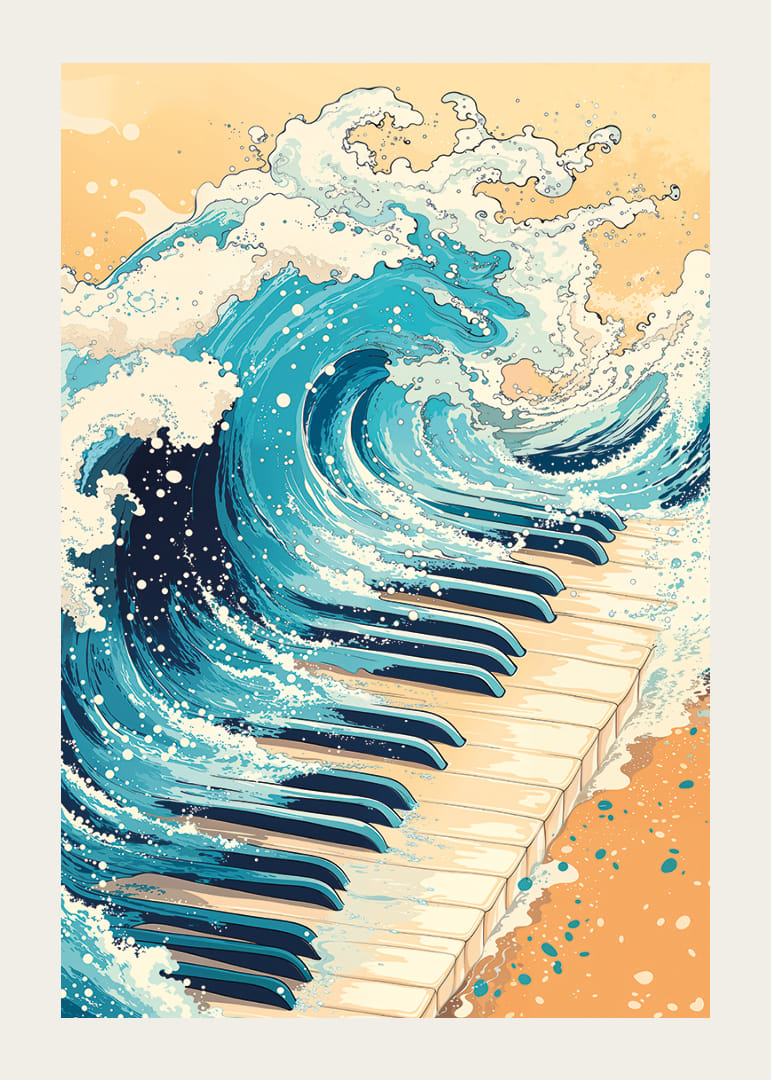 This poster captures the moment when the powerful waves of the ocean dance across the piano keys, creating a symphony of both visual and musical beauty. The shimmering blue-green waves give a sense of movement and energy, while contrasting harmoniously with the crisp white and black keys. A poster that brings both calm and drama to any room, deepening the atmosphere.