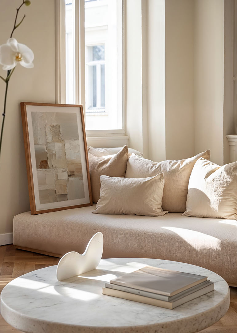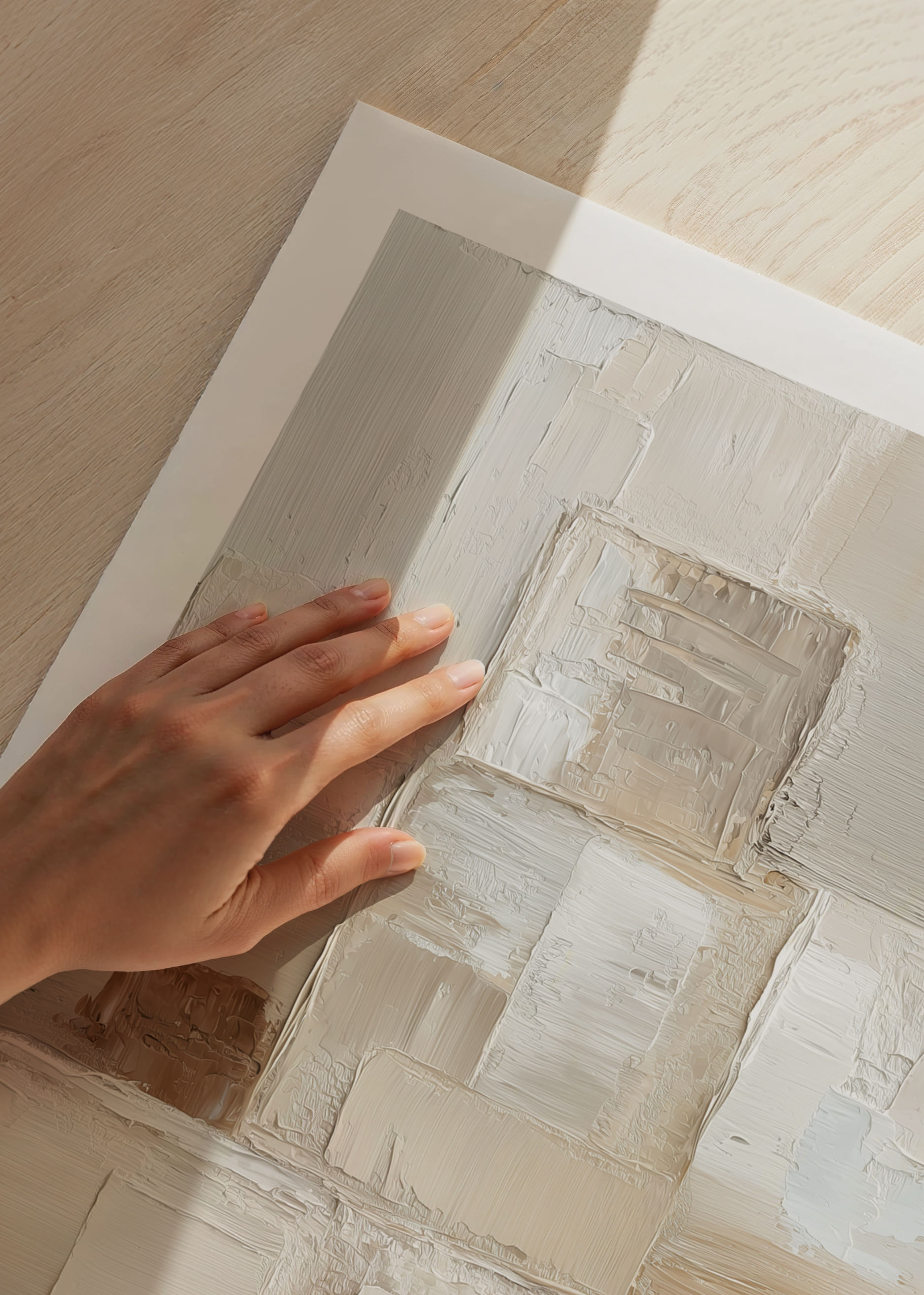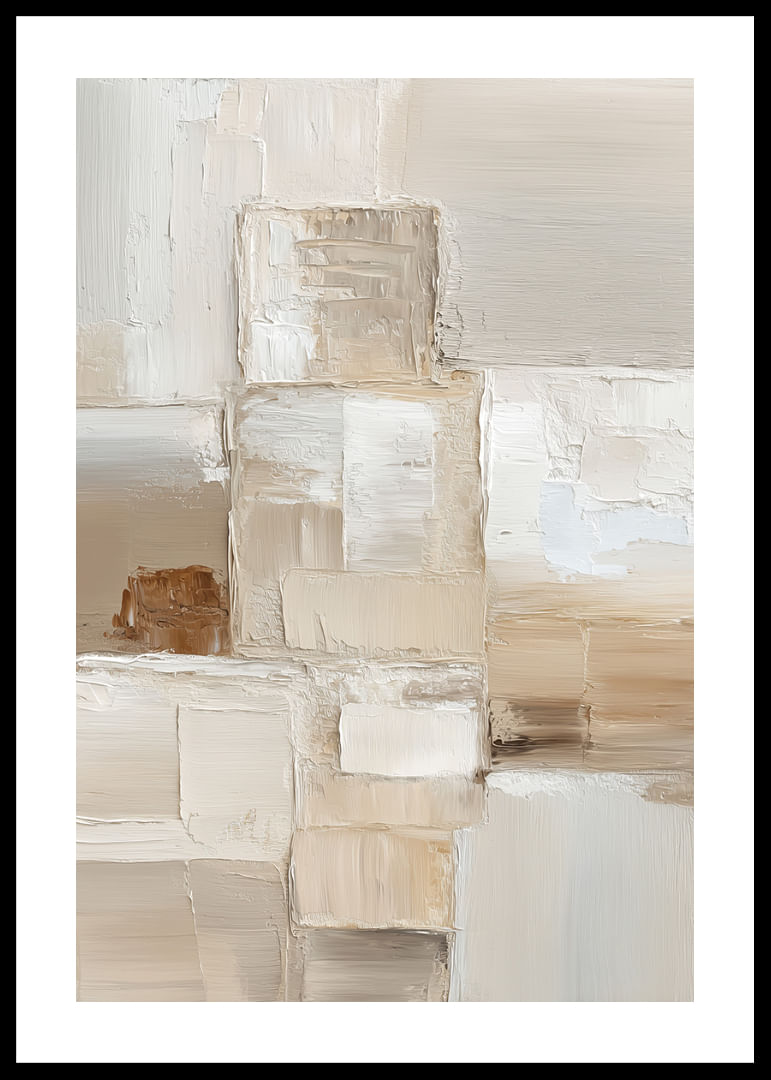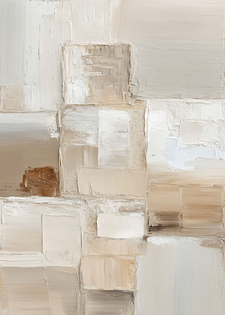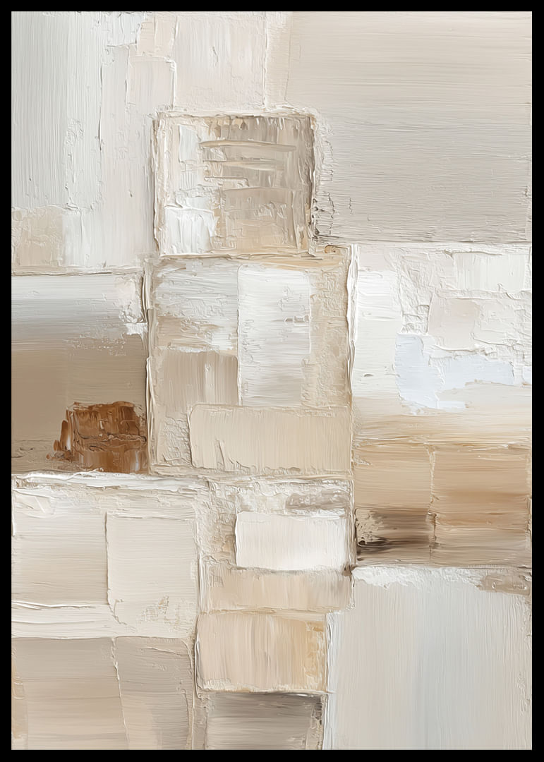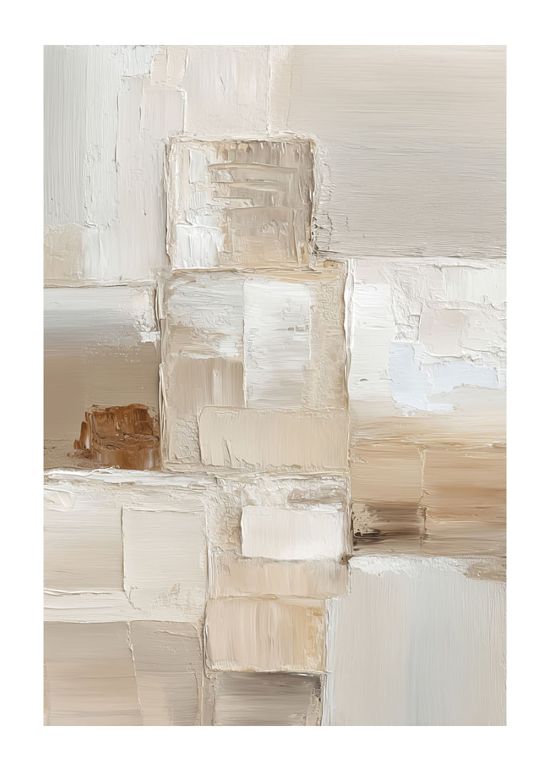 This poster catches the viewer's eye with its subtle shades of beige and white in an abstract composition of rectangles and squares. The oil-painted texture provides a tactile feel that adds depth and elegance to the room. This harmonious blend of soft colors and geometric shapes creates a calming atmosphere, making the poster a perfect addition to a modern living room.