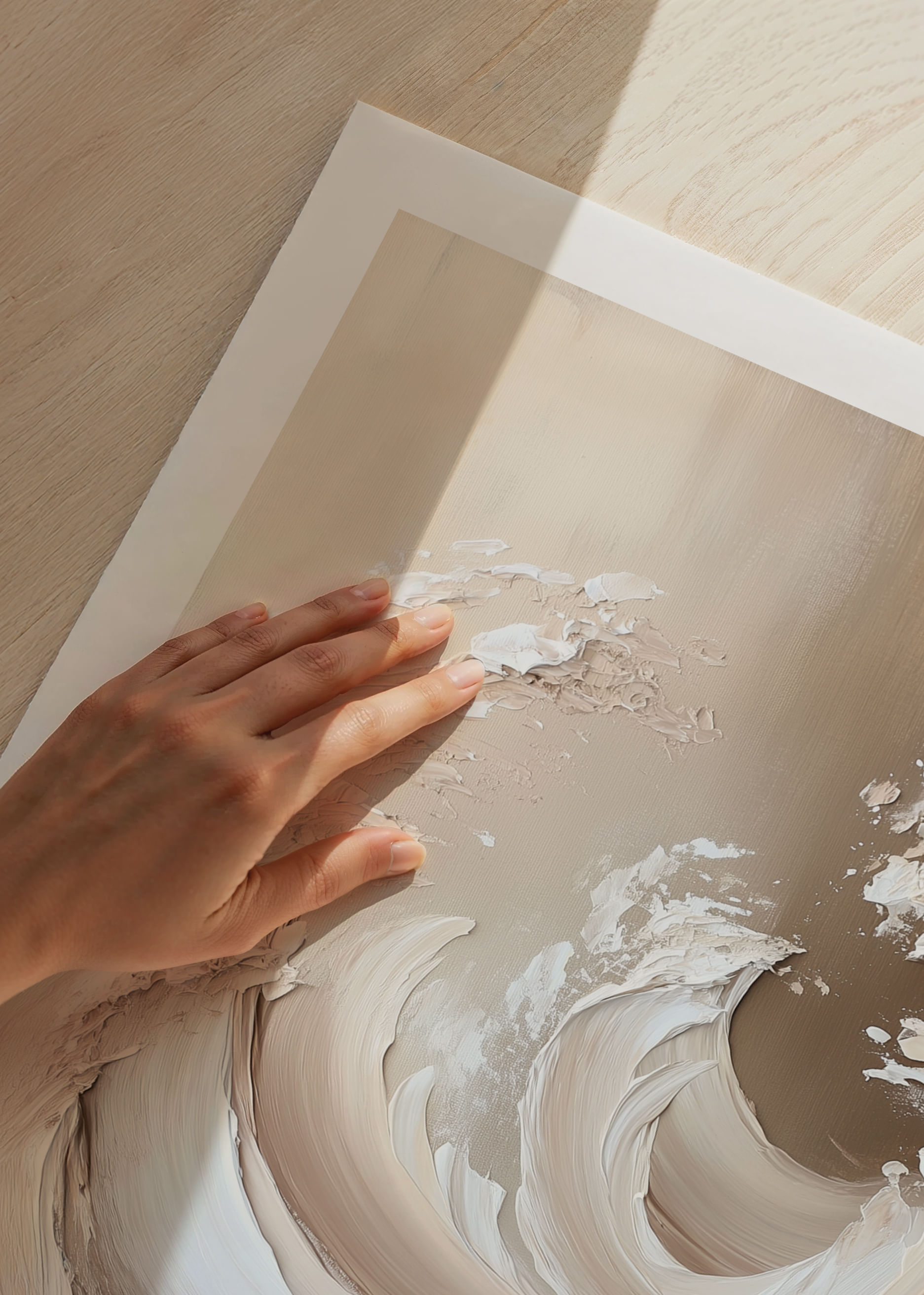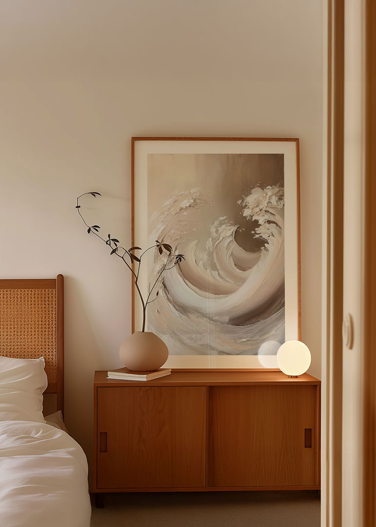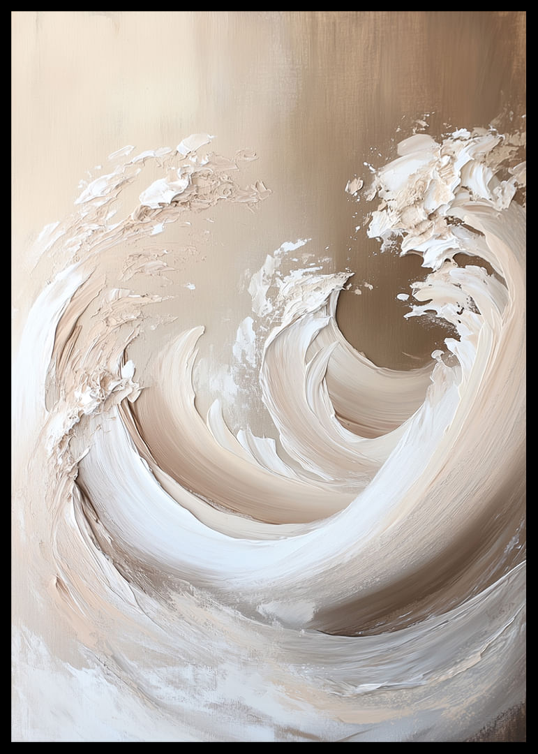 With an instantly inviting feel, this poster captures ethereal waves in soft earth tones. They sweep like a harmonious flow of water and sand, while each brushstroke breathes life and movement. This poster transforms any room into a peaceful oasis, filled with elegance and tranquility, creating an atmosphere that promotes calm and meditation in everyday life.